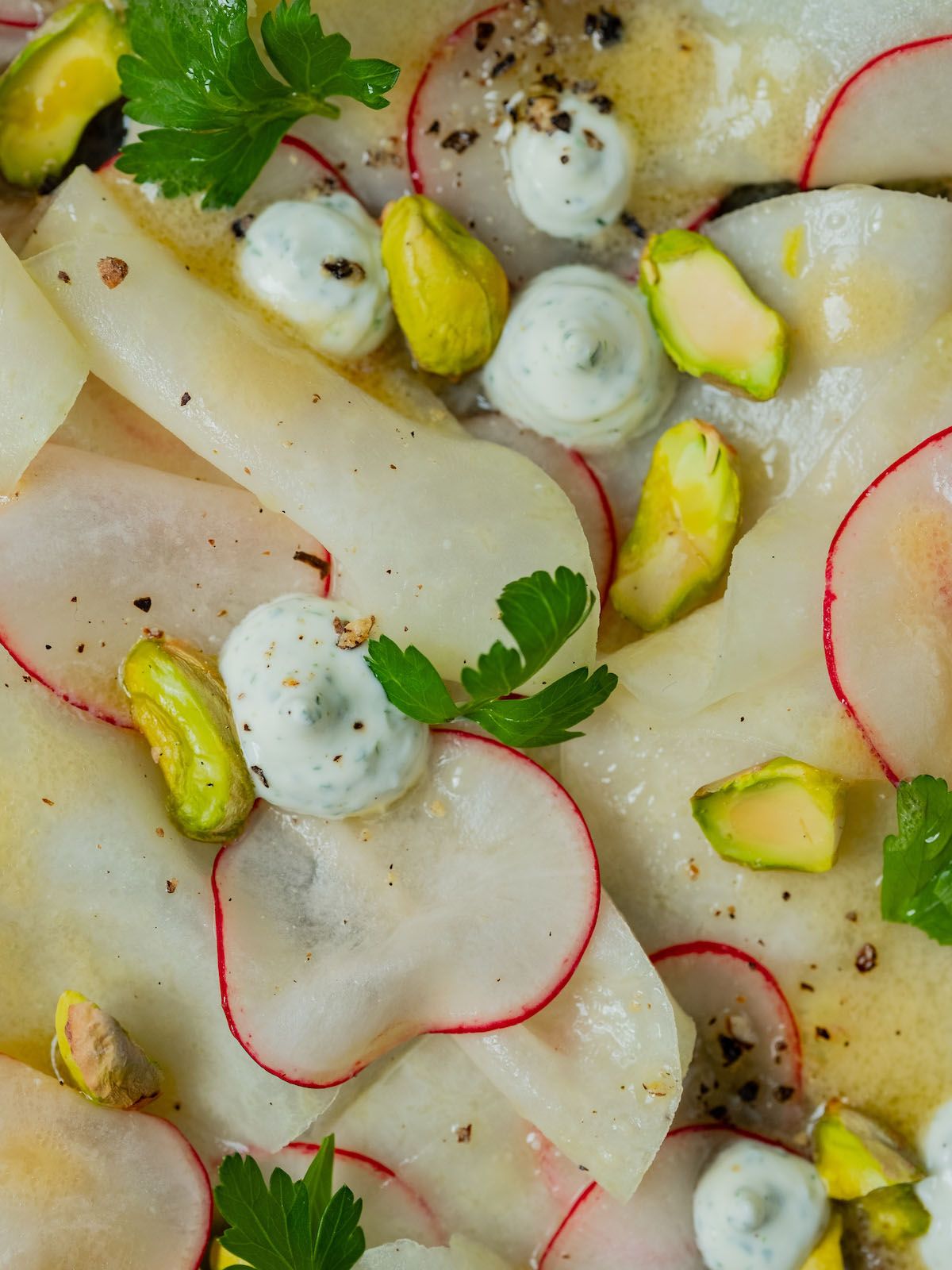 habe ich unter anderem ein Kohlrabi Carpaccio mit Pistazien, Radieschen, einem Petersilien-Schmand und einem Miso-Zitronen-Dressing. Das Gericht ist nicht nur leicht, sondern auch geschmacklich und texturell aufregend. Knackig trifft auf cremig und sauer auf salzig. Wer es ganz genau wissen will, wie das Gericht zubereitet wird, sollte in den nächsten Tagen die Augen aufhalten und auf dem Blog vorbeischauen.