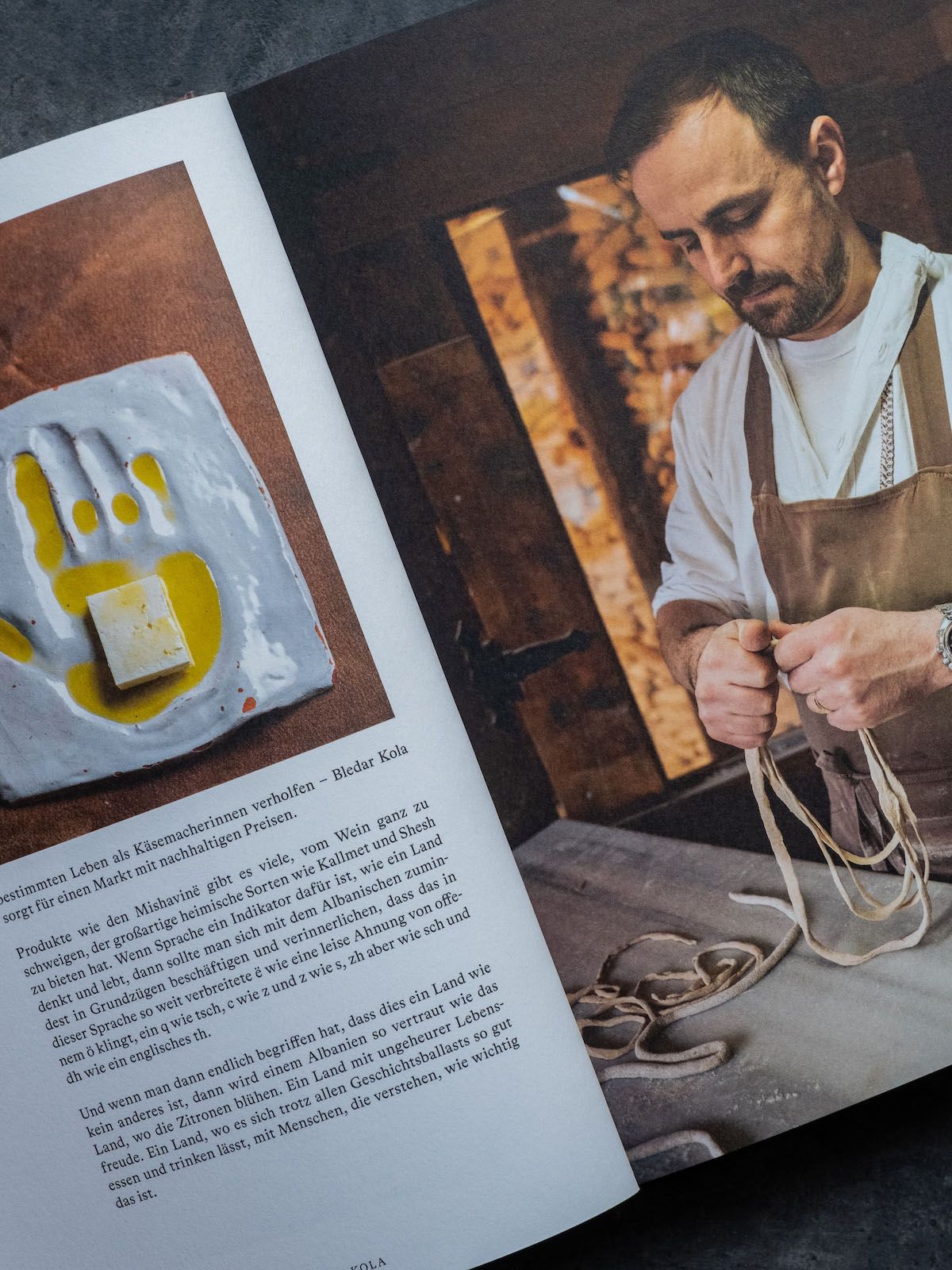 Das kürzlich erschienene Buch mit Bildern von Manuel Krug und Texten von Ursula Heinzelmann gibt einen Einblick in das Leben und Arbeiten von Bledar Kola. Der in Albanien geborene und aufgewachsene Sohn eines Lehrers und einer Hausfrau sieht schon mit fünfzehn keine Zukunft mehr in seinem Heimatland und zieht zu seiner Schwester nach Turin. Von dort aus geht es weiter zu seinem Bruder nach London, wo er, angefangen als Tellerwäscher, über Stationen als Küchenhilfe, einer Kochausbildung und verschiedenen Stationen in unterschiedlichen Küchen Londons seine ersten beruflichen Schritte geht.