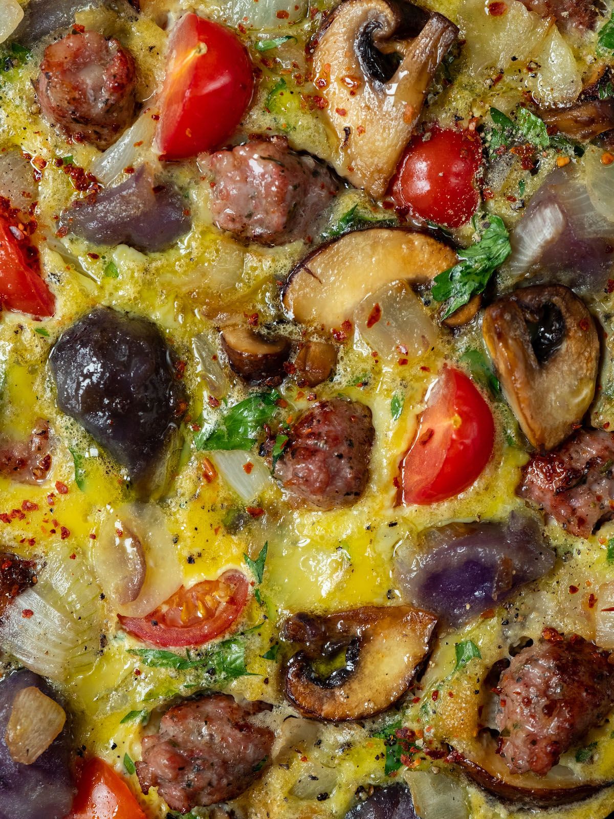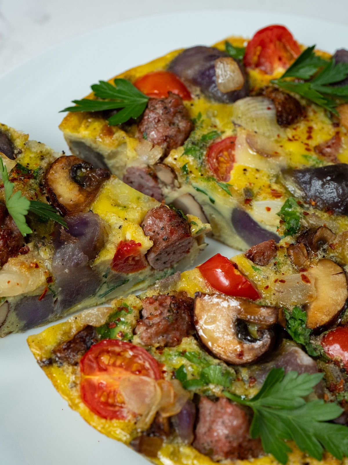 habe ich so einiges. Unter anderem meine Variante einer spanischen Tortilla mit lila Kartoffeln, Kräuterbratwurst, Zwiebeln, Knoblauch, Cherrytomaten und Champignons. Definitiv eines der besten Rezepte, um Reste zu verwerten und etwas besonders Leckeres daraus zuzubereiten. Aus ein paar Eiern und Gemüse, Fleisch, Fisch, Käse und Kräutern nach Lust und Laune. Und fertig ist die Leckerei. Das komplette Rezept erscheint diese Woche noch auf dem Blog.