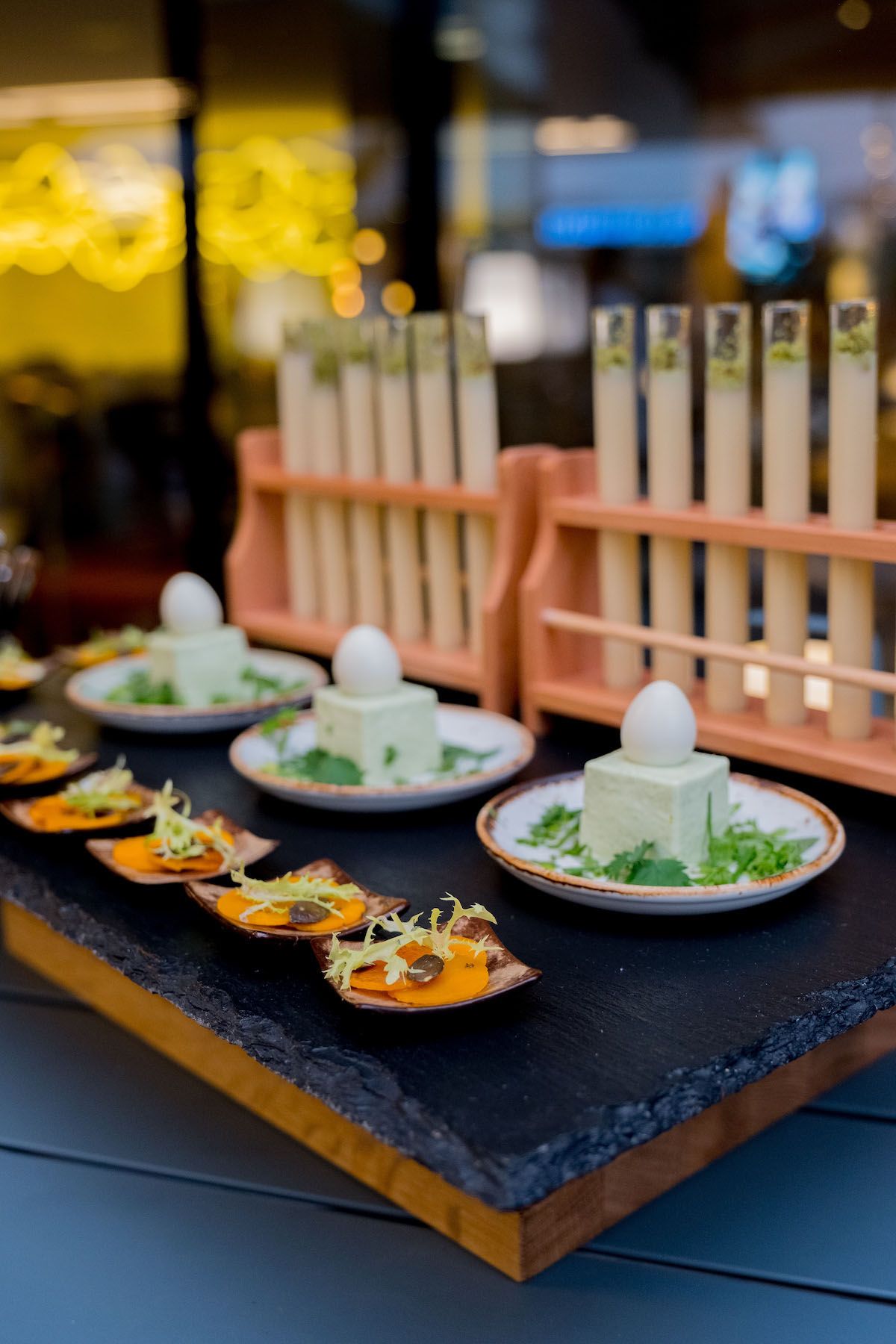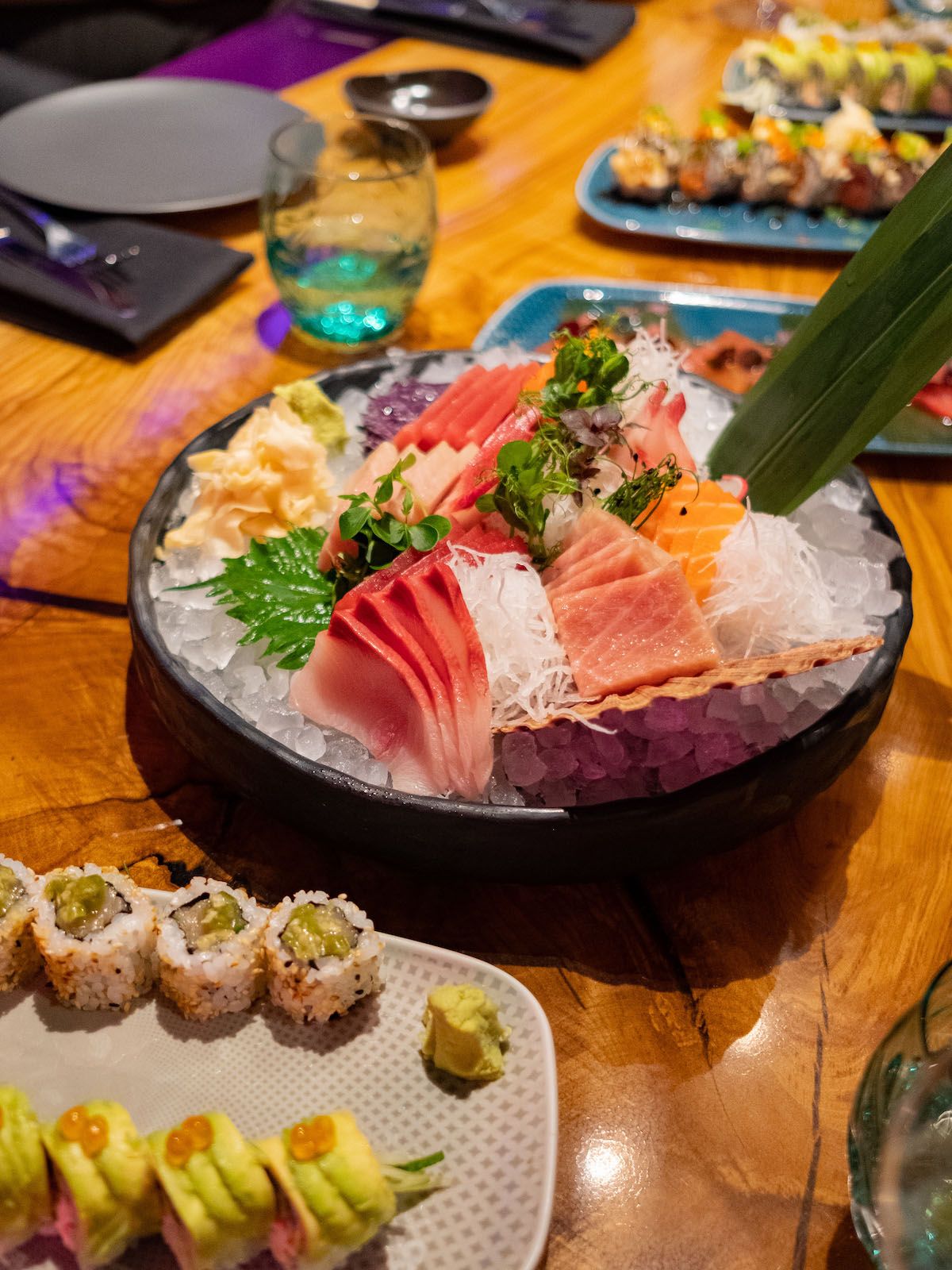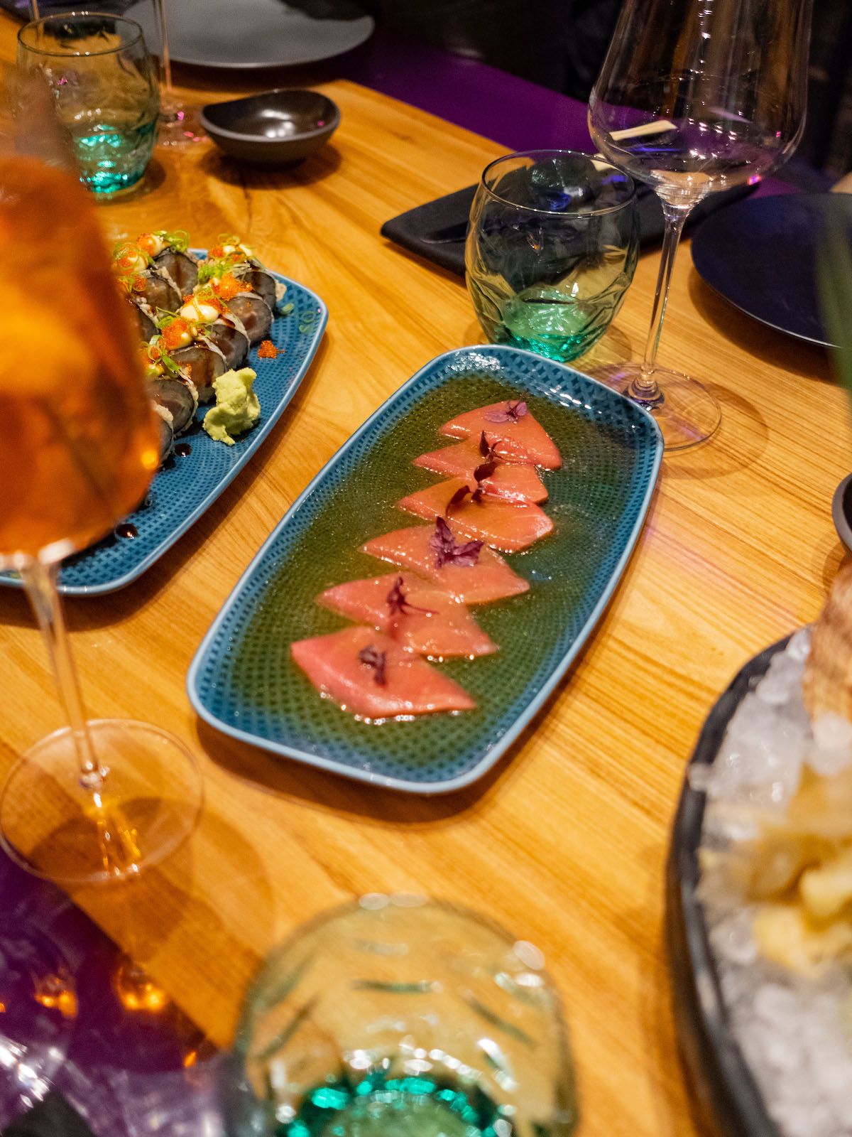 Die Auswahl der Speisen reicht von Sashimi, Sushi, Poké, Tataki, Nigiri und diversen Rolls bis hin zu verschiedenen Bowls, Tempura und Karaage Spezialitäten und einer Auswahl an Gemüsen, Pilzen, Fisch, Meeresfrüchten und Fleisch vom Grill. Abgeschlossen wird die sehr stimmige Selektion von einigen Desserts und einer großen Auswahl an Weinen, Champagnern, Sake, Bieren, diversen Cocktails und natürlch verschiedenen Softdrinks.