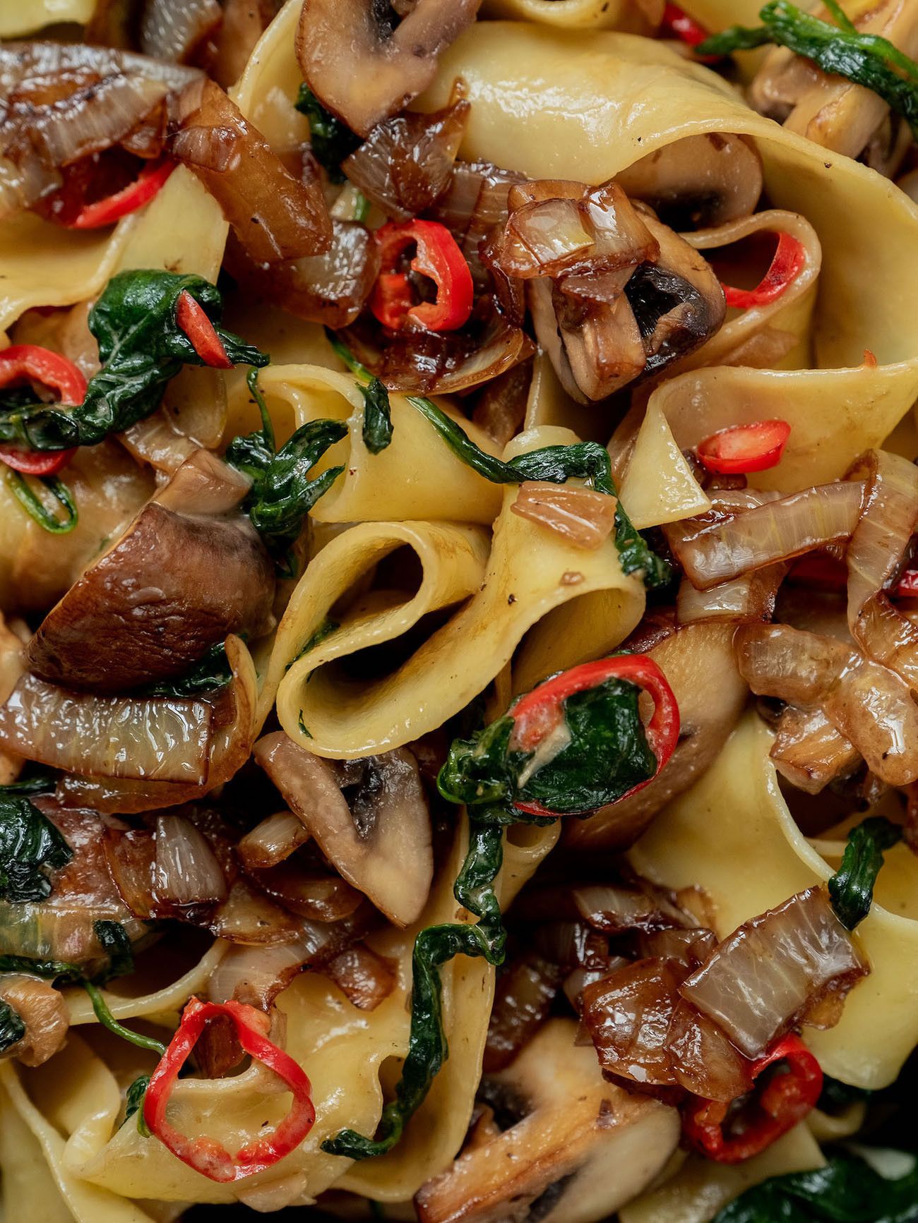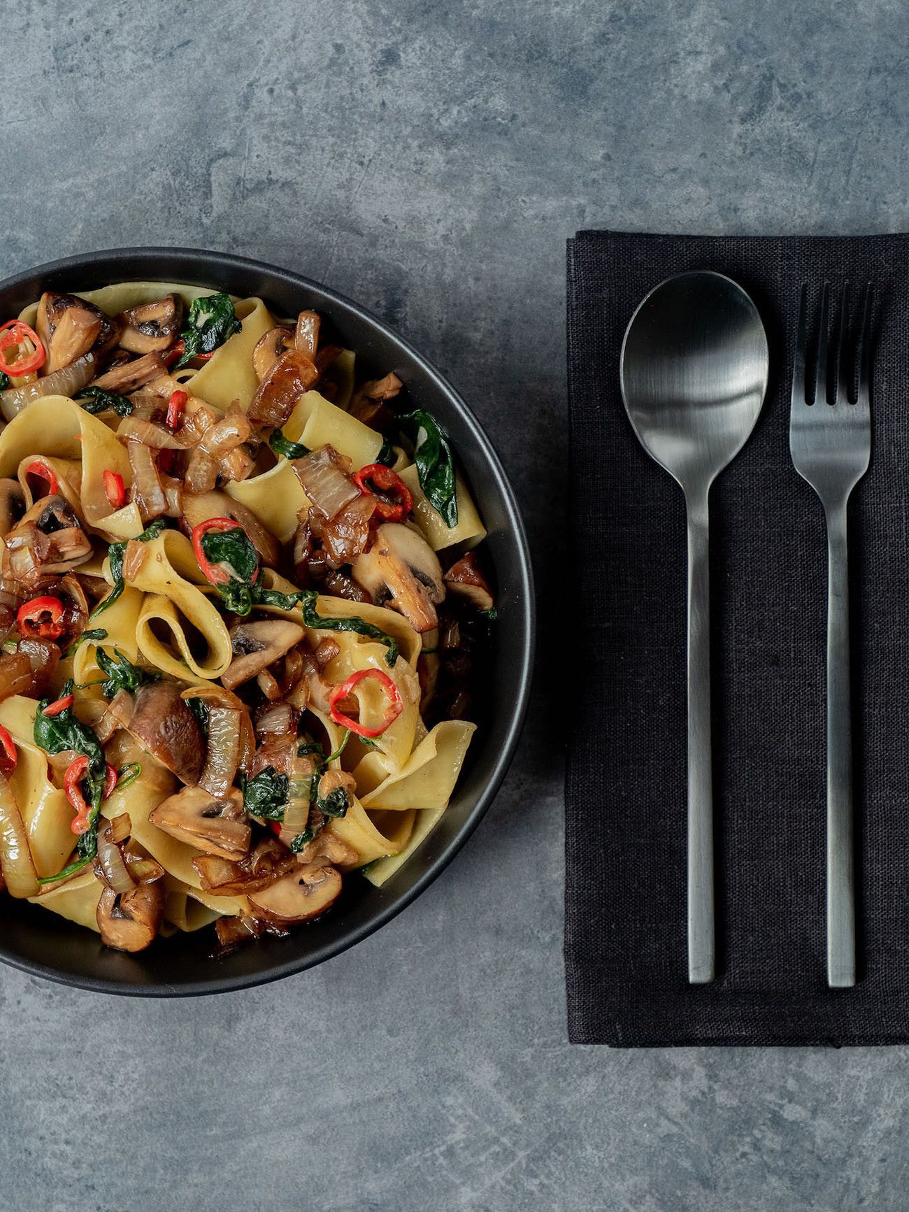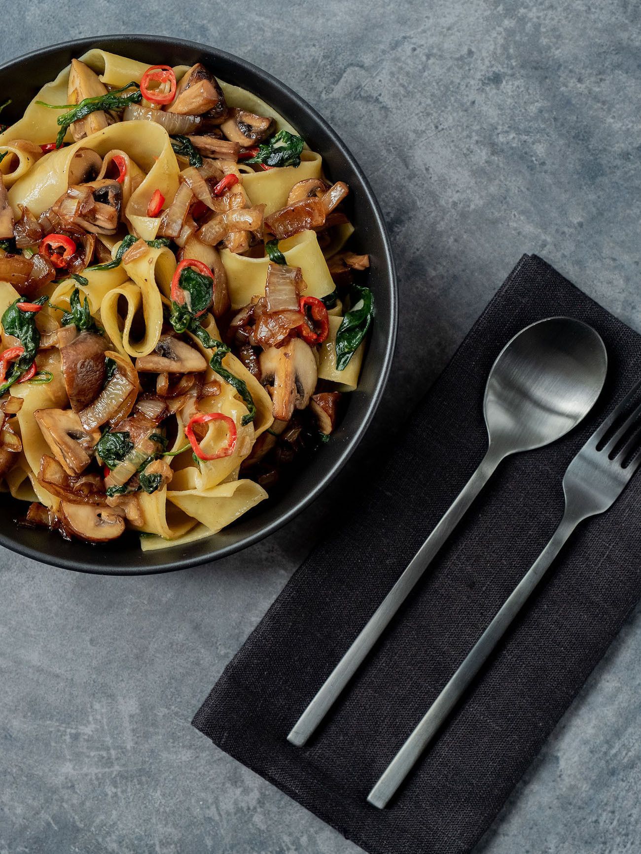 Manchmal muss es einfach Comfort Food sein und da ist Pasta natürlich ganz weit vorne mit dabei. Mein Rezept für Pappardelle mit Champignons, Spinat und Balsamico Zwiebeln schlägt genau in diese Kerbe. Die Pilze, der Spinat und die Balsamico Zwiebeln geben mit ihren tiefen, dunklen und erdigen Noten eine tolle Grundnote, die durch den Einsatz der Schlagsahne und ihrer cremigen und reichhaltigen Eigenschaft die Pasta mit den anderen Zutaten verbindet und umhüllt. Der Chili und der Knoblauch bringen noch mehr Aroma und den gewissen Kick mit in das Gericht. Alles in allem ist es ein eher einfaches und bodenständiges Rezept, was aber gleichzeitig mal wieder beweist, wie gut und befriedigend simple Gerichte ohne viele Zutaten schmecken können. Ich bin begeistert und wünsche dir viel Spaß beim Nachkochen und einen guten Appetit!