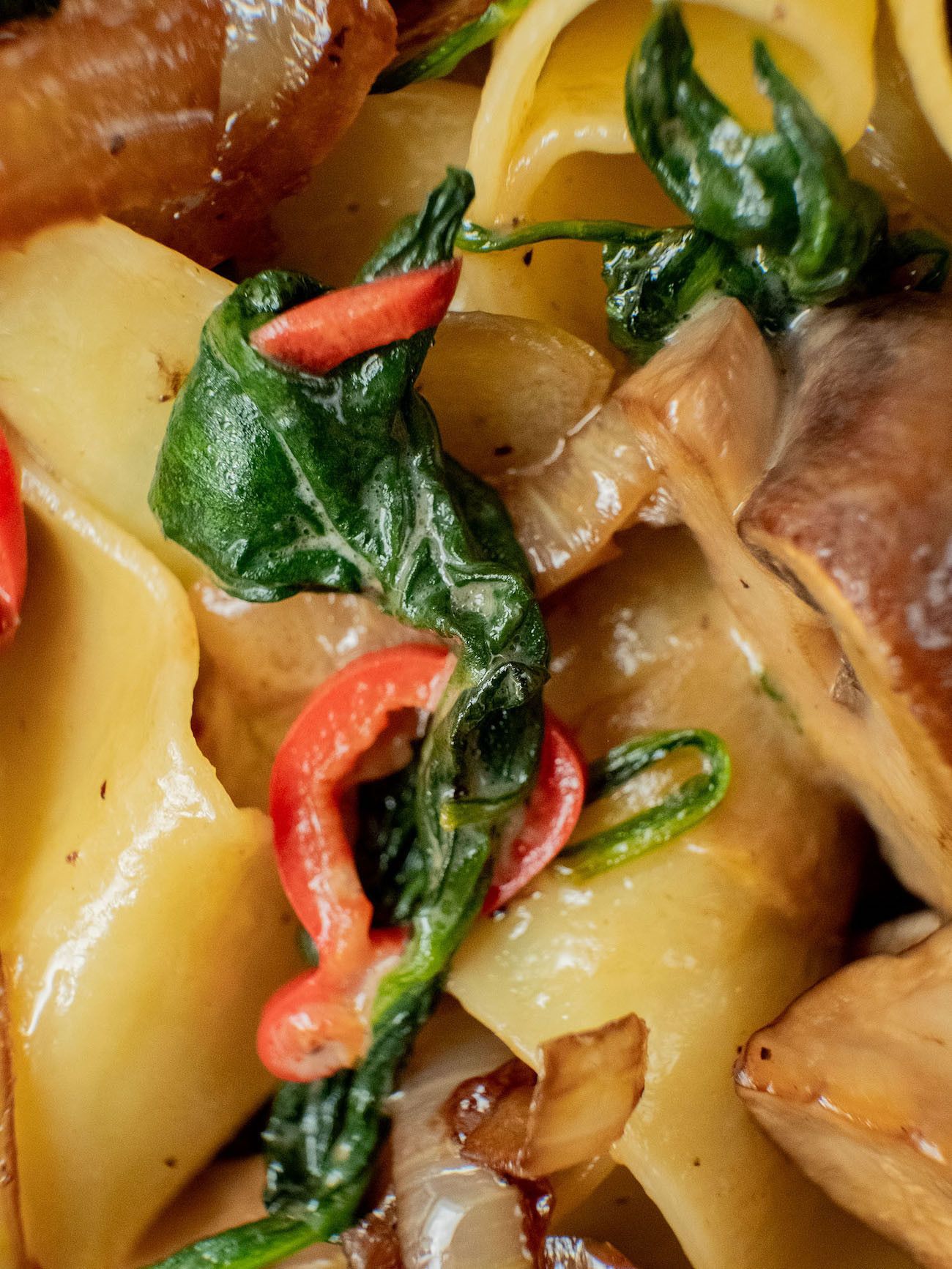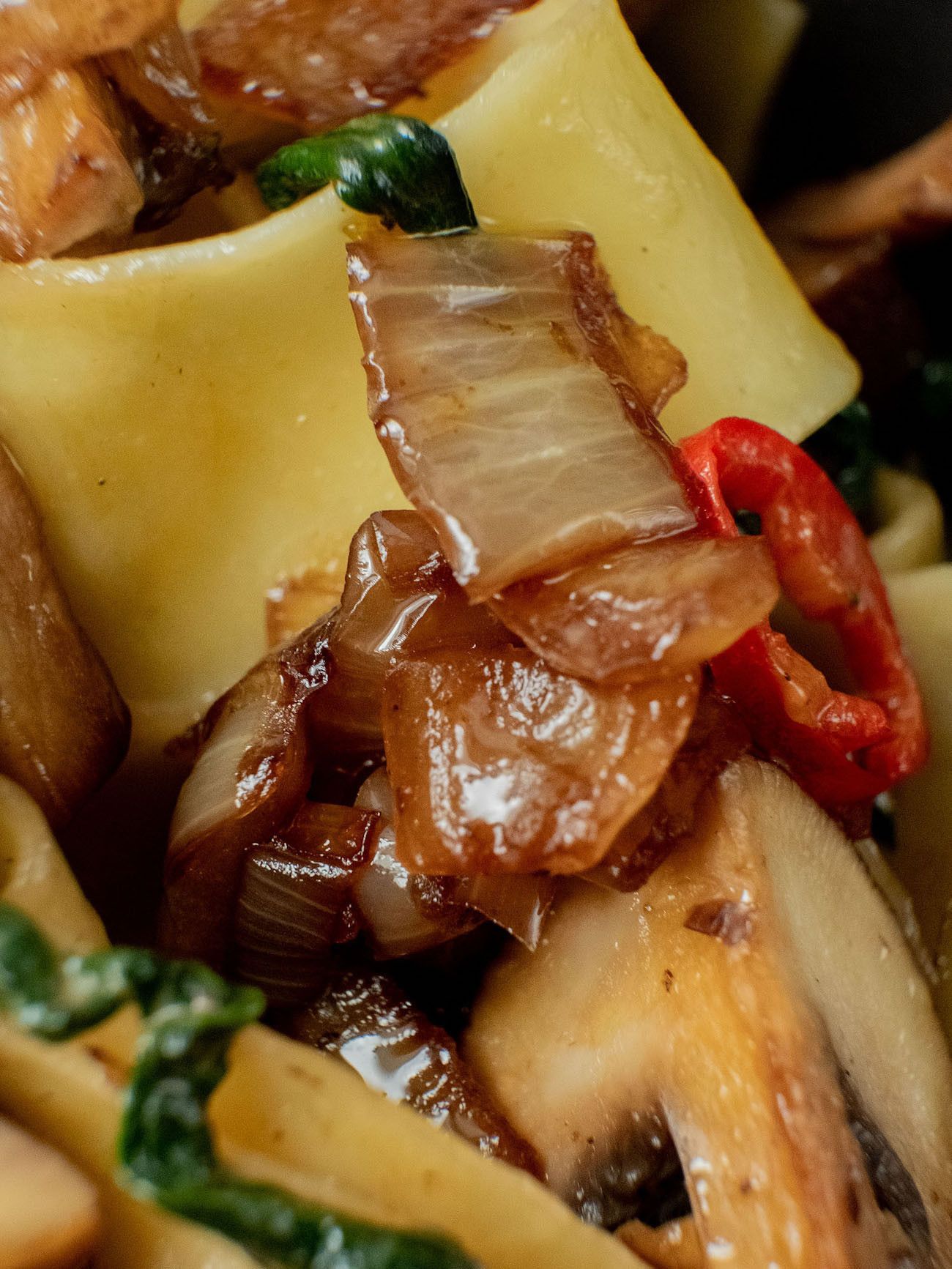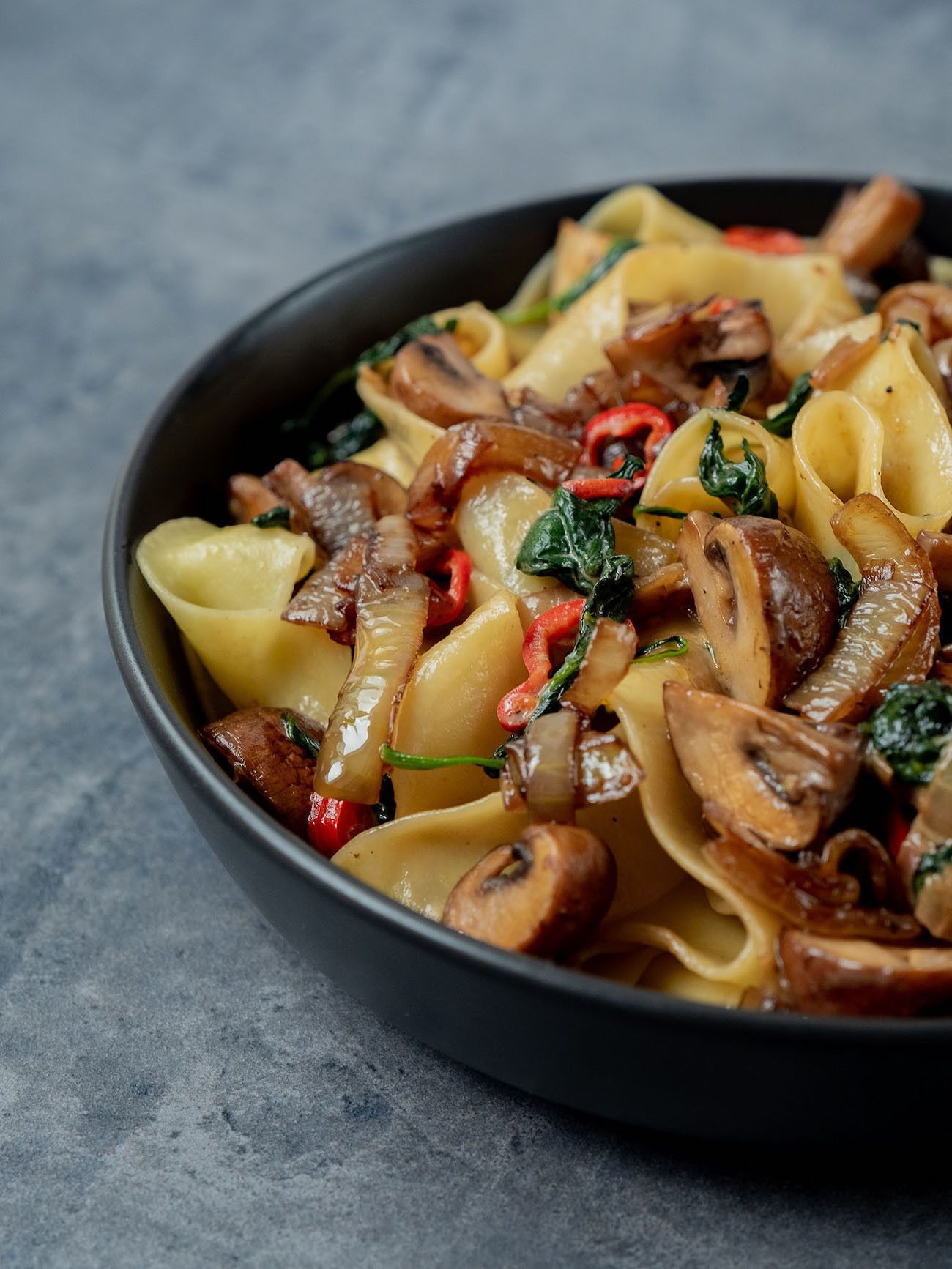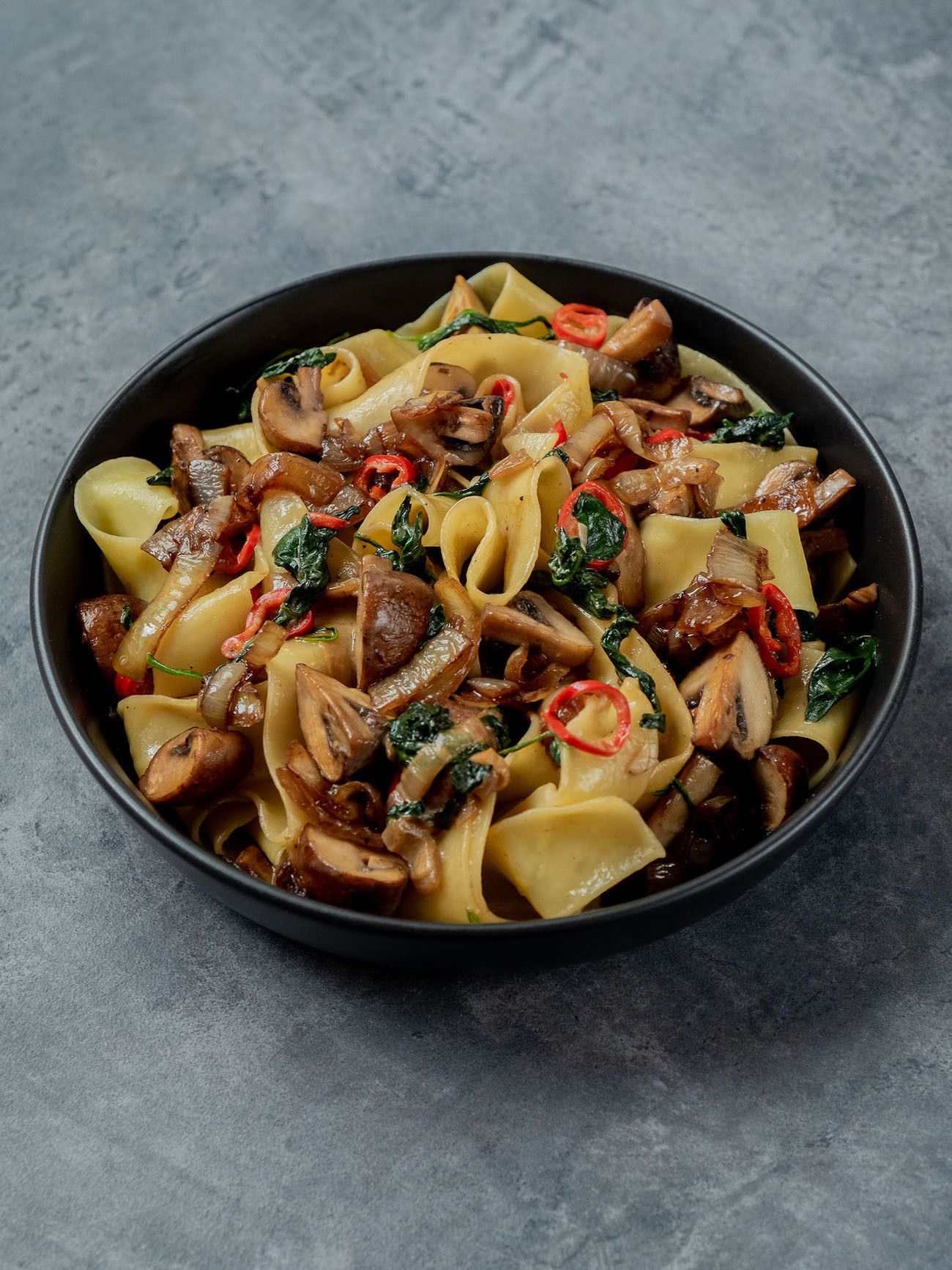 Manchmal muss es einfach Comfort Food sein und da ist Pasta natürlich ganz weit vorne mit dabei. Mein Rezept für Pappardelle mit Champignons, Spinat und Balsamico Zwiebeln schlägt genau in diese Kerbe. Die Pilze, der Spinat und die Balsamico Zwiebeln geben mit ihren tiefen, dunklen und erdigen Noten eine tolle Grundnote, die durch den Einsatz der Schlagsahne und ihrer cremigen und reichhaltigen Eigenschaft die Pasta mit den anderen Zutaten verbindet und umhüllt. Der Chili und der Knoblauch bringen noch mehr Aroma und den gewissen Kick mit in das Gericht. Alles in allem ist es ein eher einfaches und bodenständiges Rezept, was aber gleichzeitig mal wieder beweist, wie gut und befriedigend simple Gerichte ohne viele Zutaten schmecken können. Ich bin begeistert und wünsche dir viel Spaß beim Nachkochen und einen guten Appetit!