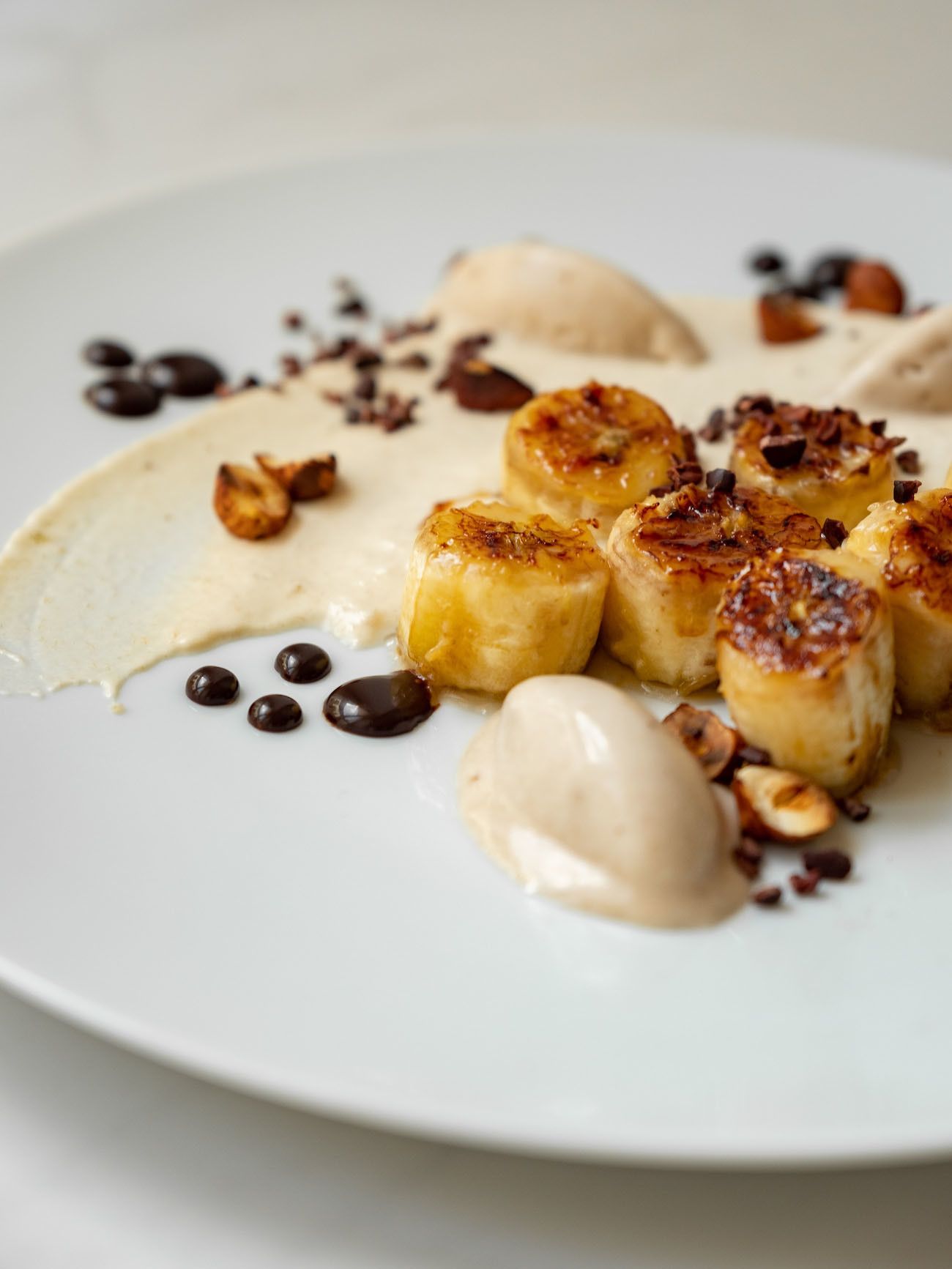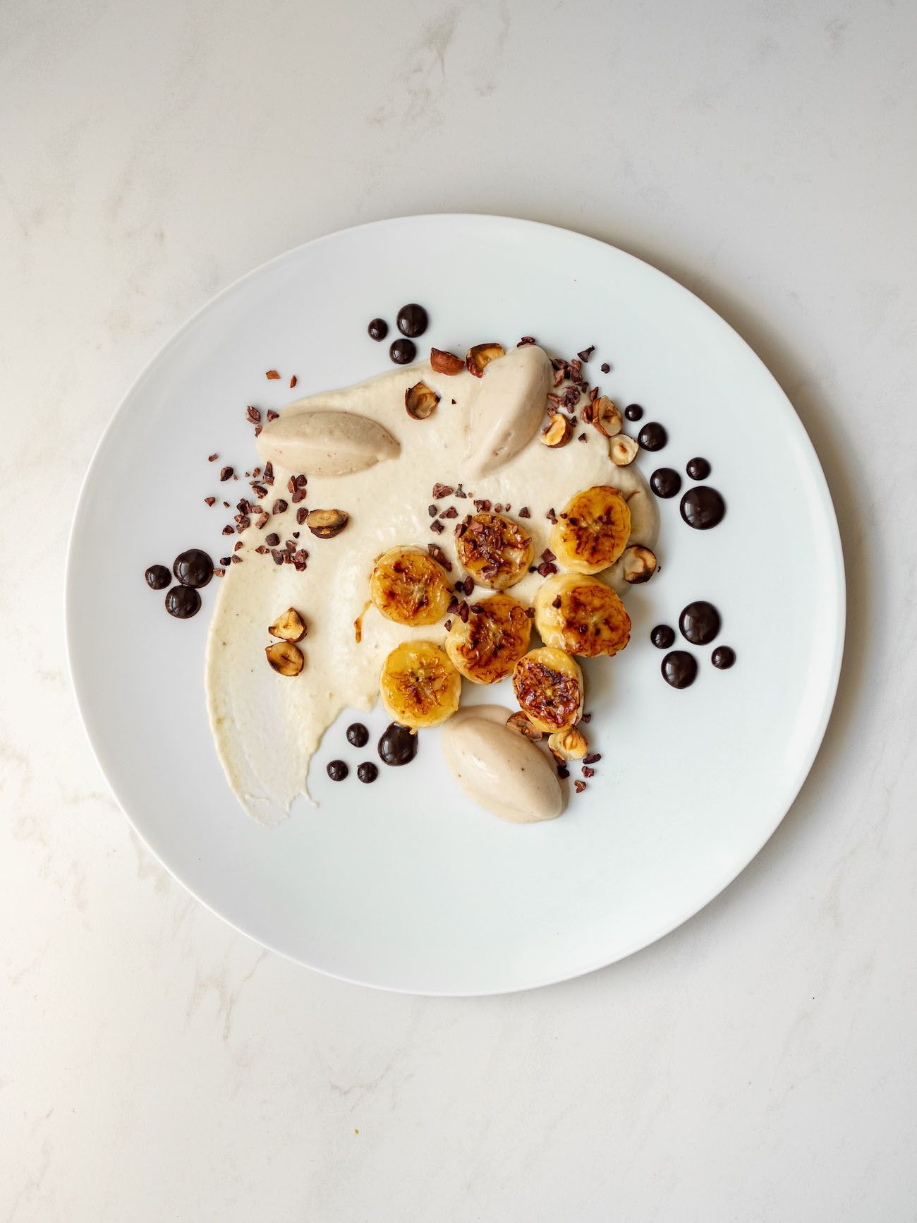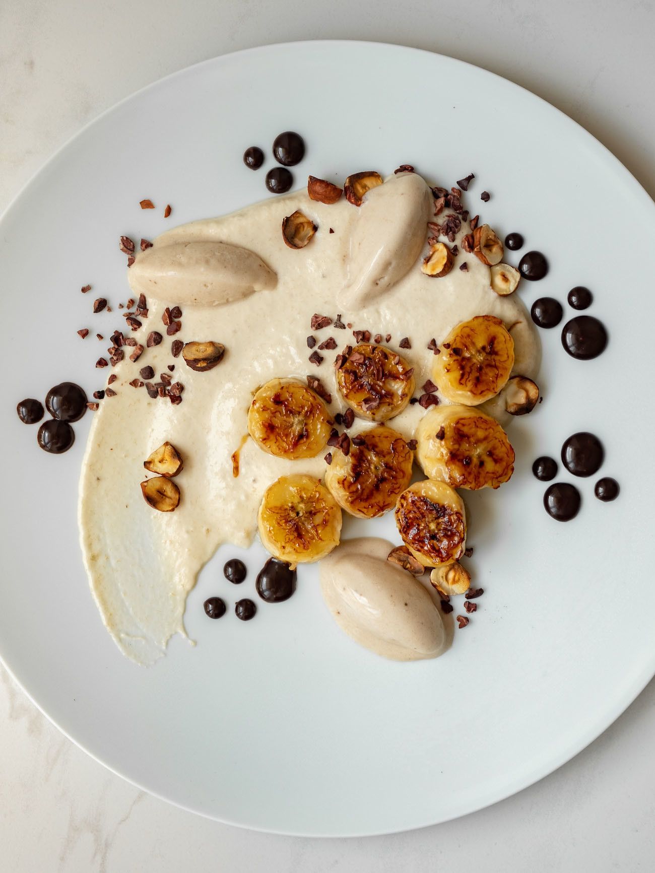 - Nun geht es auch schon ans Anrichten. Dafür die Bananen-Schlagsahne auf vorgekühlten Tellern oder Schüsseln verteilen und mit einem Schwung verstreichen. Anschließend die Bananenscheiben platzieren, Punkteweise das Schokoladenkaramell drum herum verteilen. Jetzt noch das Eis aus dem Gefrierfach holen, kleine Nocken abstechen und auf den Teller geben.