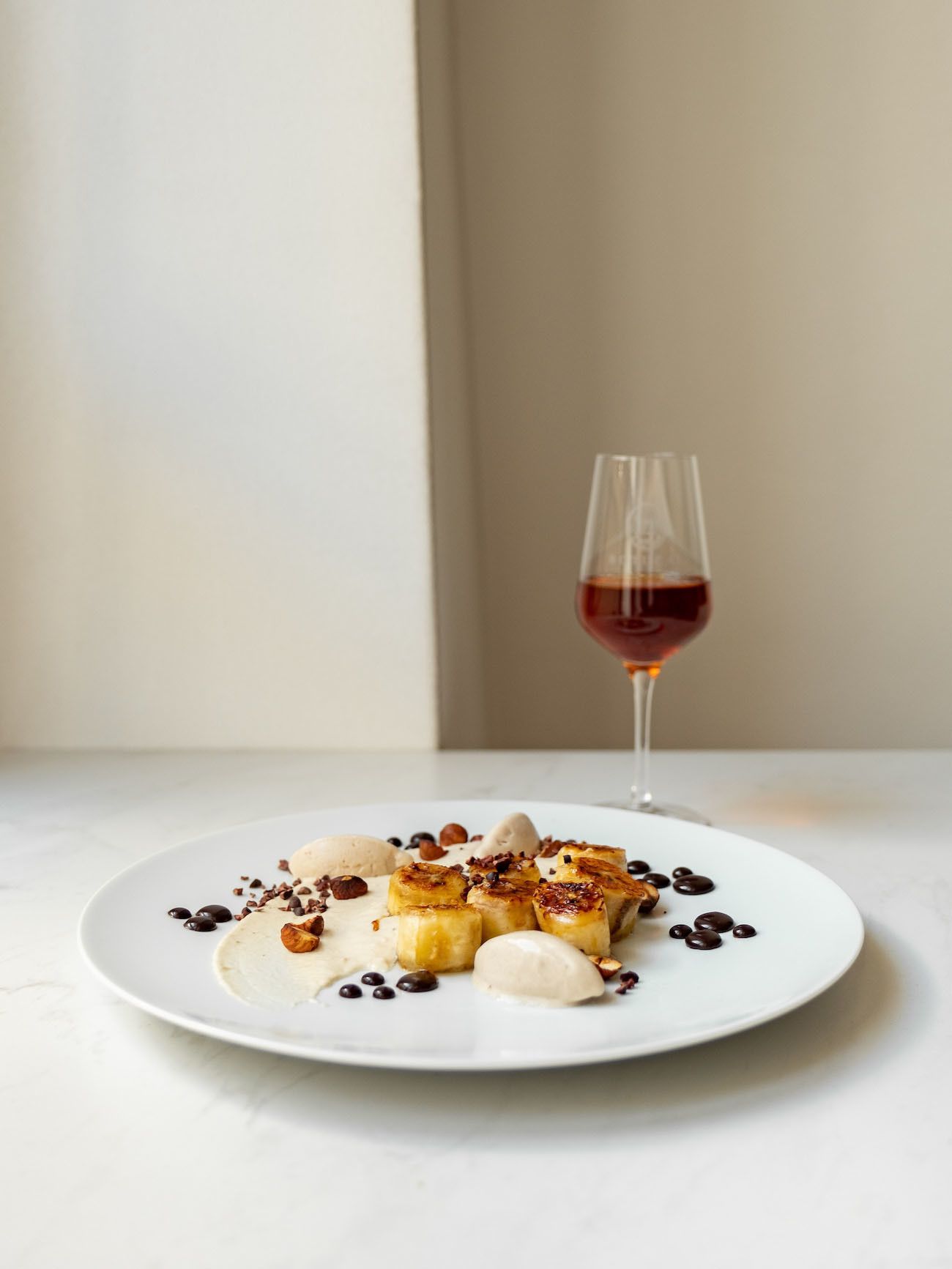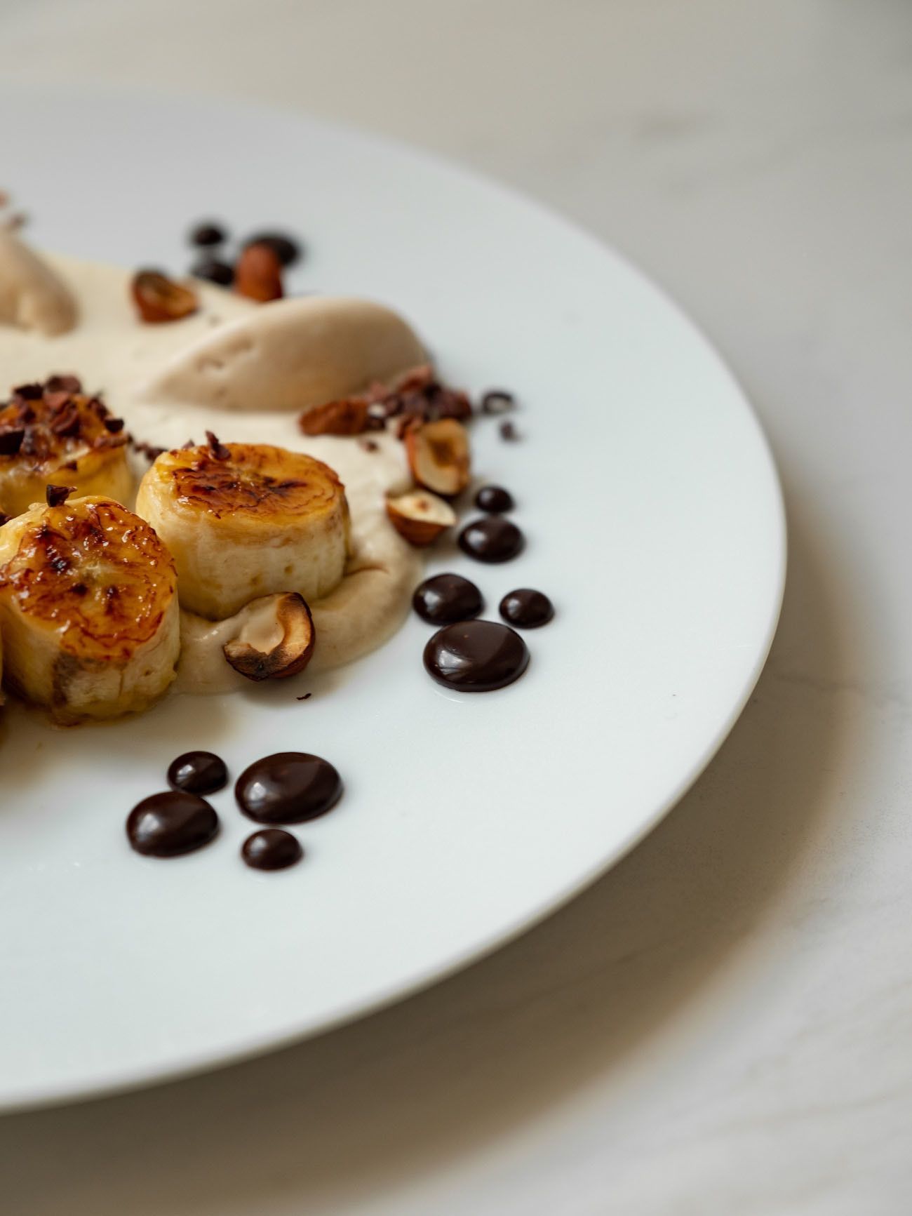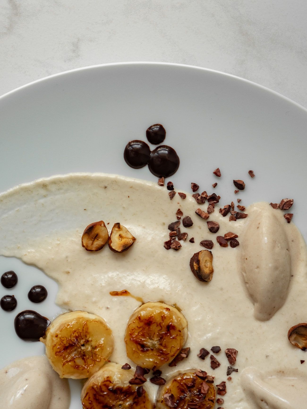 - Nun geht es auch schon ans Anrichten. Dafür die Bananen-Schlagsahne auf vorgekühlten Tellern oder Schüsseln verteilen und mit einem Schwung verstreichen. Anschließend die Bananenscheiben platzieren, Punkteweise das Schokoladenkaramell drum herum verteilen. Jetzt noch das Eis aus dem Gefrierfach holen, kleine Nocken abstechen und auf den Teller geben.