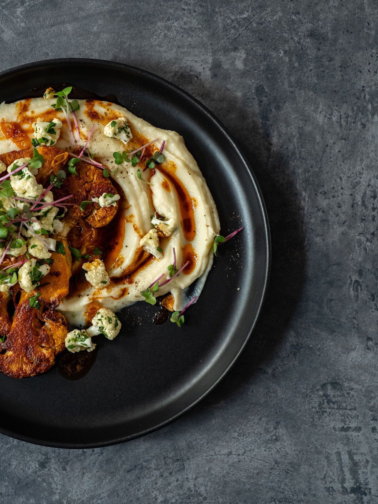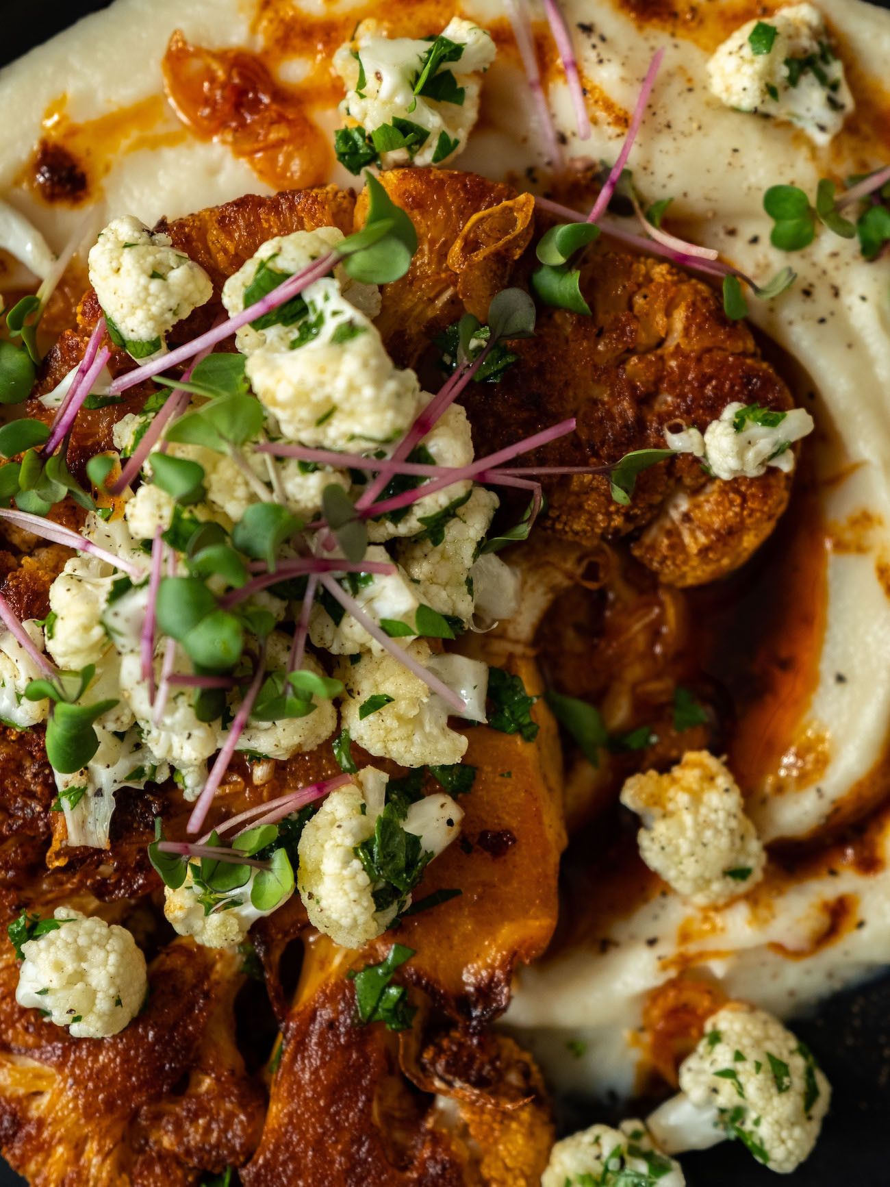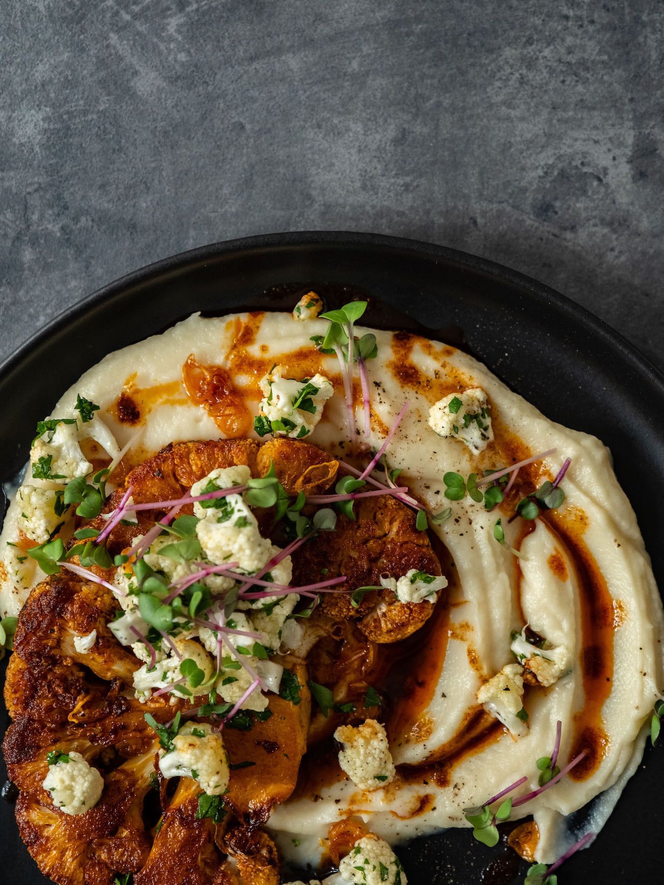 - Als Nächstes kann schon angerichtet werden. Dazu jeweils die Hälfte des Pürees auf einen flachen Teller geben, etwas verteilen und dann die Blumenkohlsteaks darauf platzieren. Anschließend noch den Blumenkohlsalat aus der Schüssel darüber verteilen und die Paprikasoße darüber träufeln.