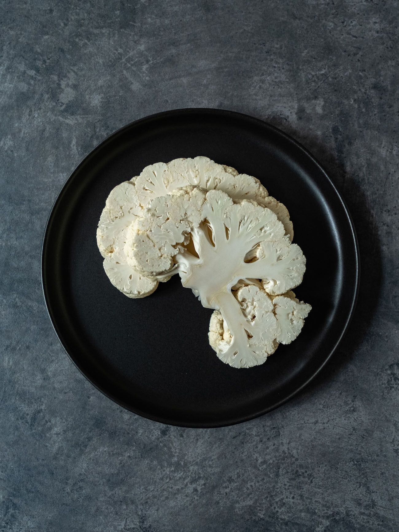 - Nun den Blumenkohl von den Blättern trennen und aus der Mitte zwei circa zwei Zentimeter dicke Scheiben herausschneiden.