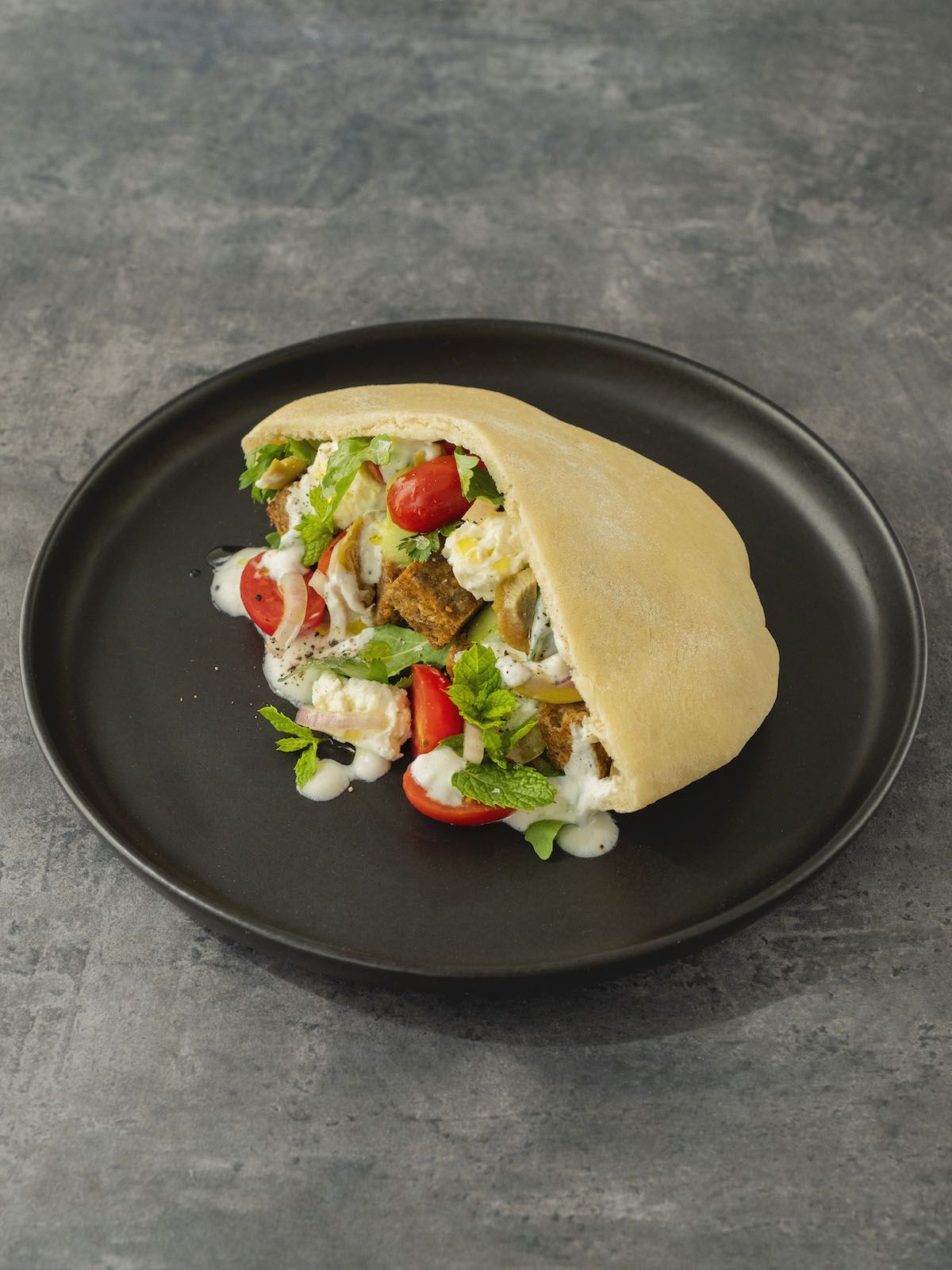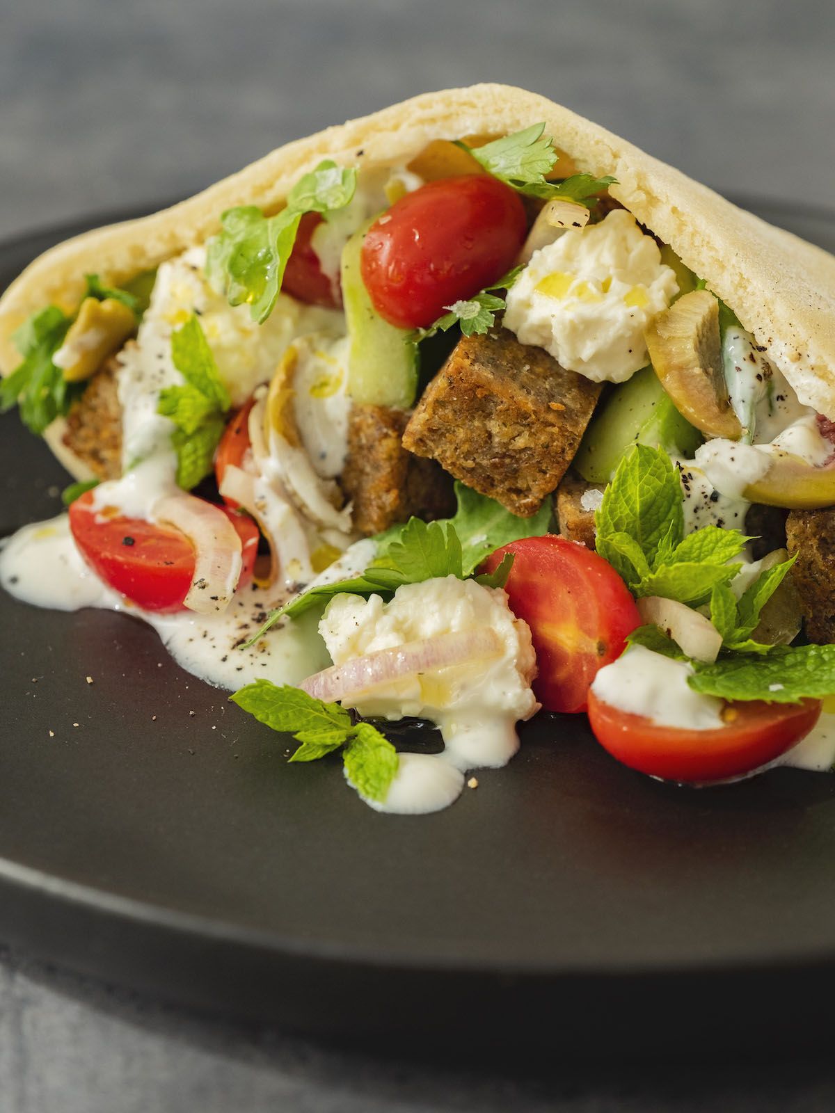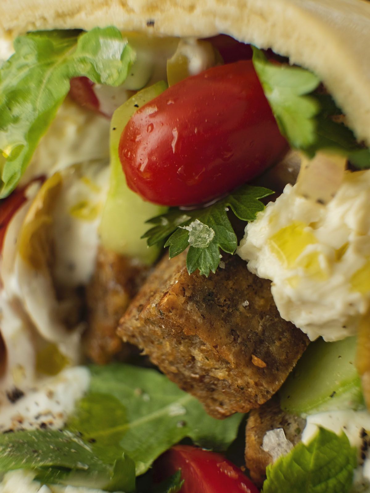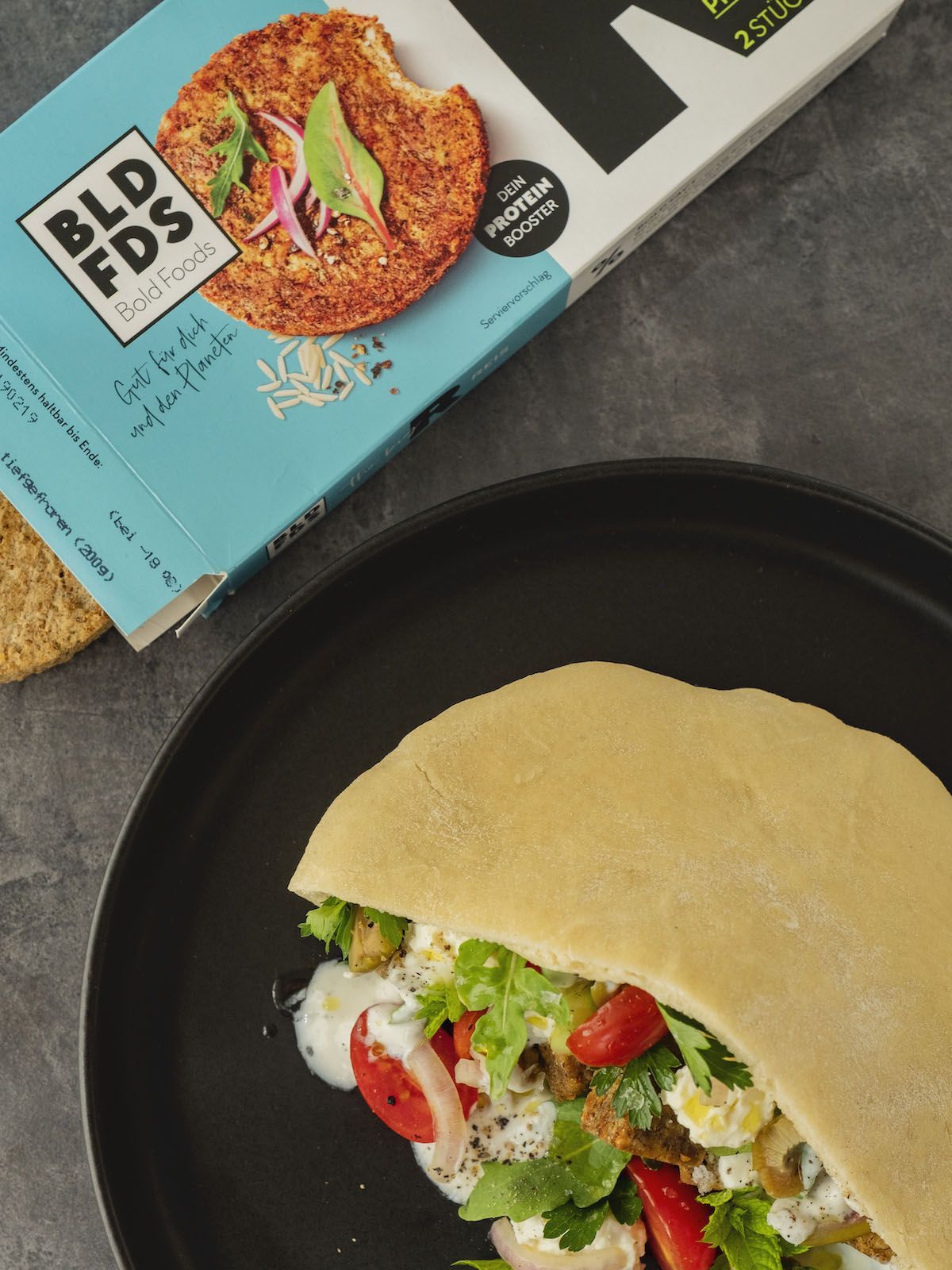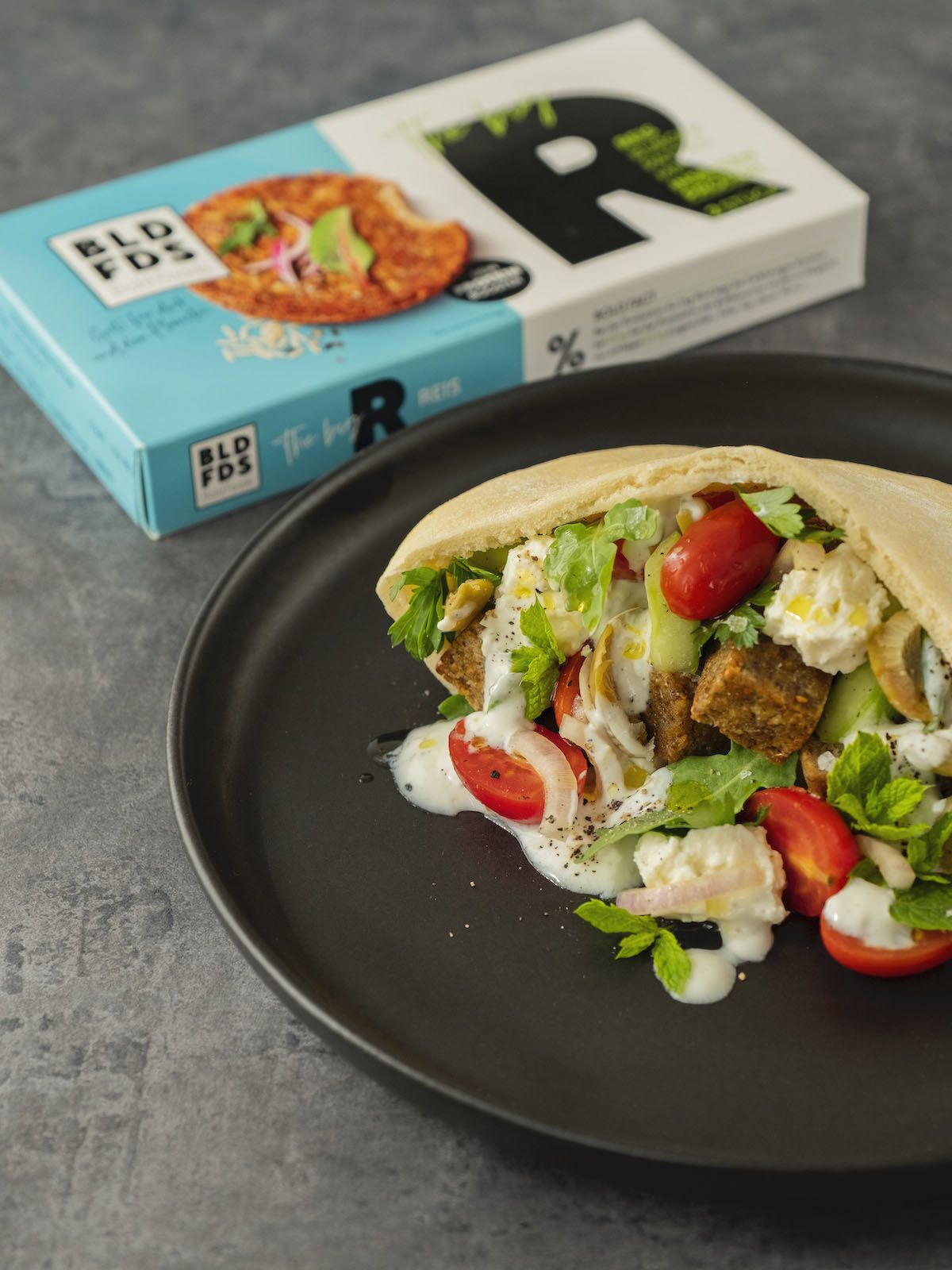 Rezept BOLD FOODS The big R Knusperwürfel im Pita Brot mit griechischem Salat, Rucola und Joghurt-Zitronen-Soße