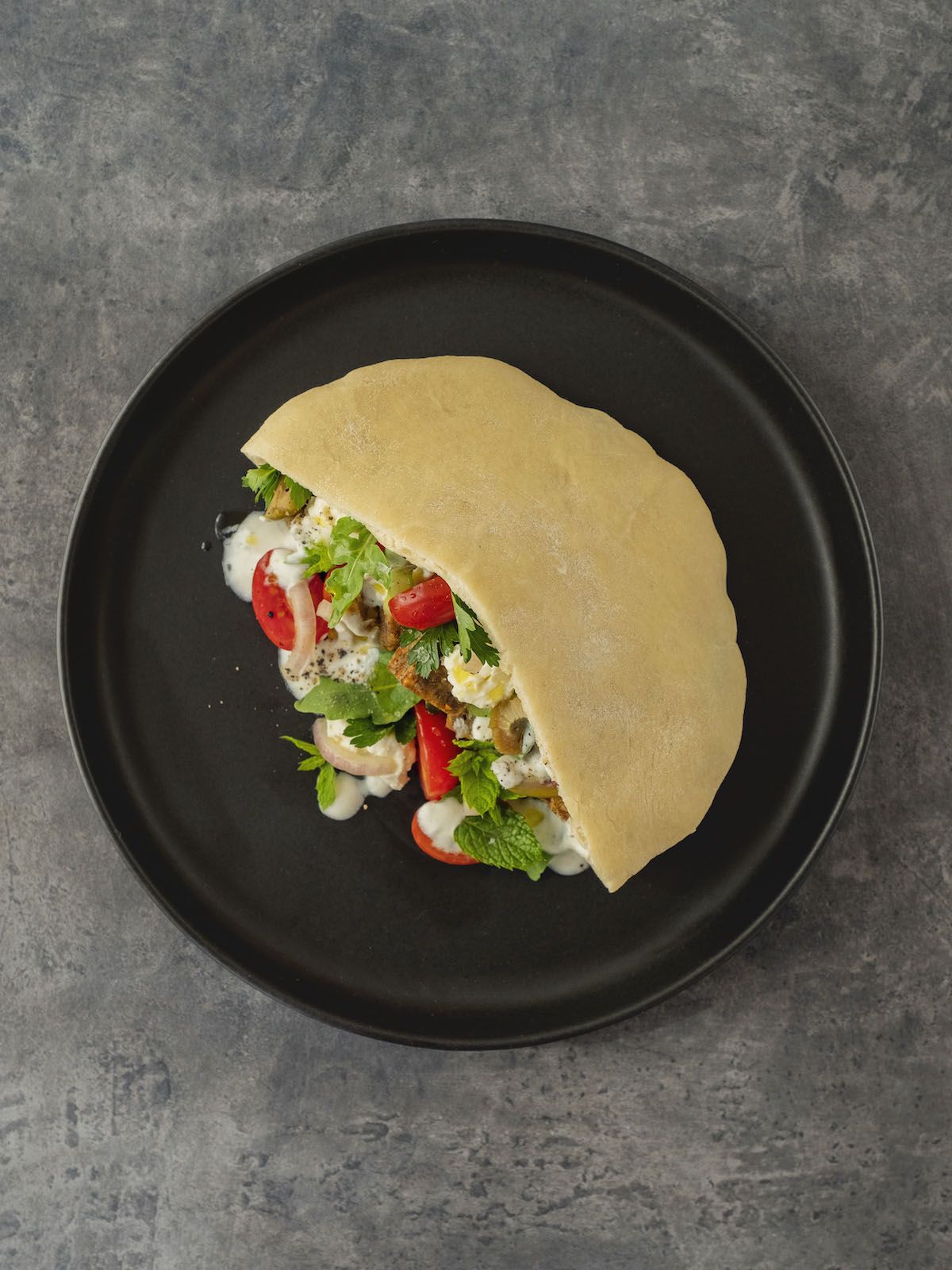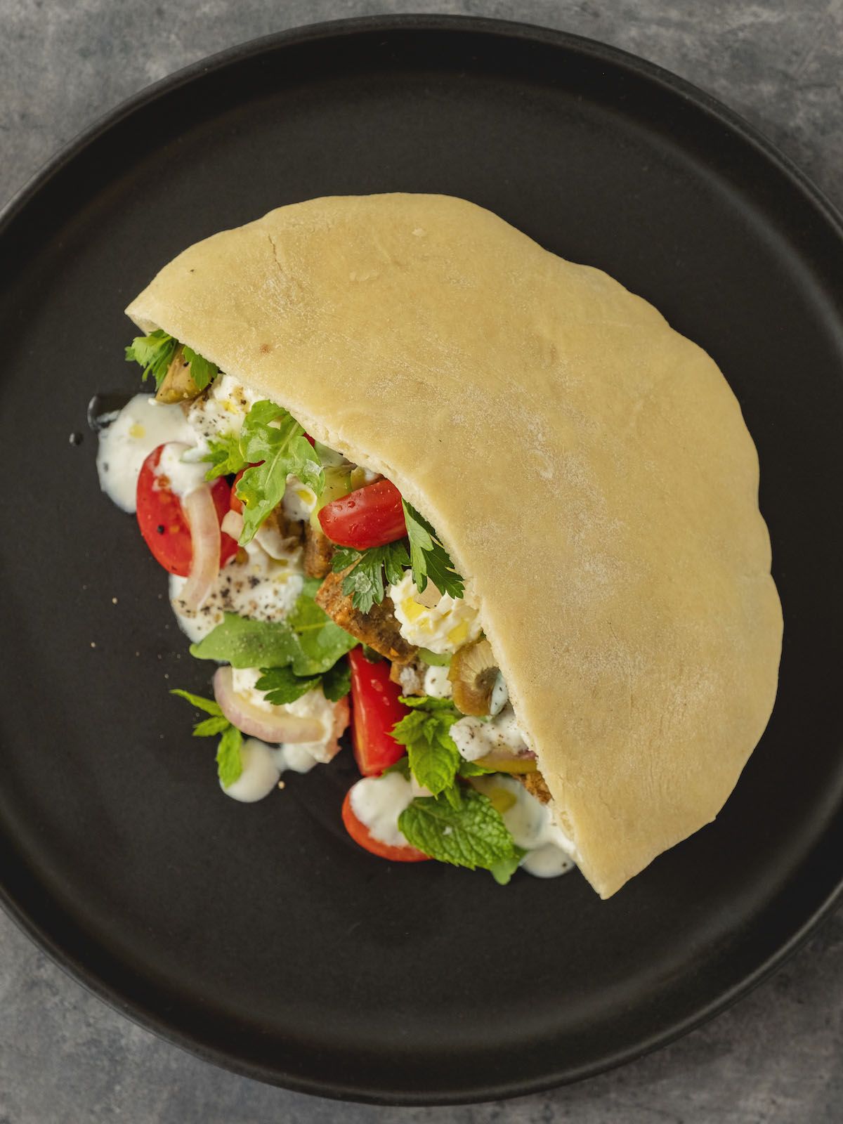 - Nun geht es auch schon ans Anrichten. Dazu alle vorbereiteten Zutaten abwechselnd in die Pita Brottasche geben und mit etwas frisch gemahlenem schwarzen Pfeffer garnieren.