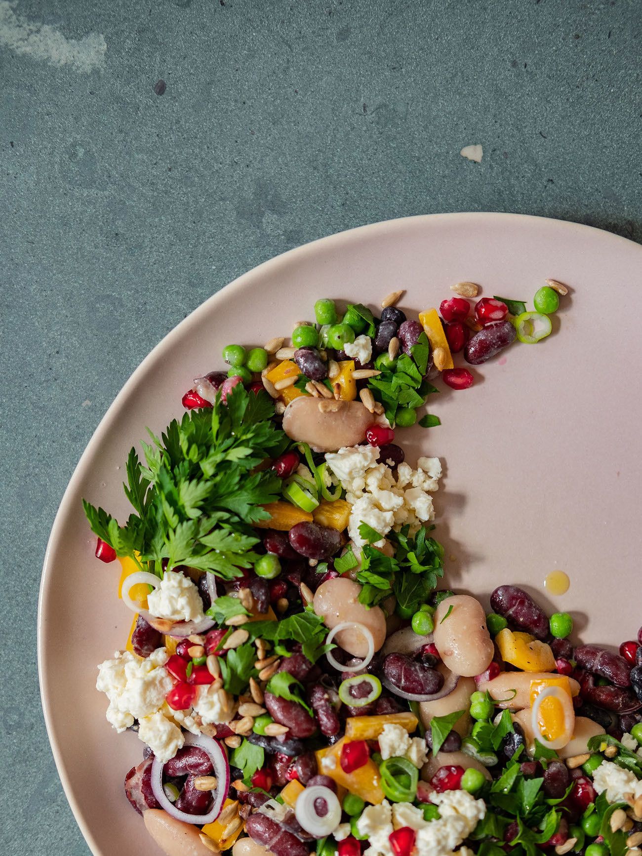 - Zu Beginn die verschiedenen Bohnen, die Erbsen, die Paprikawürfel, 90 % der Granatapfelkerne, 90 % der gehackten Petersilie, 90 % der Zwiebelringe, und die Frühlingszwiebeln in die Salatschüssel geben und vorsichtig vermischen.