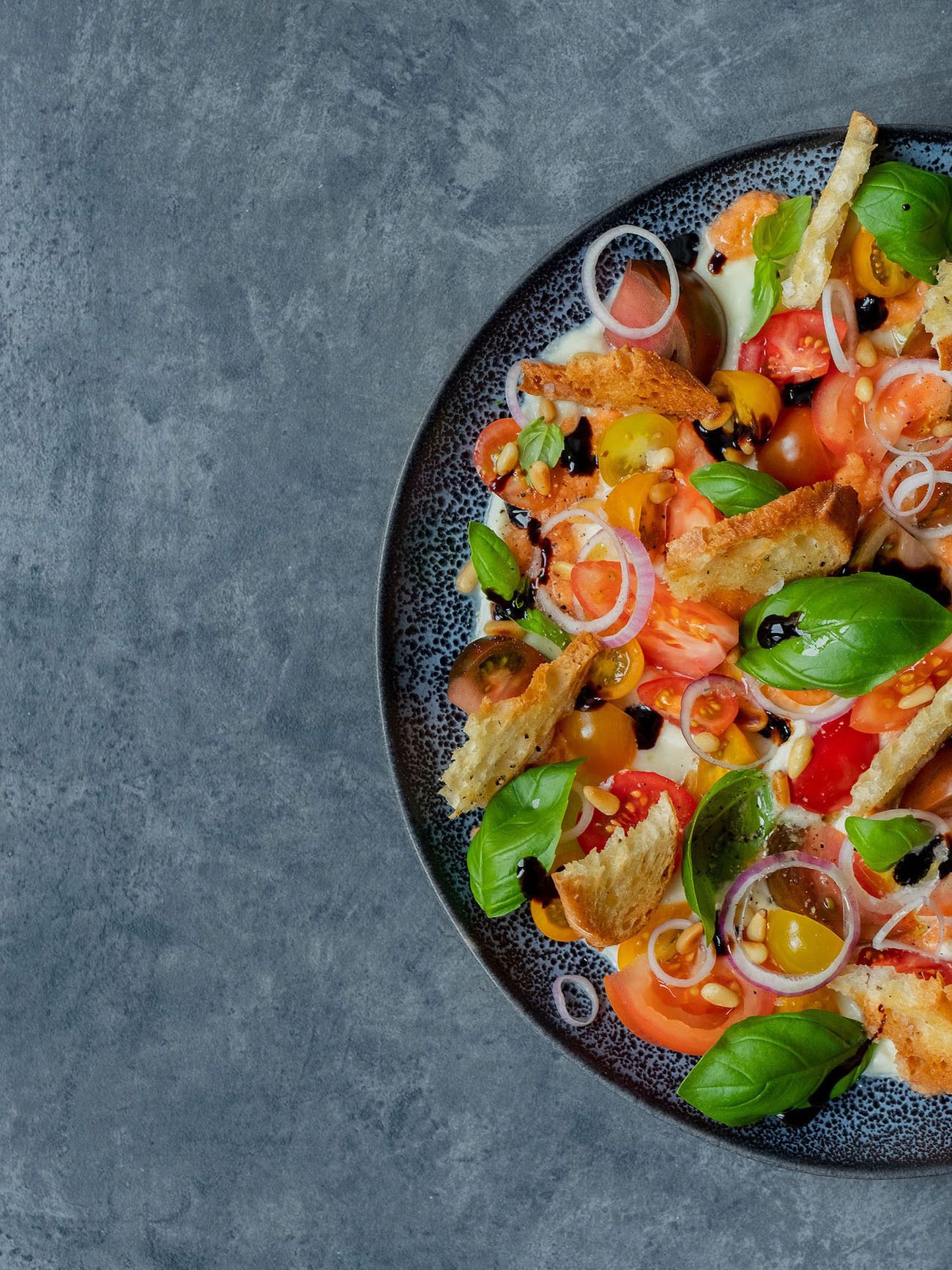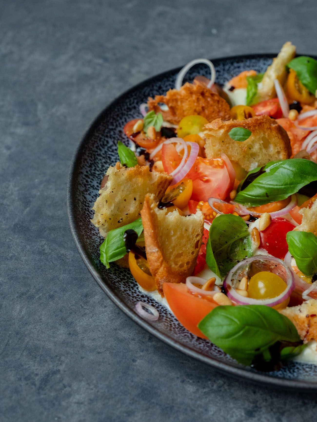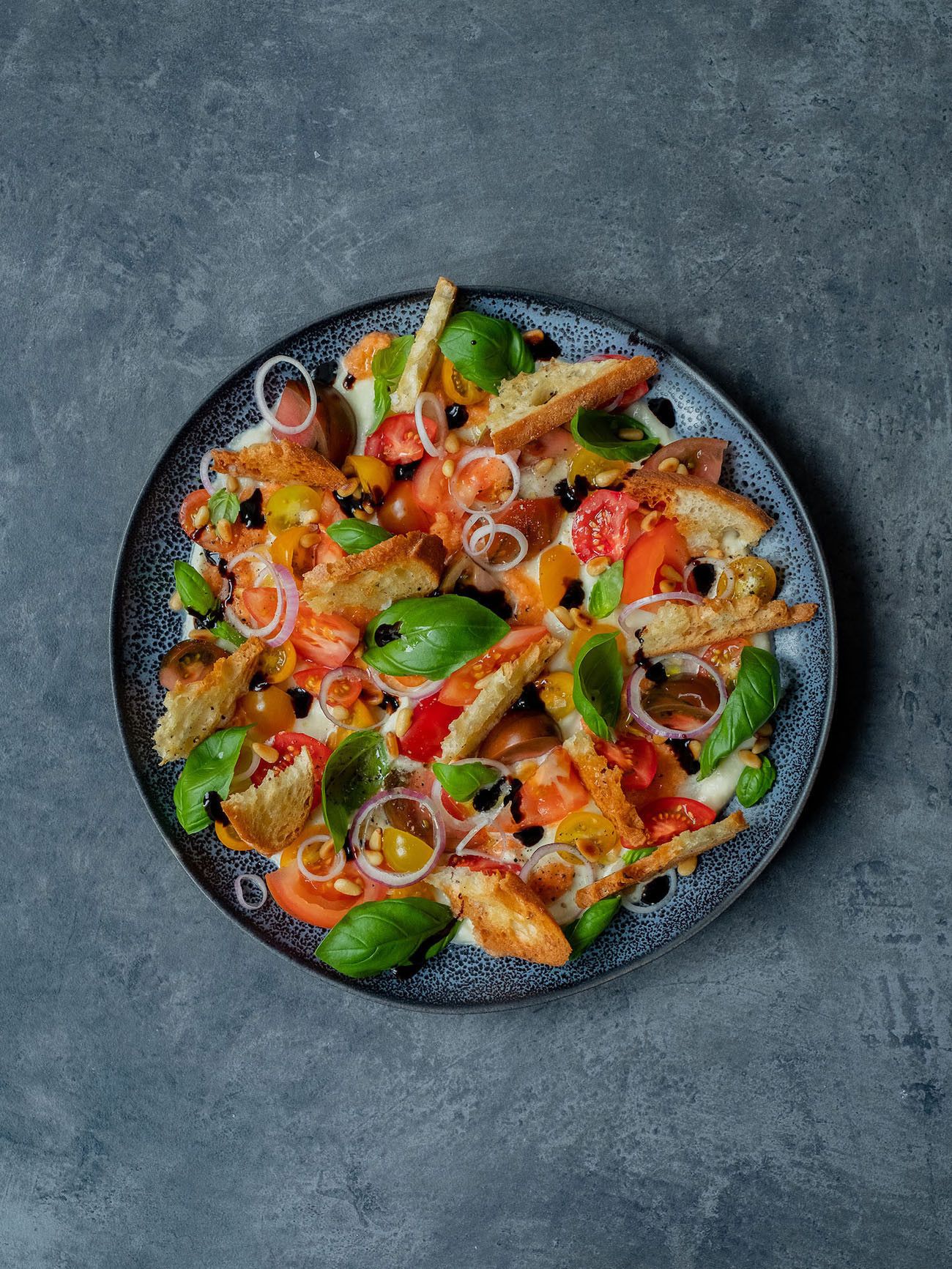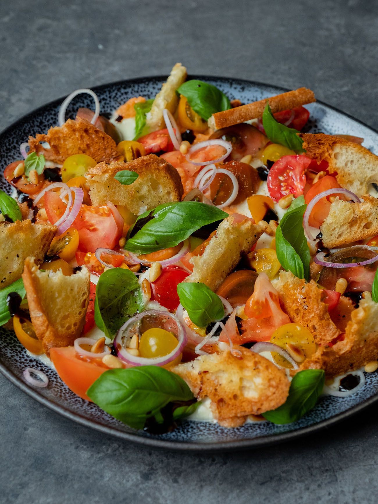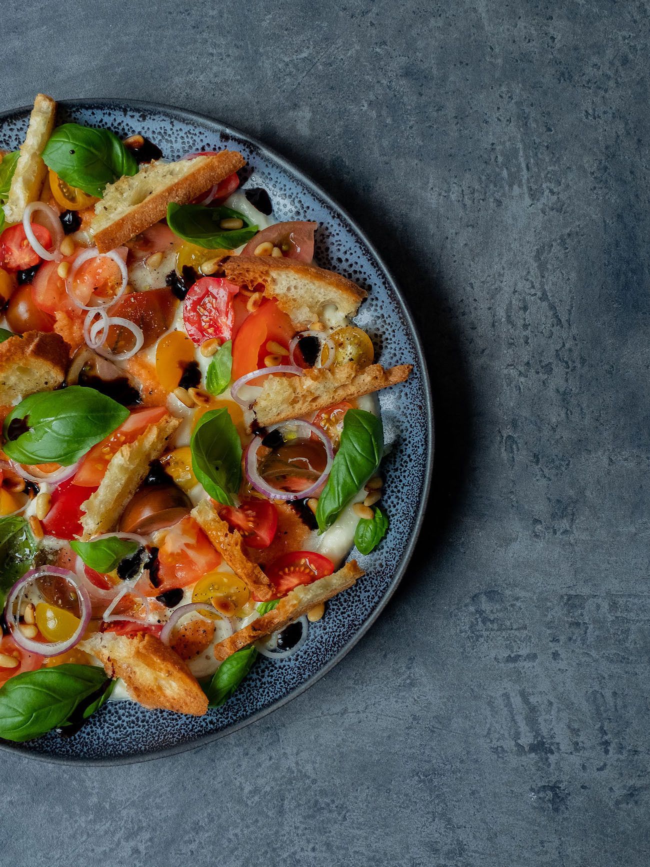 - Zum Schluss noch die Brotchips etwas zerkleinern und verteilen und mit Olivenöl, Balsamico Creme und frisch gemahlenem schwarzen Pfeffer garnieren.