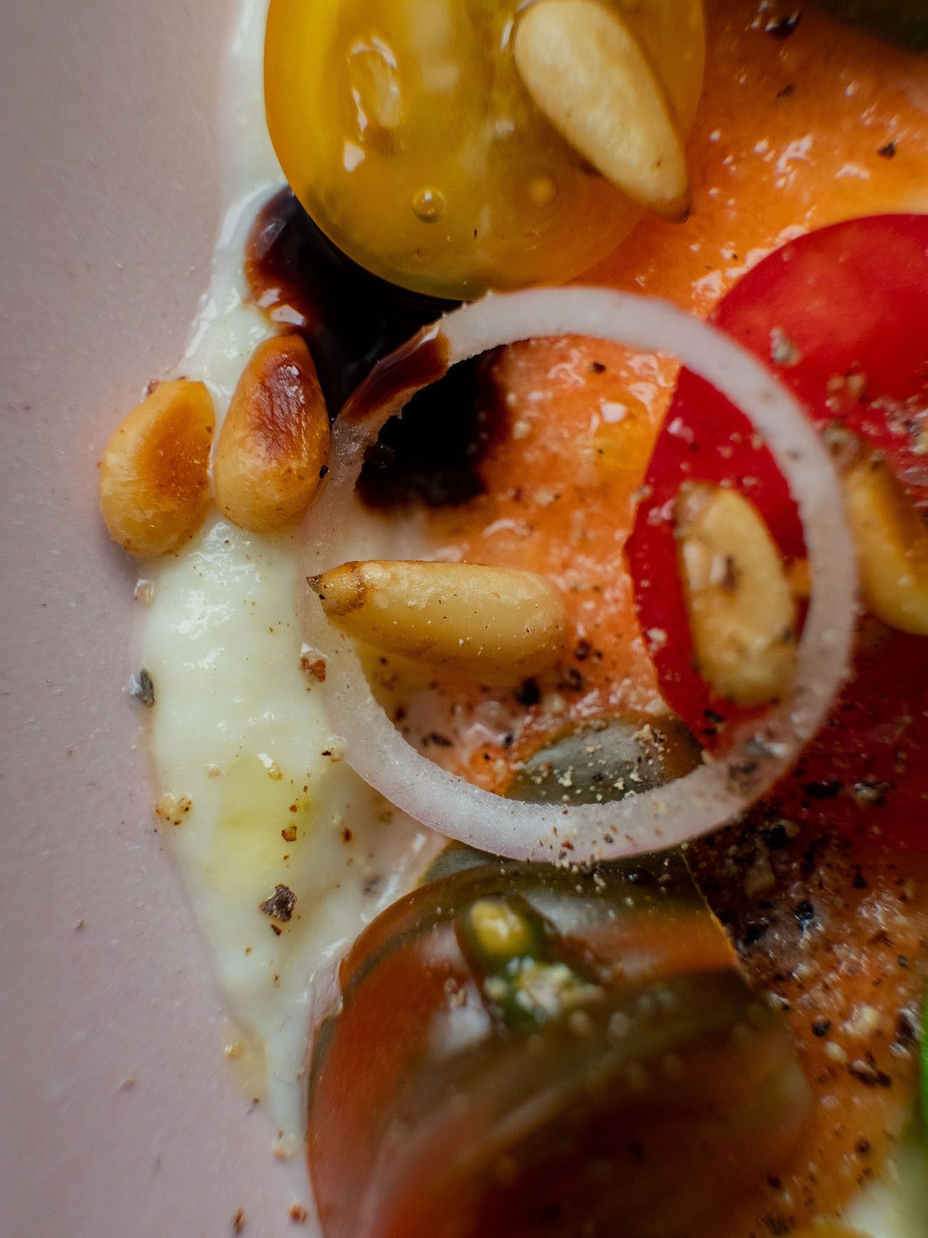 - Jetzt geht es auch schon ans Anrichten. Dafür die Mozzarella Creme auf einen großen oder vier kleine Teller verteilen und das Tomatenpüree löffelweise darauf verteilen. Anschließend die Tomatenstücke und die Zwiebelringe, gefolgt von den Pinienkernen und den Basilikum Blättern darauf verteilen.