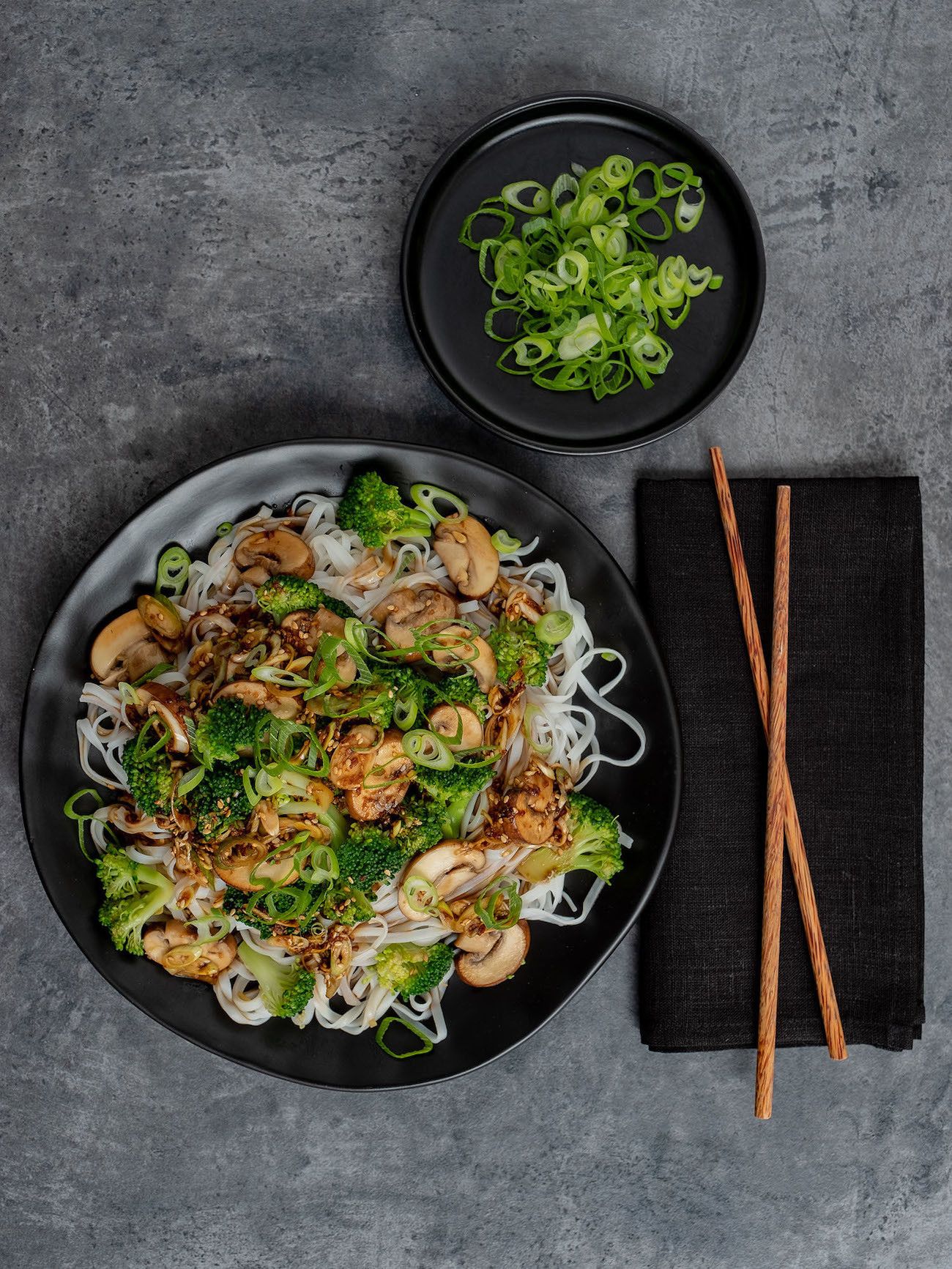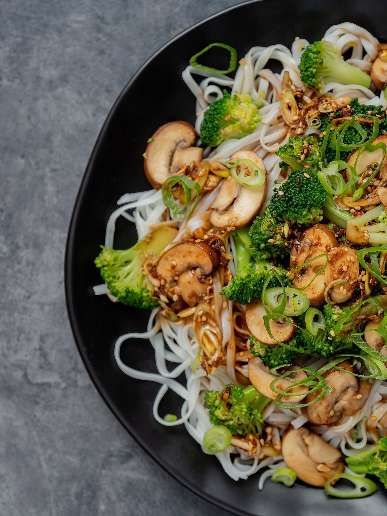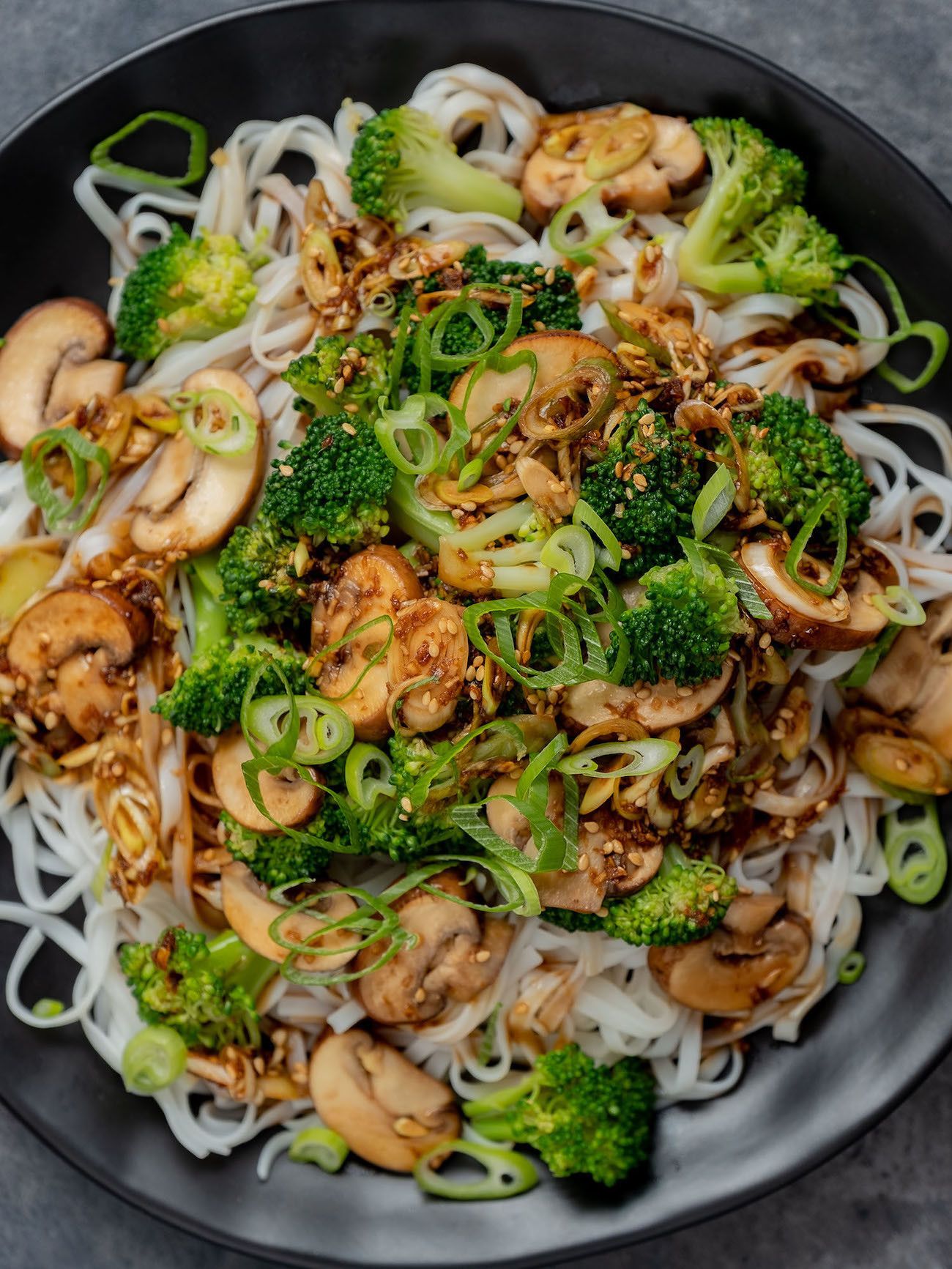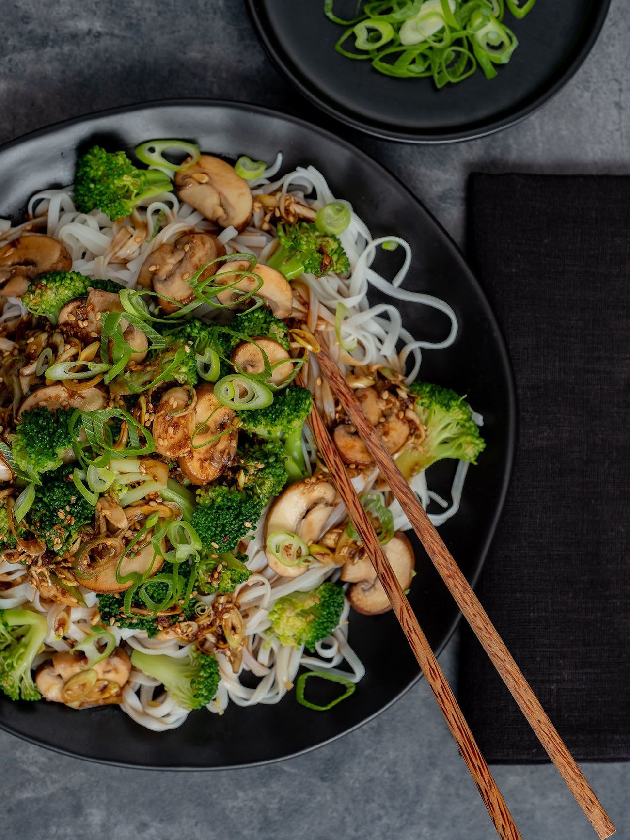 - Nun nur noch die Nudeln auf Teller oder Schüsseln verteilen, die Champignons und den Brokkoli samt der Soße darauf geben und mit den geschnittenen Frühlingszwiebelringen und dem gerösteten Sesam garnieren.