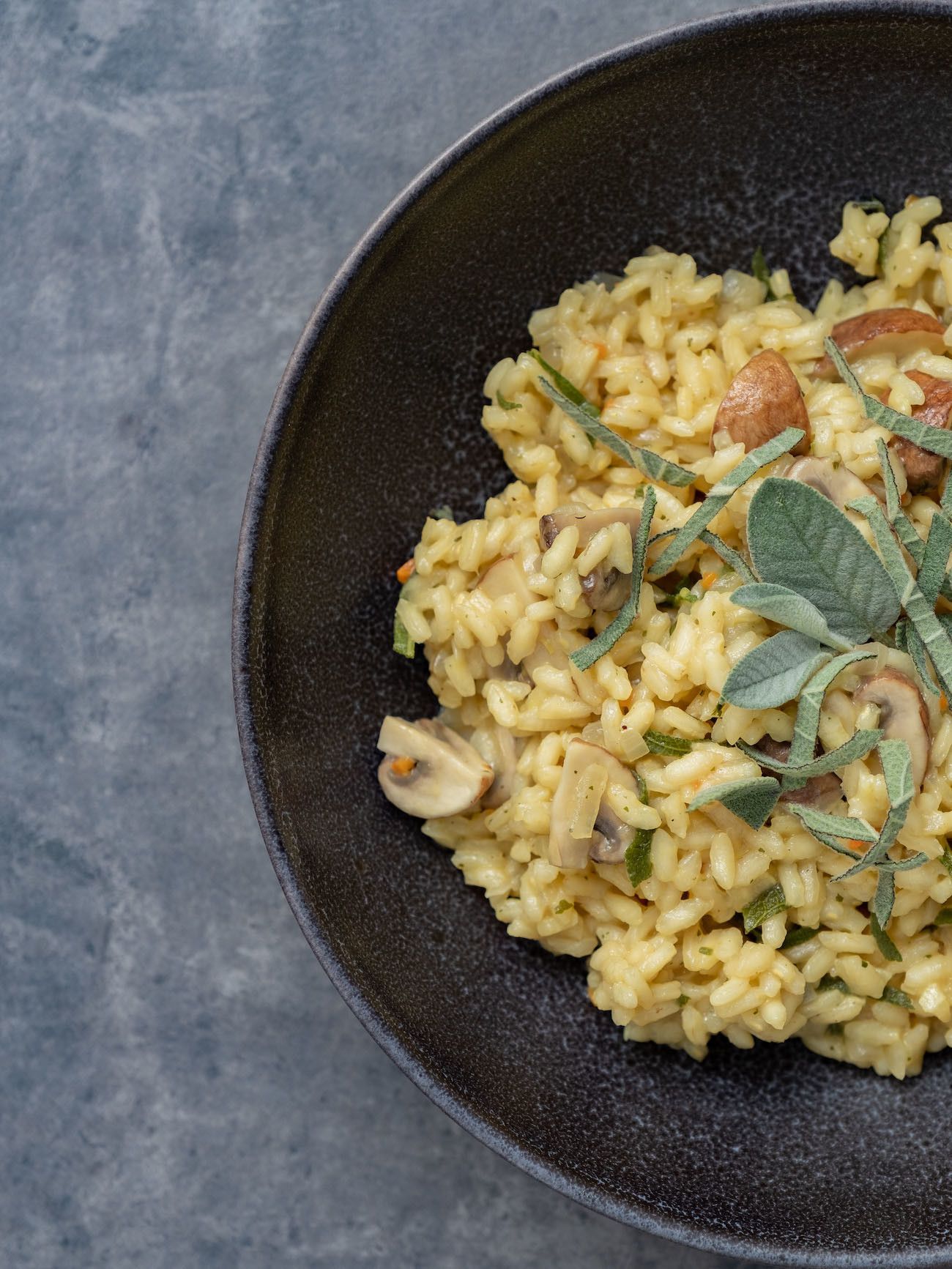 Risotto gehört zwar nicht zu den fotogensten Gerichten, die es so gibt, aber bestimmt mit zu den leckersten. Da das Grundrezept für Risotto eigentlich sehr einfach ist und man es wunderbar mit den unterschiedlichsten Zutaten verfeinern kann, habe ich heute für dich ein Rezept für Champignon-Risotto mit Salbei vorbereitet. Mir hat die Kombination sehr gut gefallen und ich bin mir sicher, dass sie sich auch noch sehr gut in anderen Gerichten unterbringen lässt. Jetzt aber viel Spaß beim Kochen und einen guten Appetit!