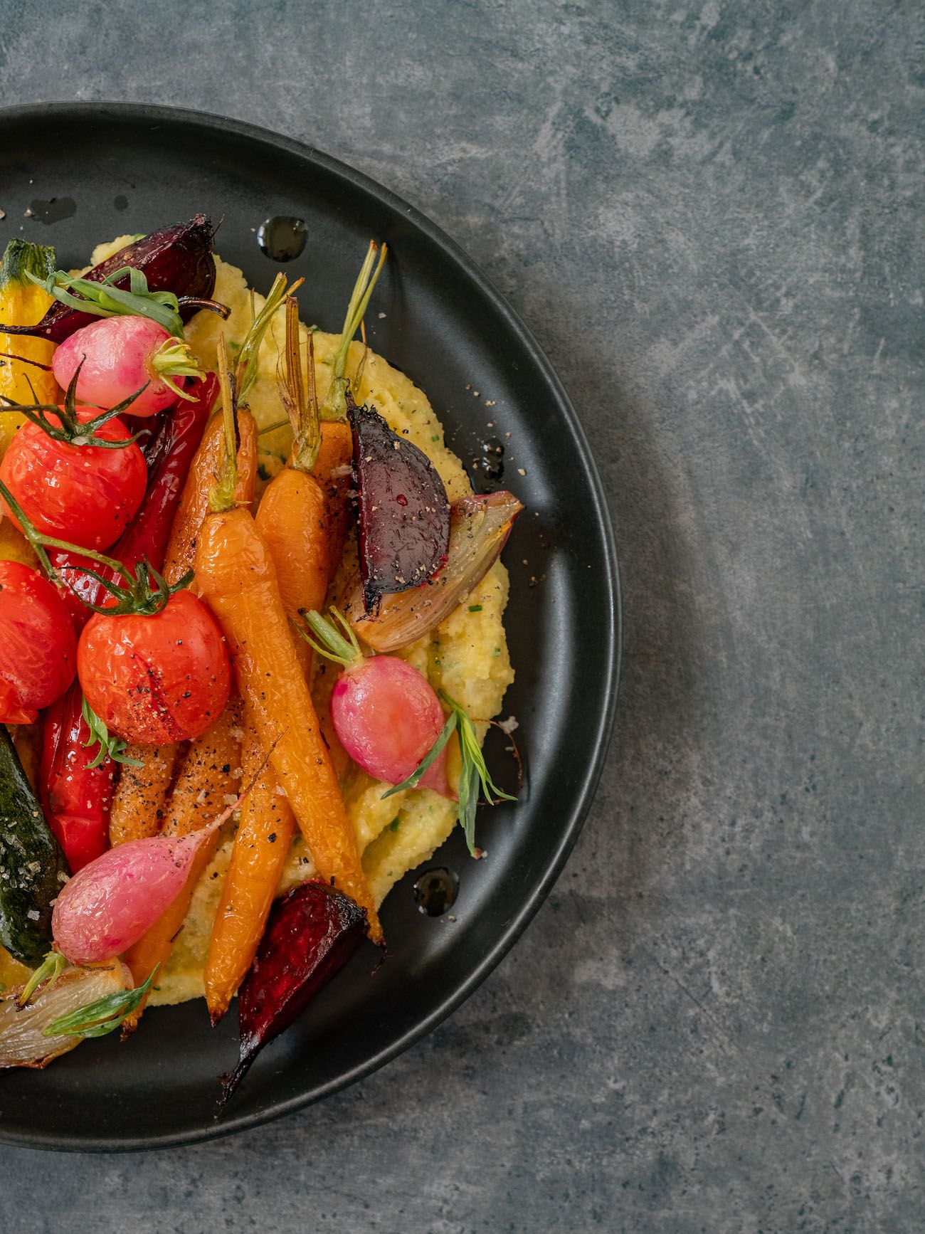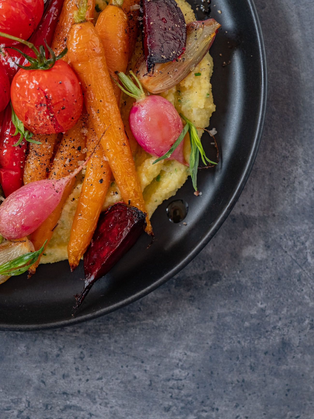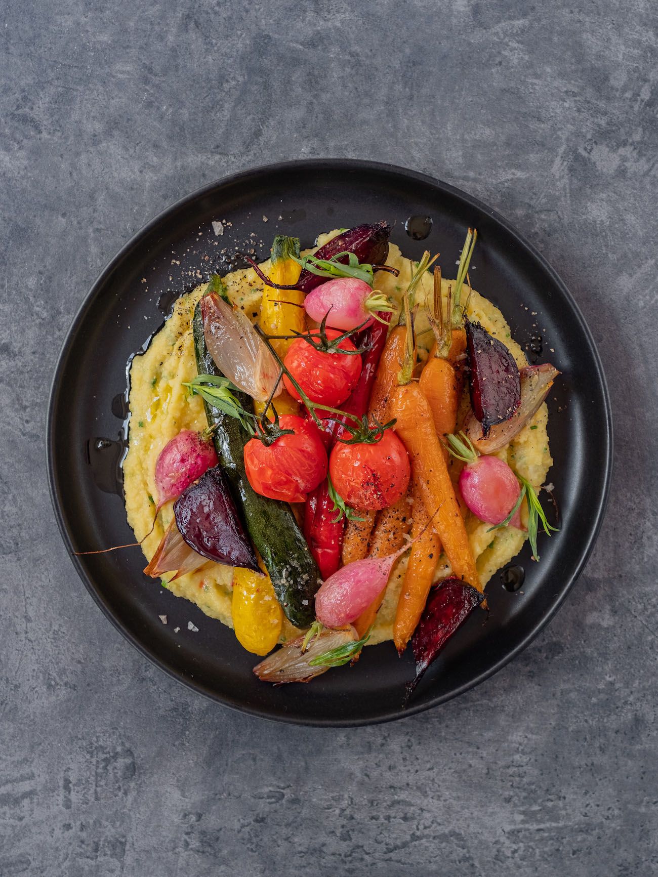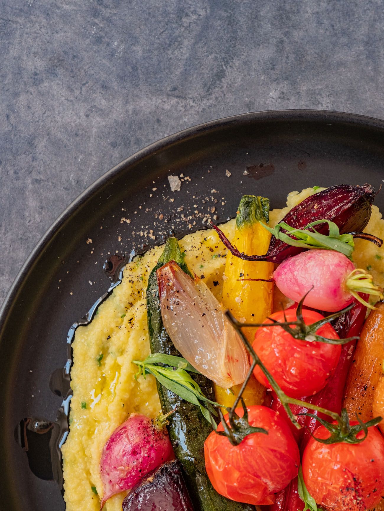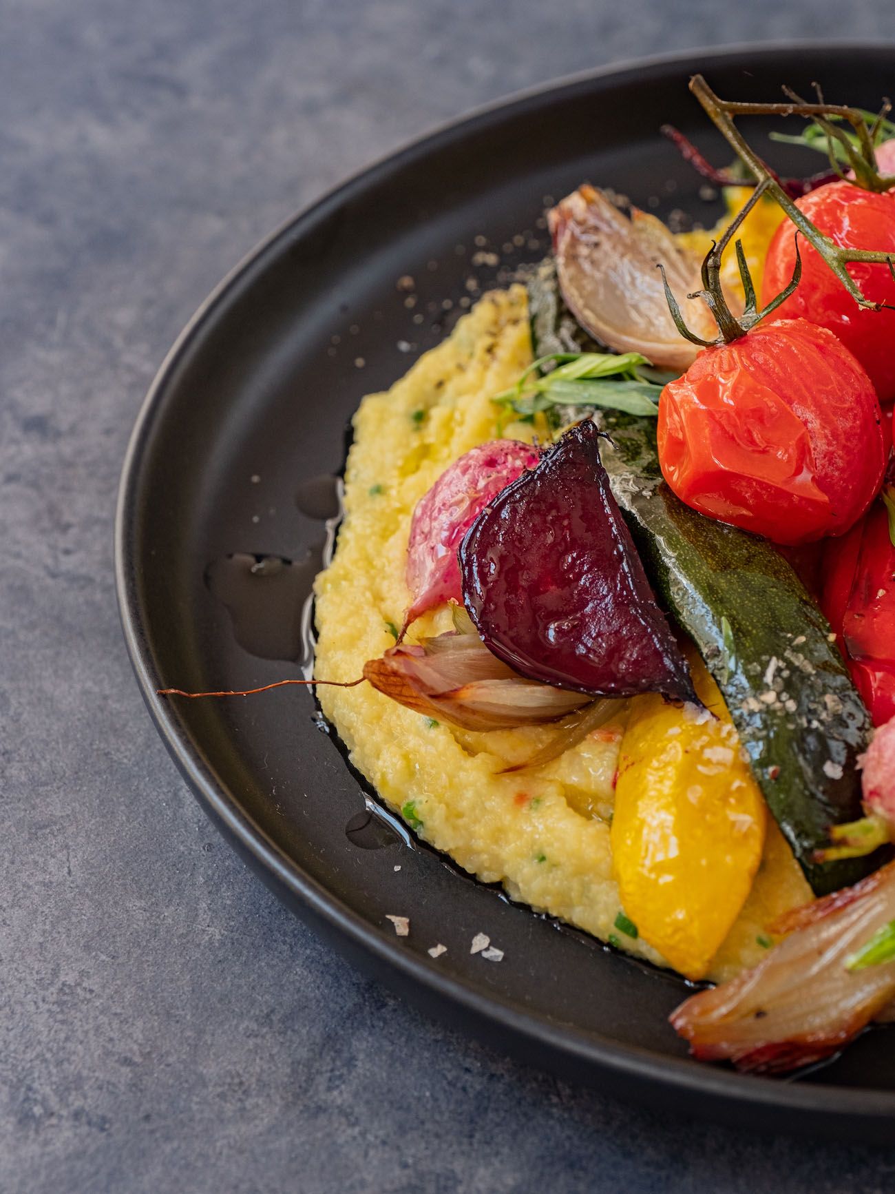 - Jetzt geht es auch schon ans Anrichten. Dafür die Polenta auf flache Teller geben und das Gemüse obenauf drapieren.