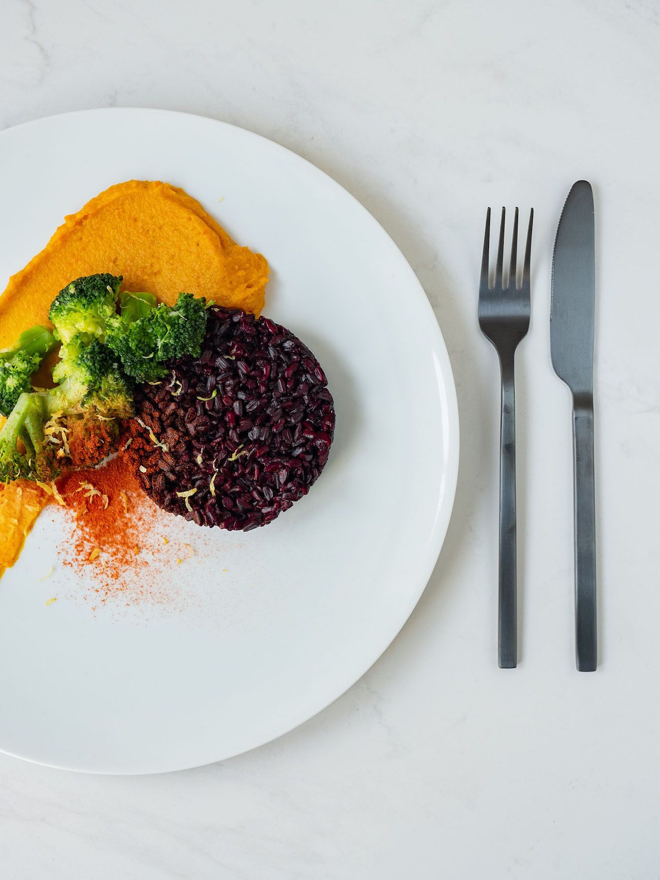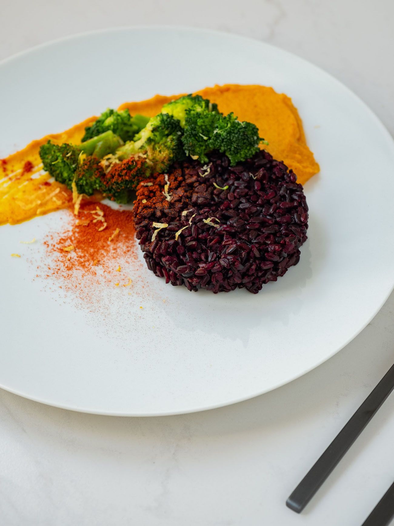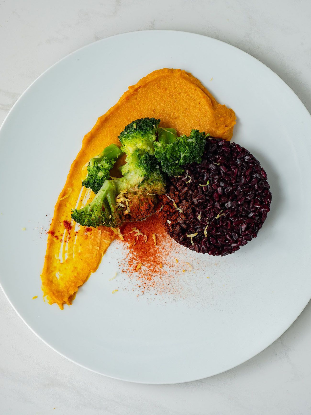 - Und nun kann auch schon angerichtet werden. Einfach ein Viertel des Kürbispürees auf den Teller geben und mit einem Löffel in einem Schwung verstreichen. Dann den Reis in den Servierring geben, ein paar der Brokkoliröschen auf das Püree legen und zum Schluss das Paprikapulver ins Sieb geben und etwas davon über das Püree und den Reis stäuben.