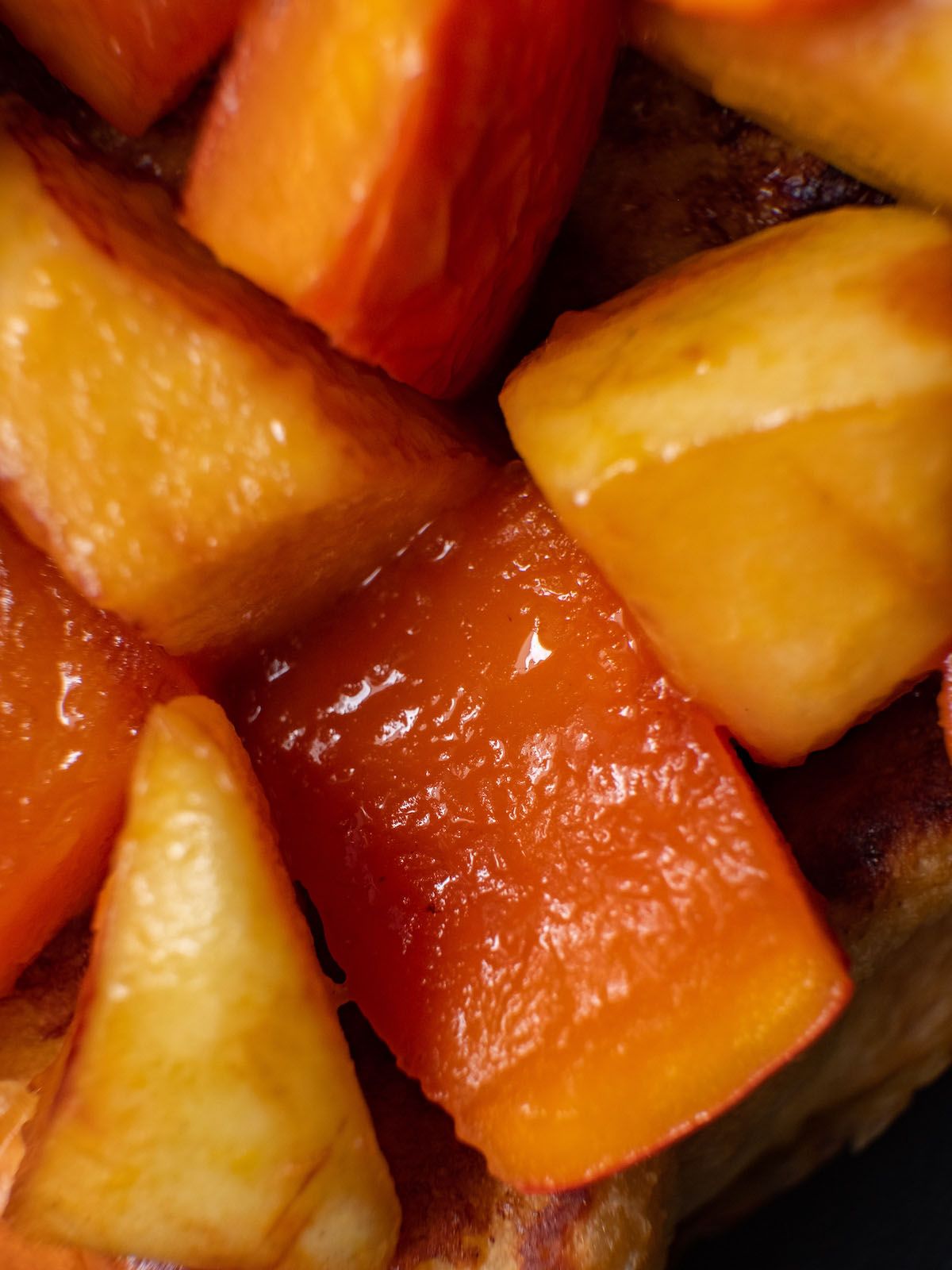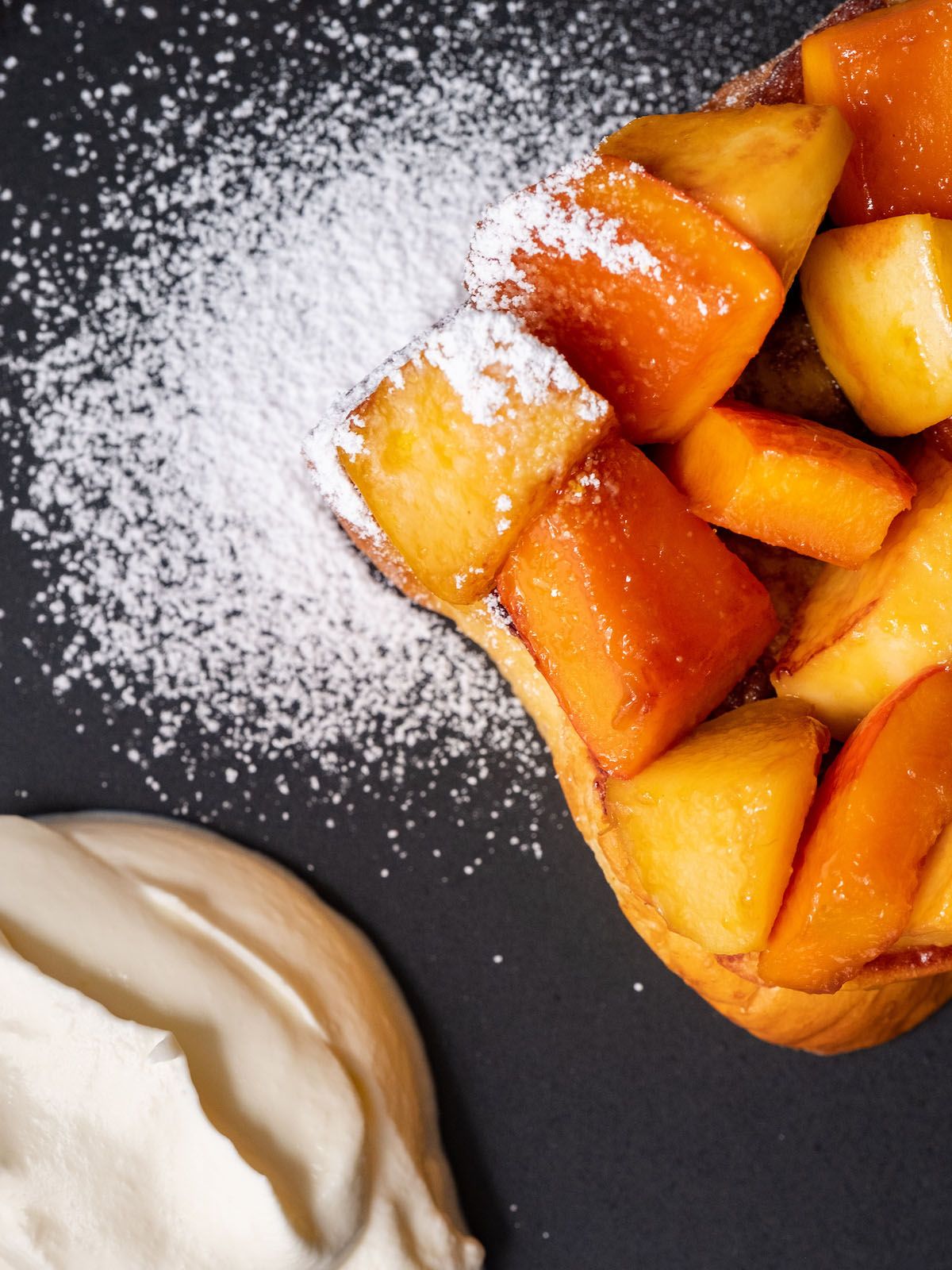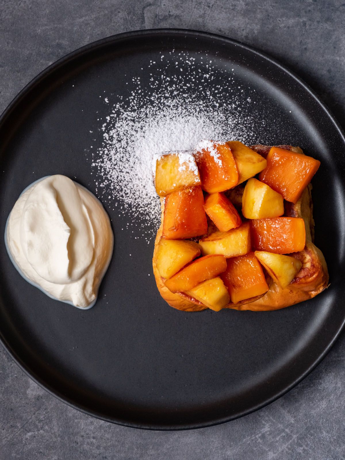 - Jetzt kann es auch schon ans Anrichten gehen. Dafür die French Toast Scheiben auf Teller legen und die karamellisierten Quitten- und Kürbisstücke darauf platzieren. Den restlichen Puderzucker in das kleine Sieb geben und eine Ecke des Toasts damit bestäuben. Ganz zum Schluss noch einen ordentlichen Klecks der angeschwipsten Sahne daneben platzieren und fertig ist das herbstliche Dessert.