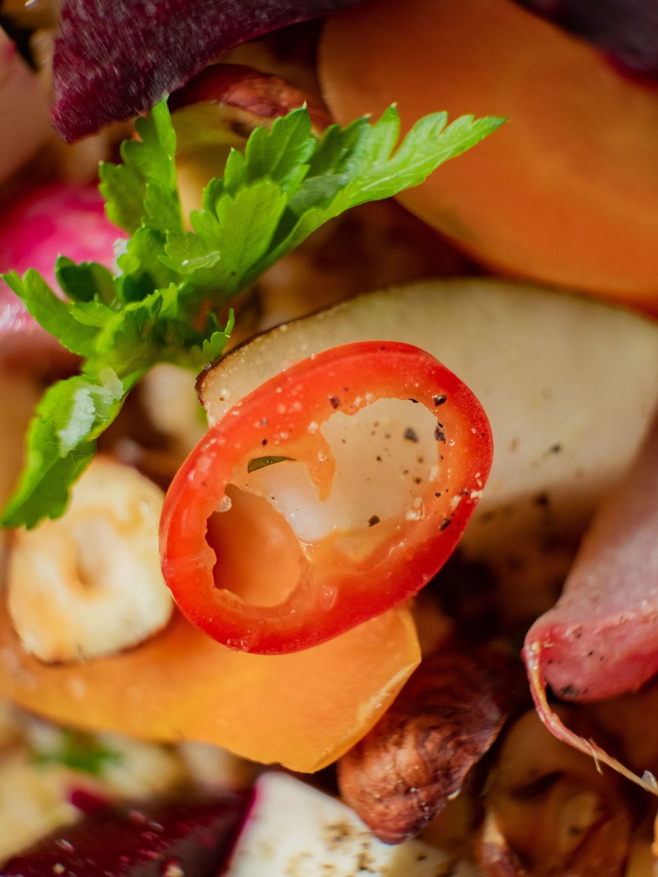 - Zum Schluss noch mit den gerösteten Haselnusshälften etwas Olivenöl, den Chiliringen und den Petersilienblättern garnieren und fertig ist der etwas andere Salat.