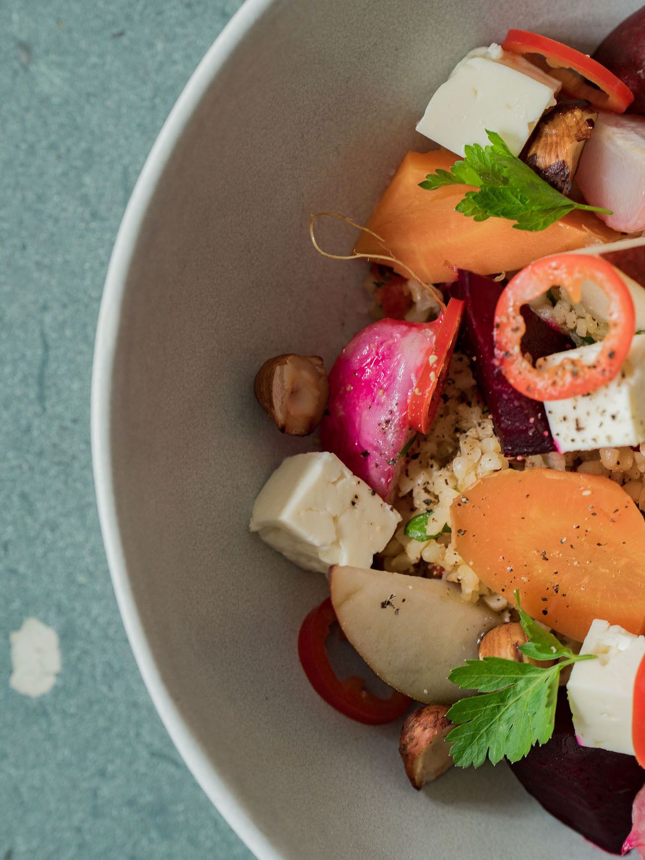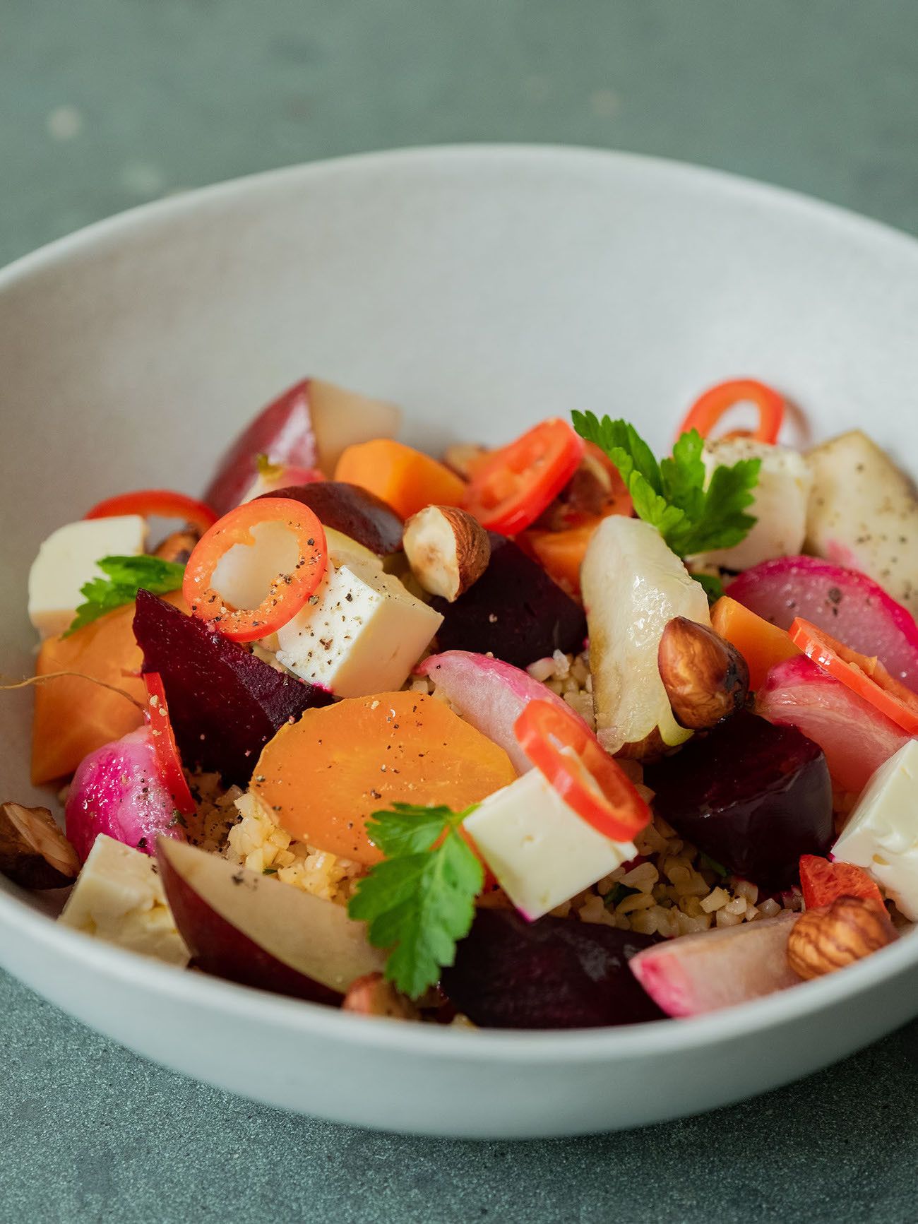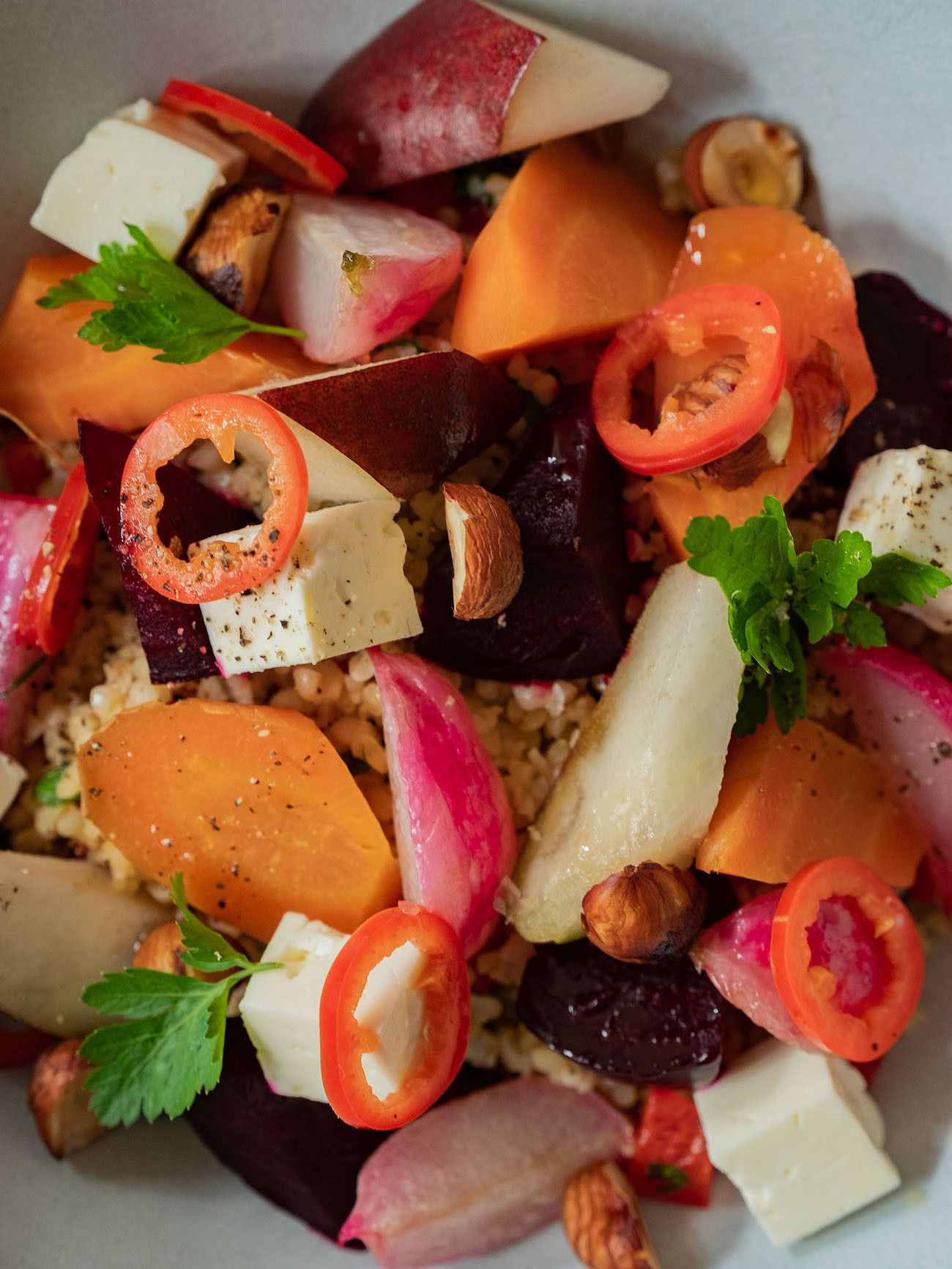 Zubereitung Gebackene Rote Bete und Karotten auf Bulgursalat mit Birne, Haselnüssen und Feta:
