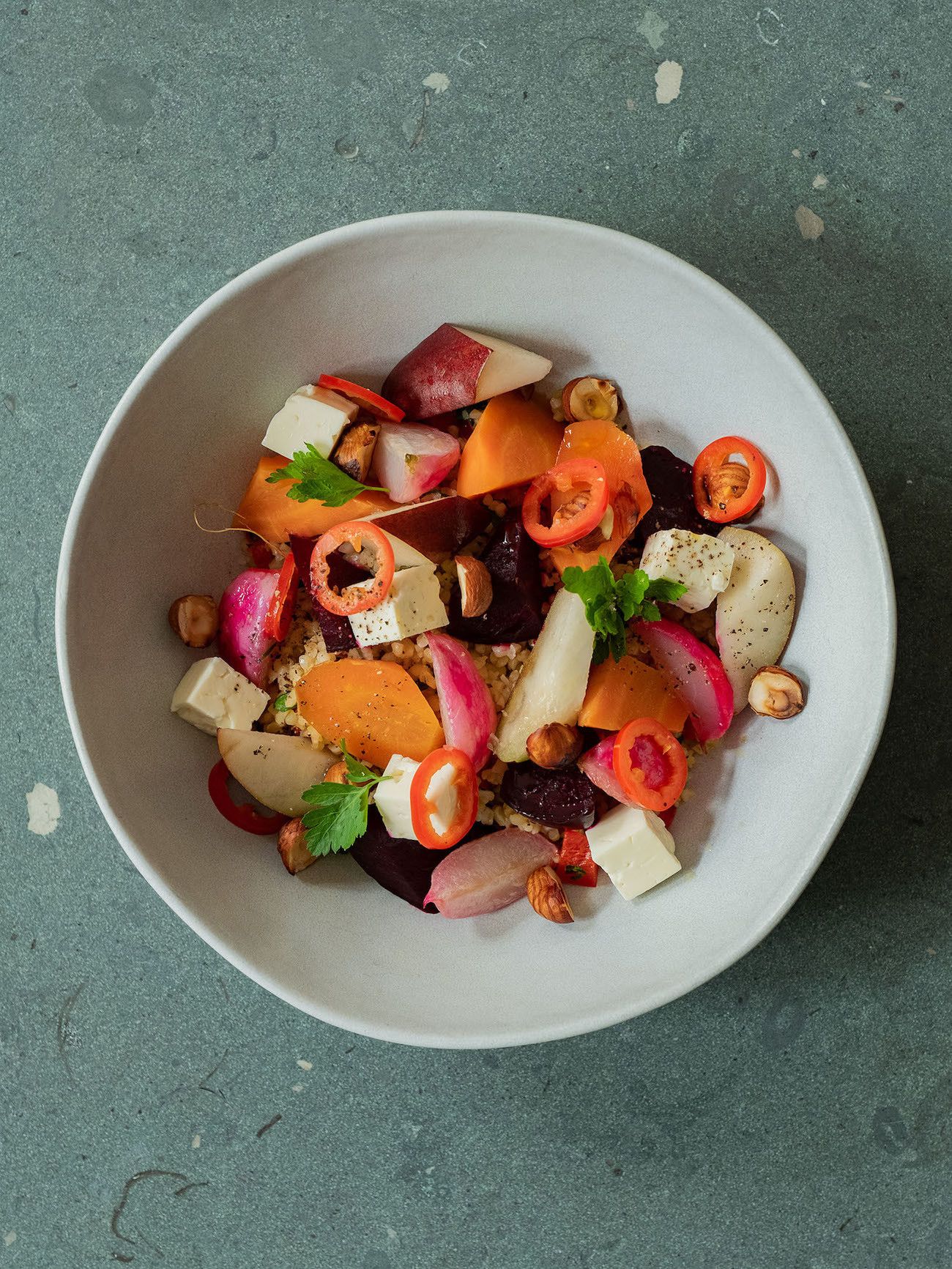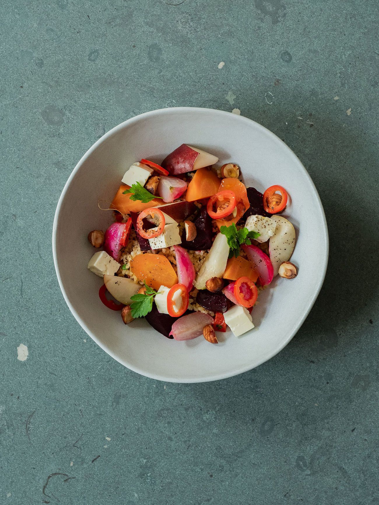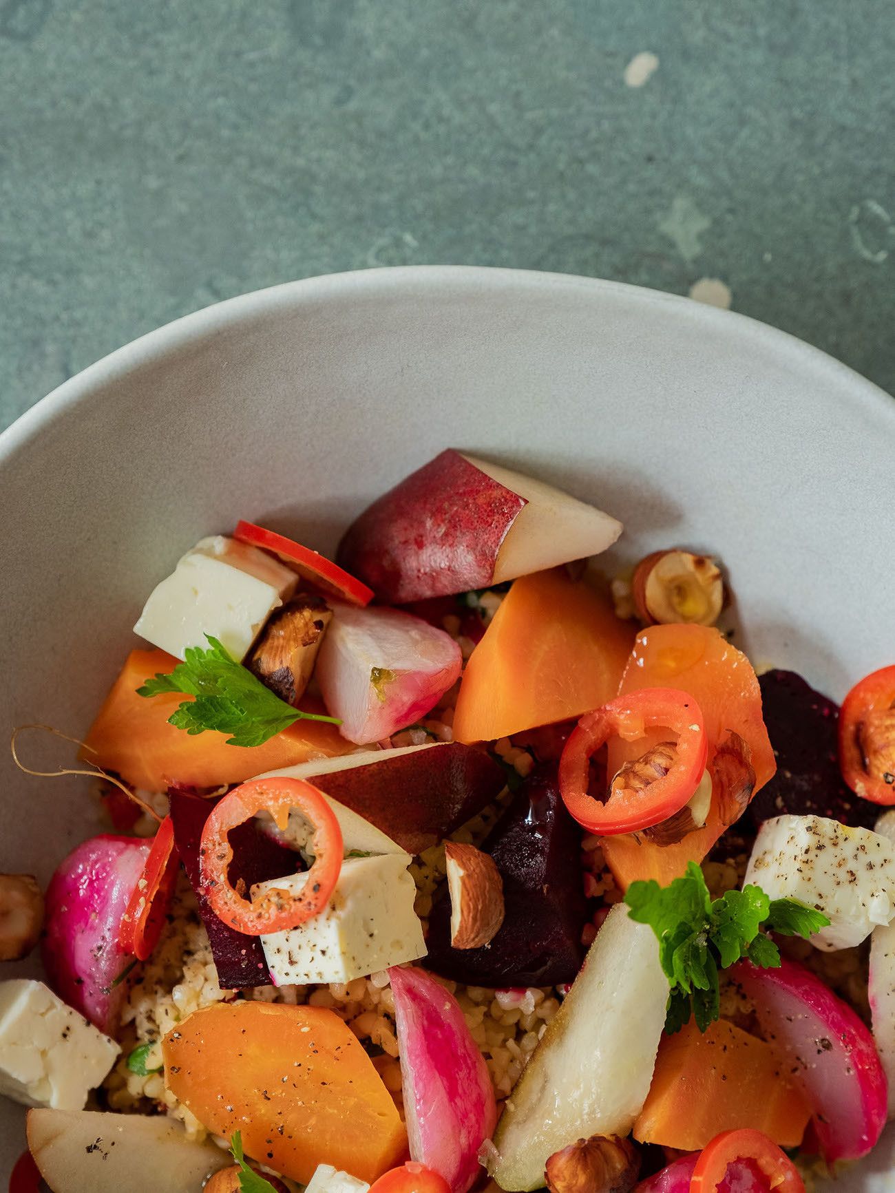 Zubereitung Gebackene Rote Bete und Karotten auf Bulgursalat mit Birne, Haselnüssen und Feta: