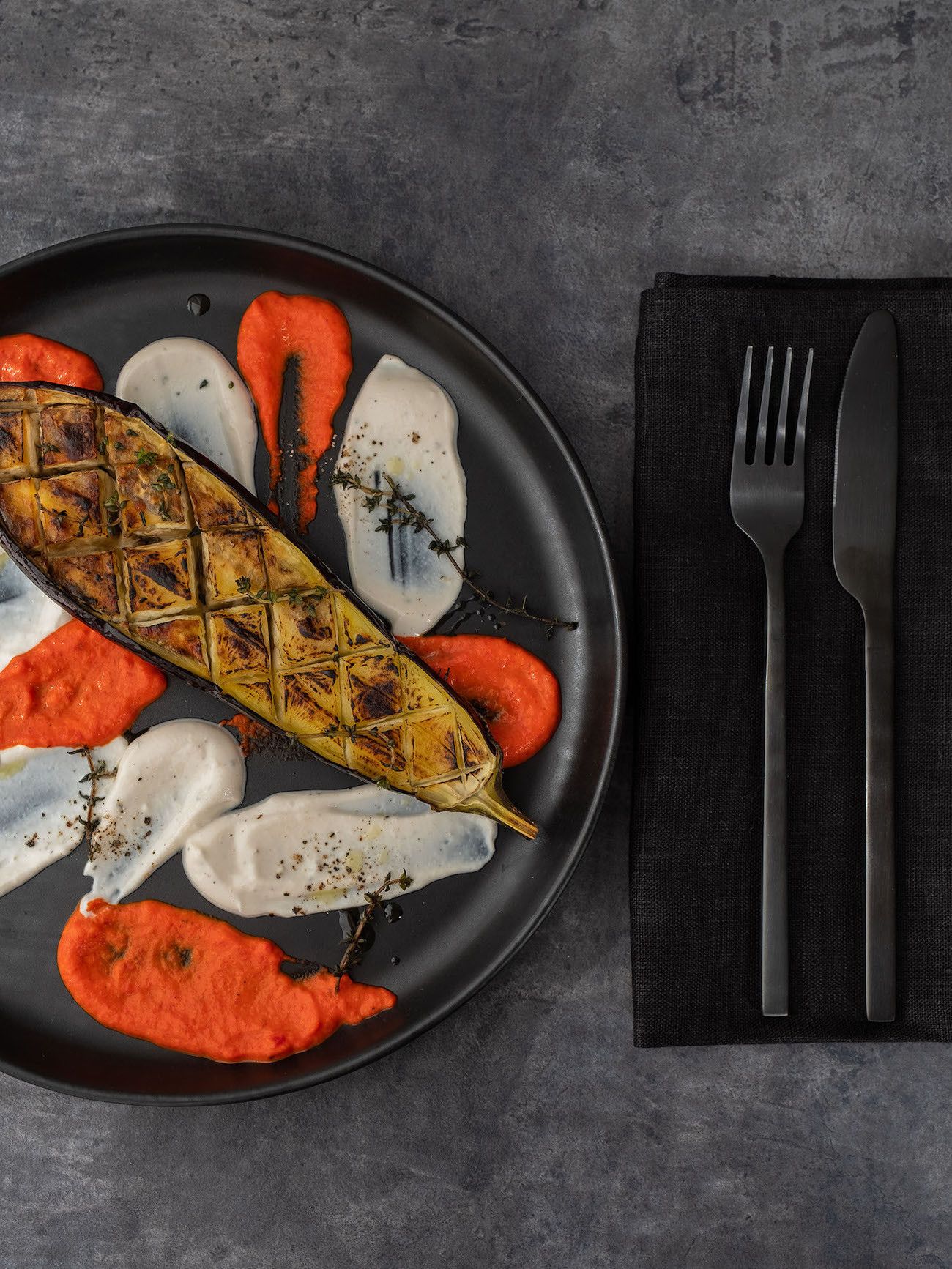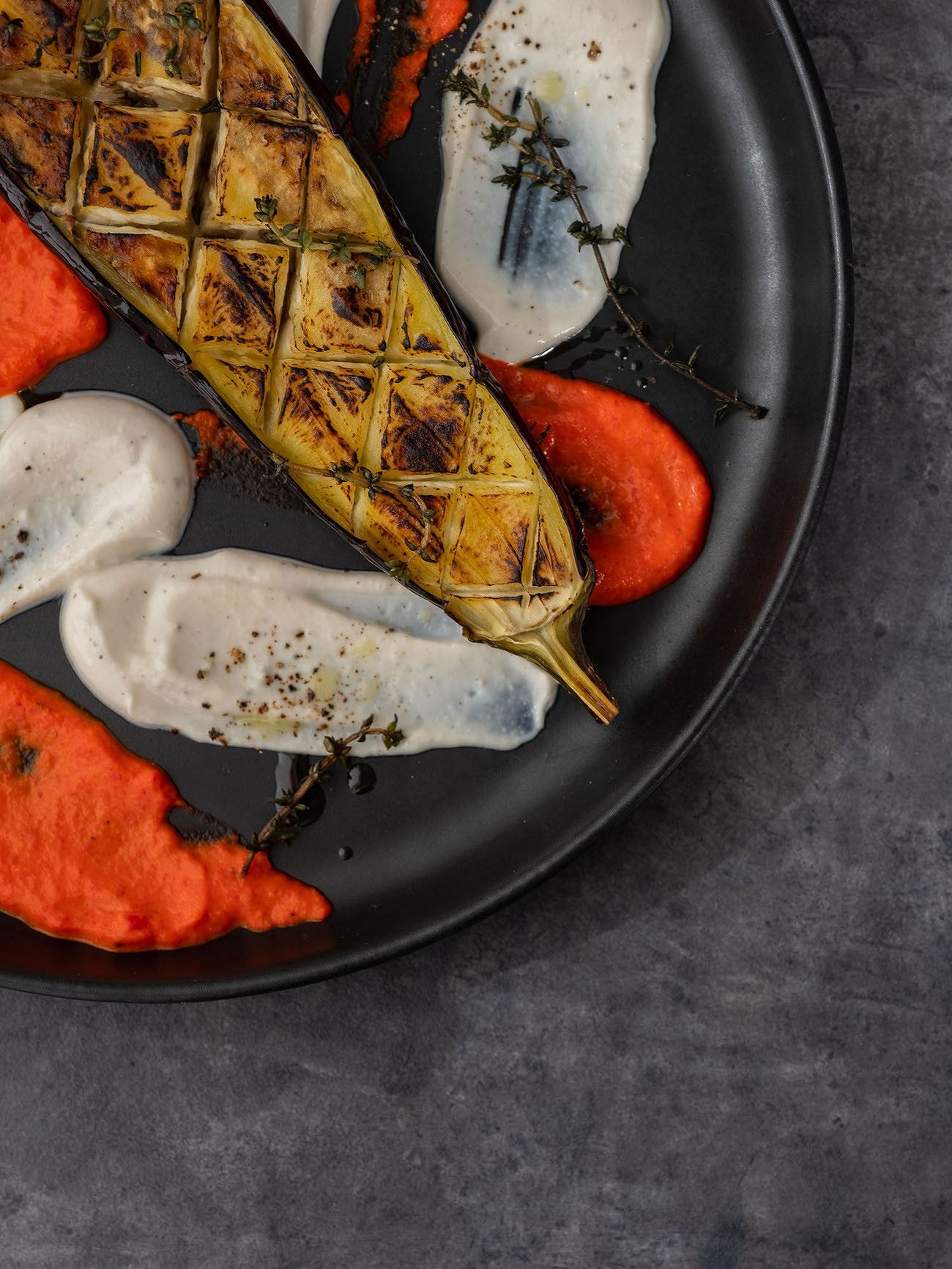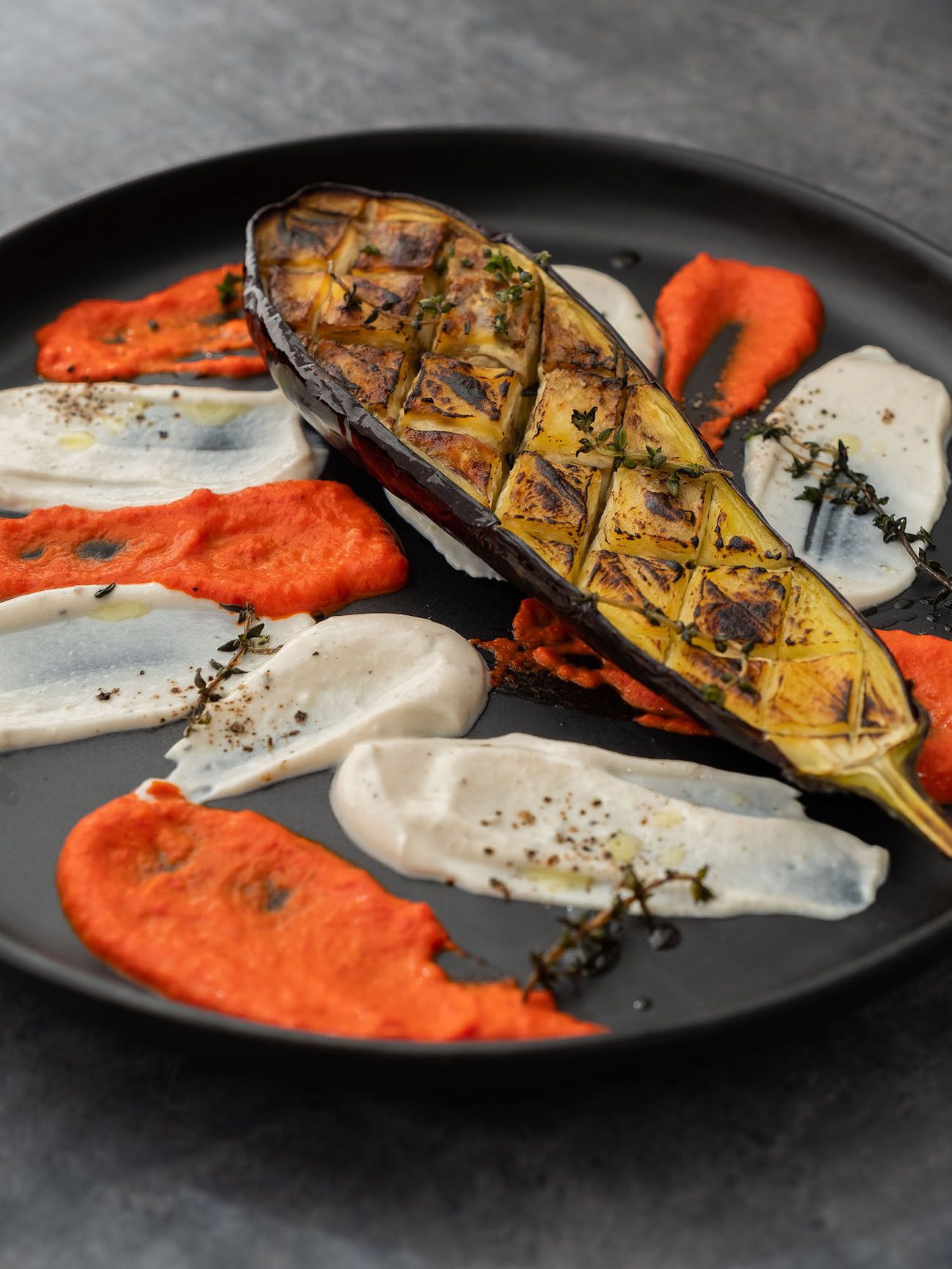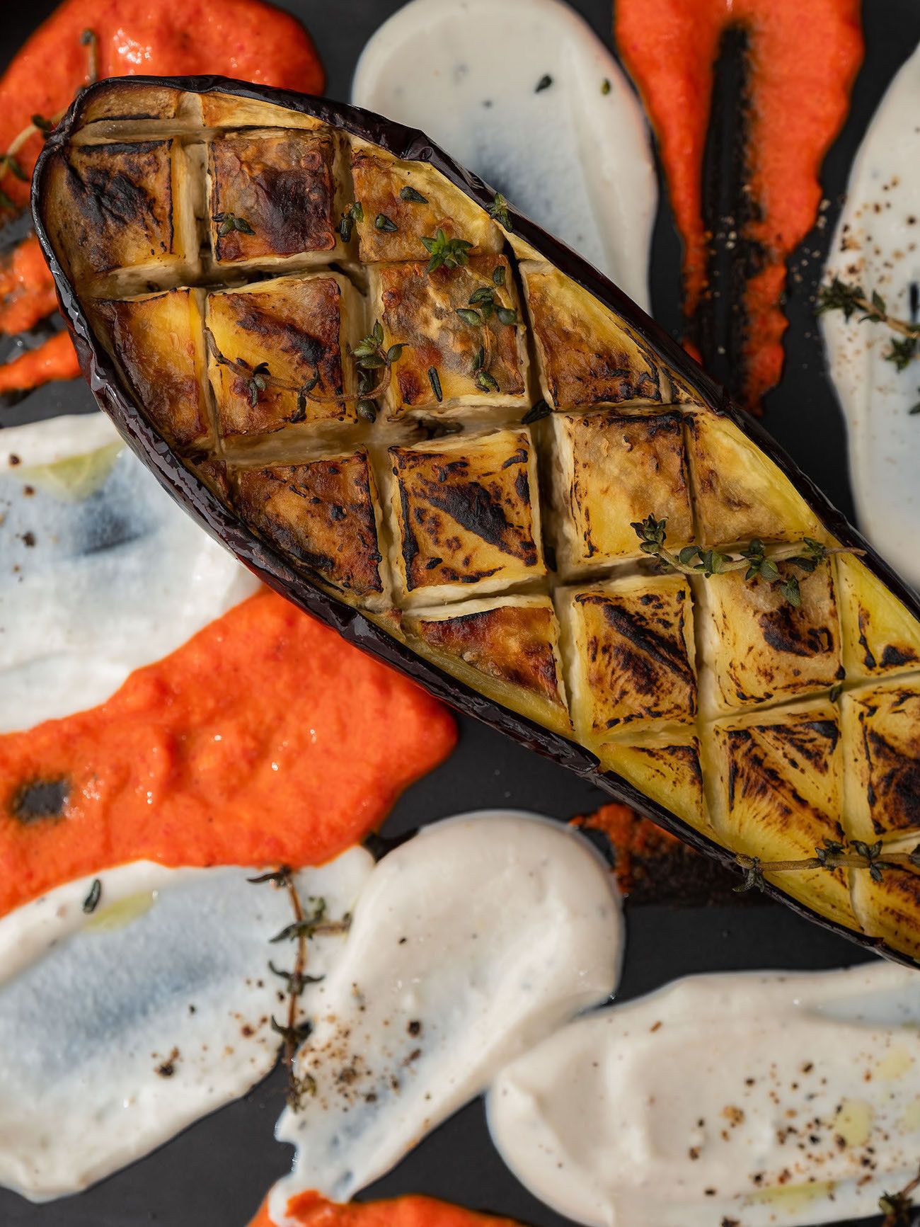 - Sind die Auberginenhälften weich und oben knusprig, kann angerichtet werden. Dafür mit einem Teelöffel einfach die Joghurt-Tahin Soße und den Paprika Dip auf den Tellern punktuell verteilen und kreuz und quer verstreichen. Dann noch die Auberginen Hälften auf die Teller geben und mit den knusprigen Thymianzweigen, etwas Olivenöl und Pfeffer garnieren.