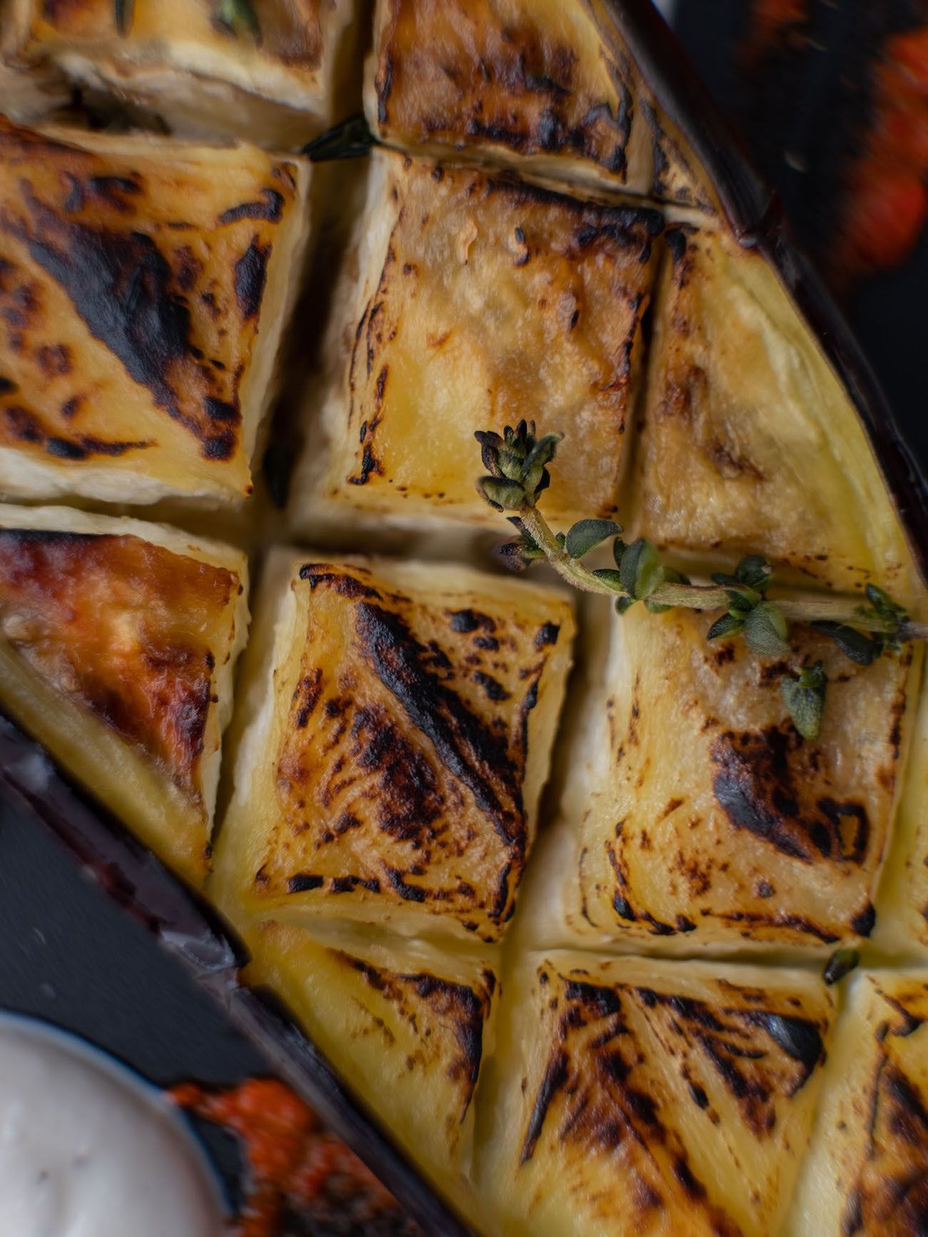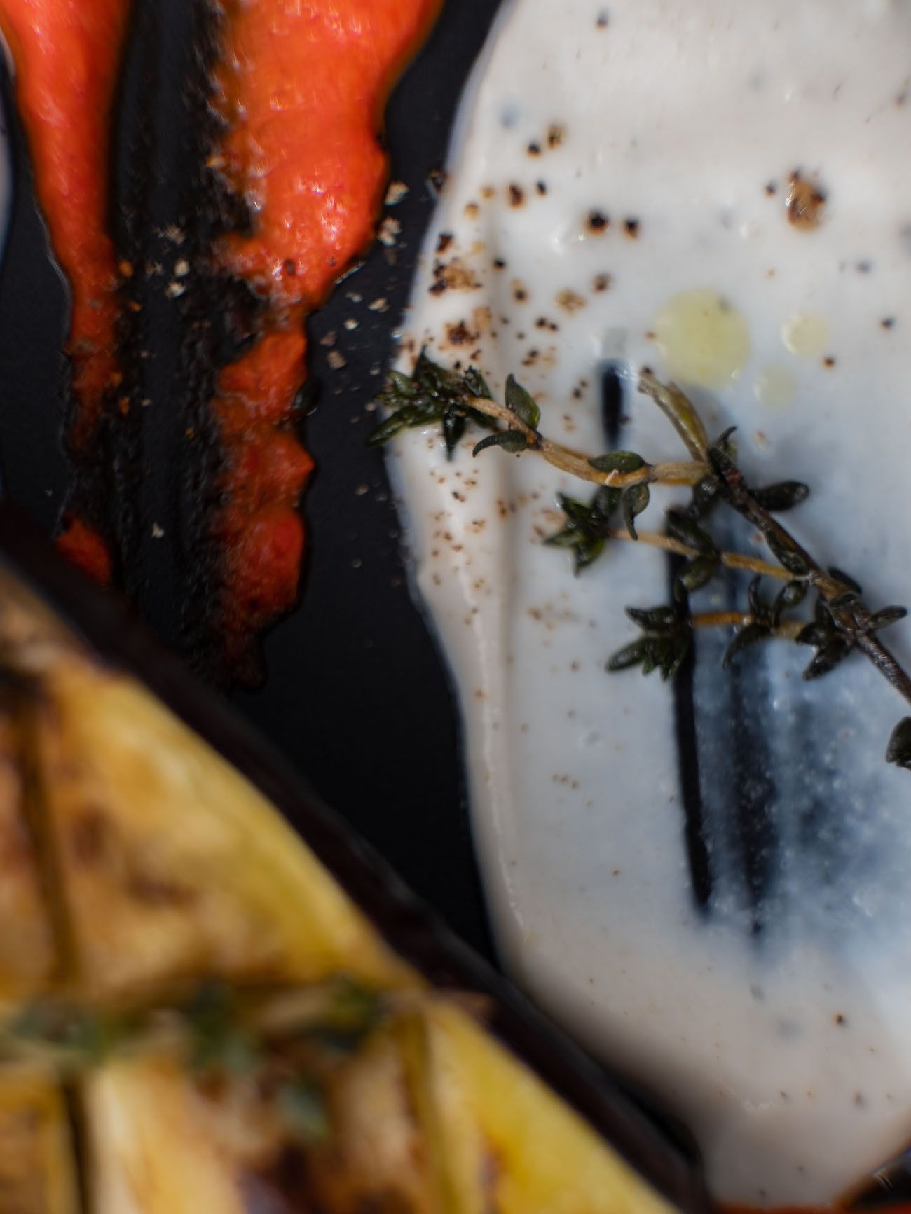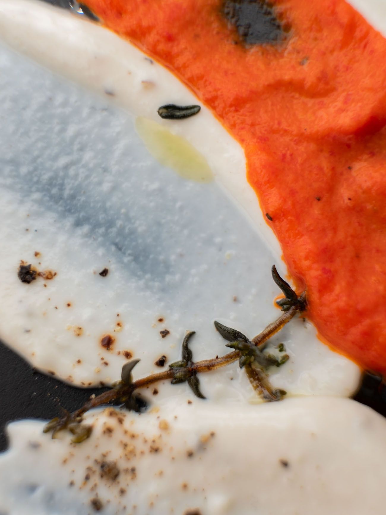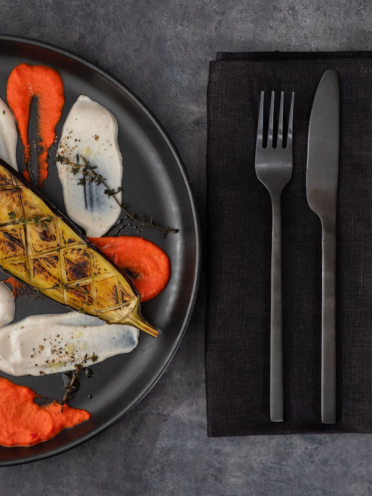 - Sind die Auberginenhälften weich und oben knusprig, kann angerichtet werden. Dafür mit einem Teelöffel einfach die Joghurt-Tahin Soße und den Paprika Dip auf den Tellern punktuell verteilen und kreuz und quer verstreichen. Dann noch die Auberginen Hälften auf die Teller geben und mit den knusprigen Thymianzweigen, etwas Olivenöl und Pfeffer garnieren.