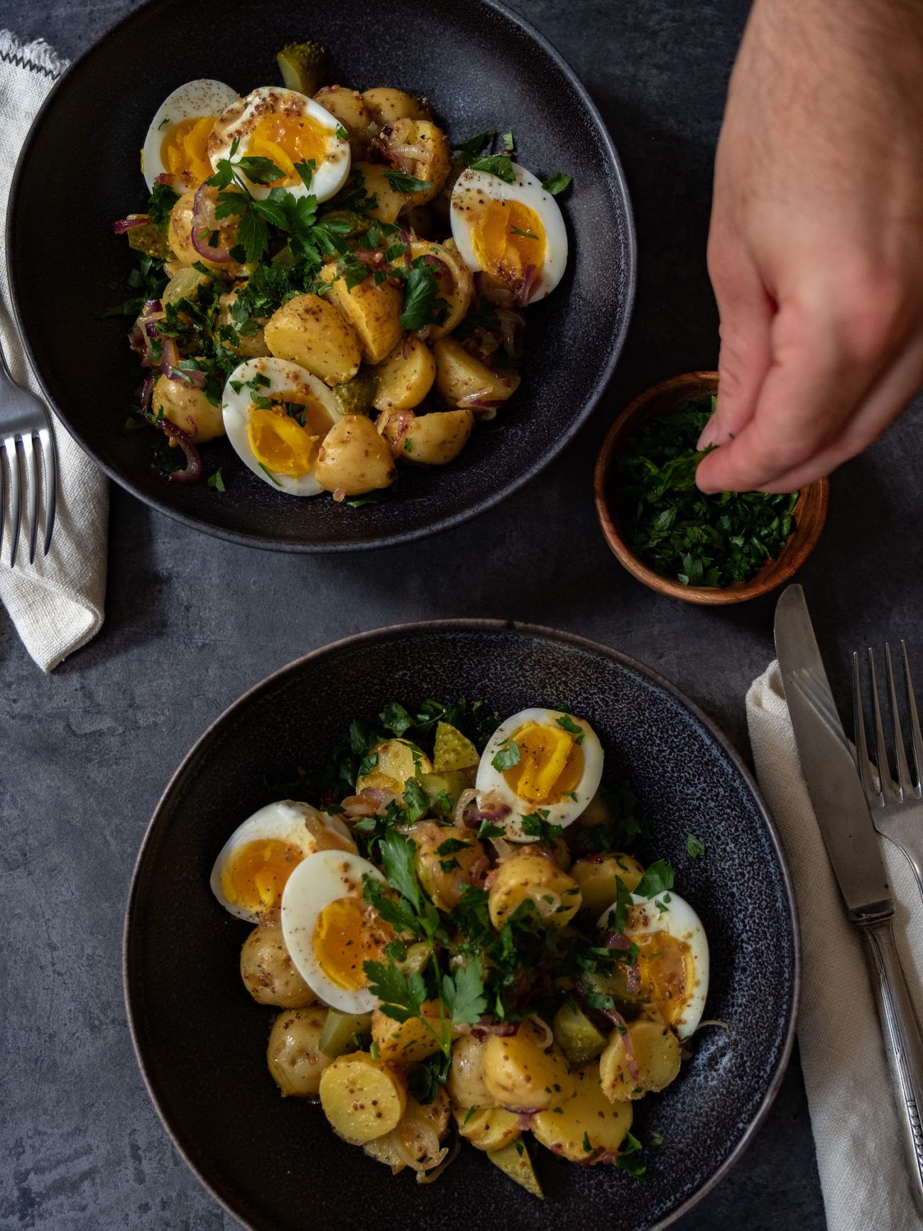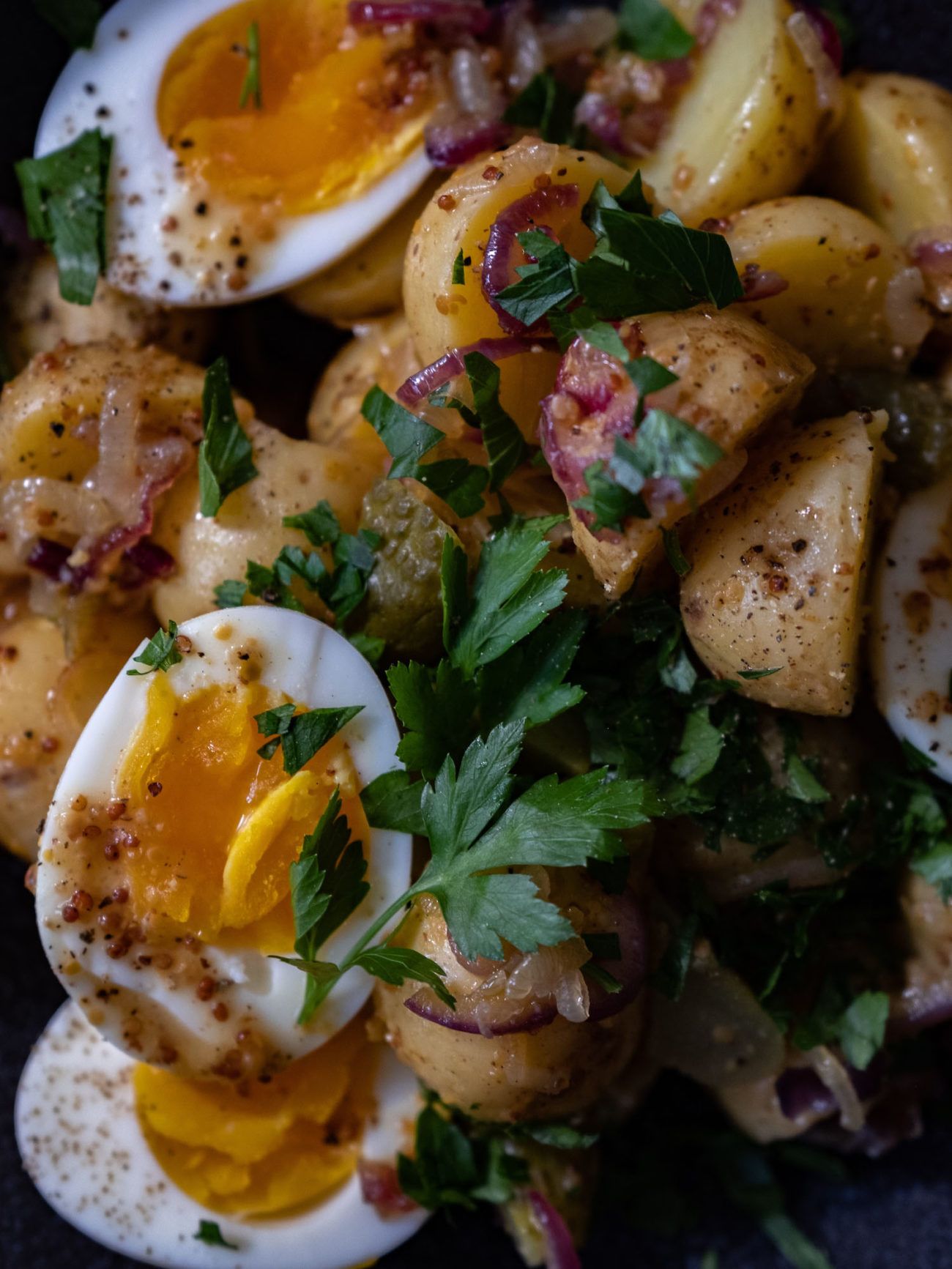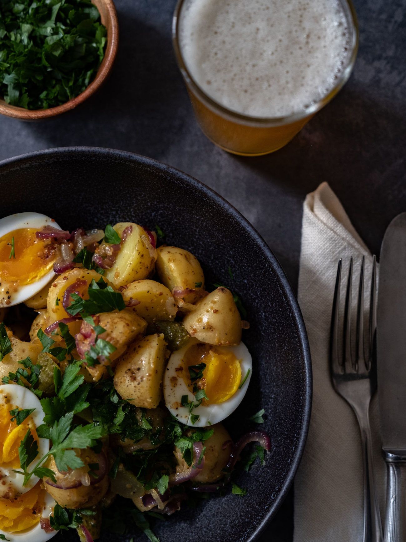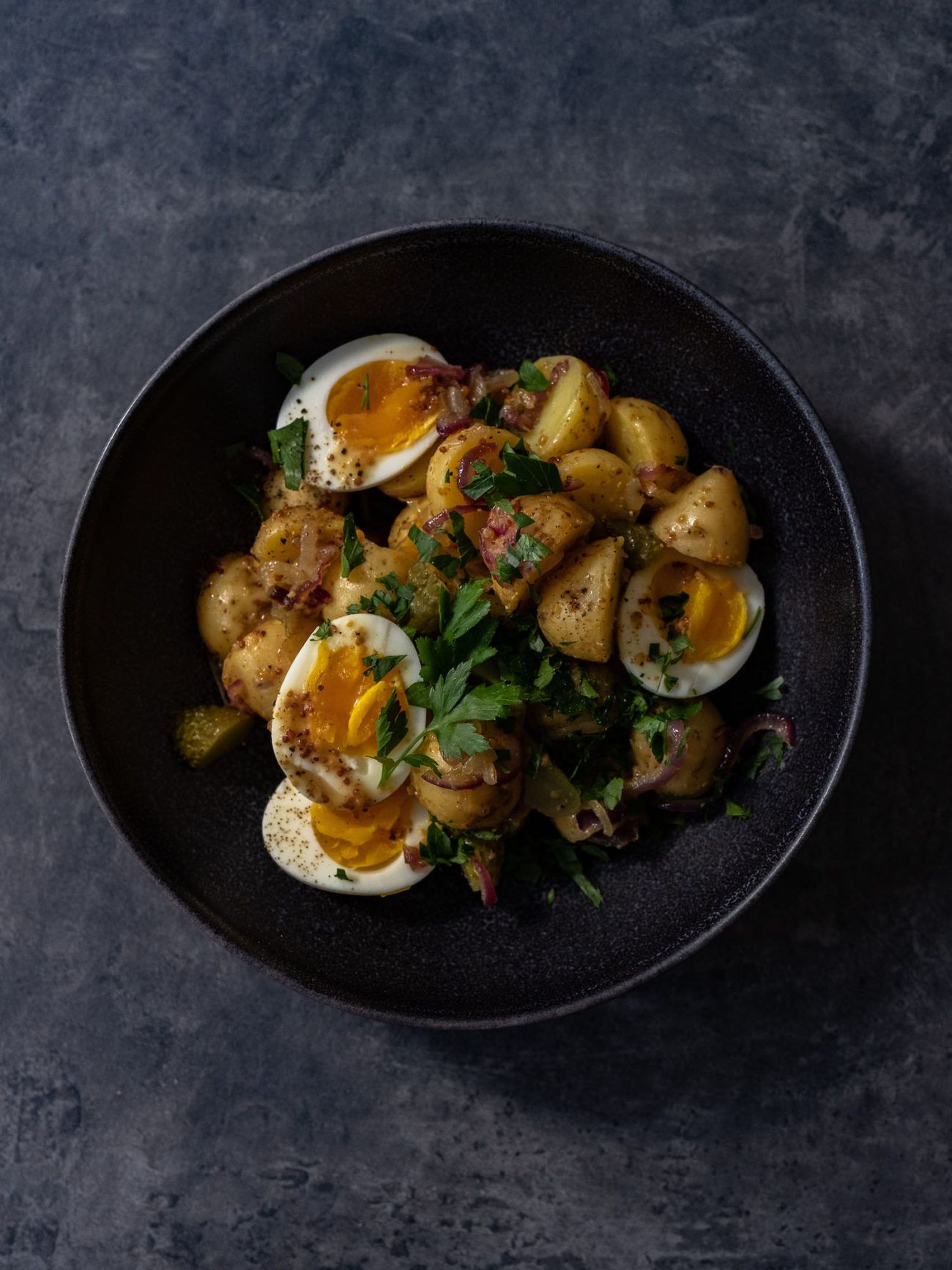 Aufgewachsen im Schwarzwald, gab es lange für mich nur einen, den echten und einzig wahren. Die Rede ist natürlich von badischem Kartoffelsalat. Kartoffeln, Brühe, Zwiebeln, Salz, Pfeffer, Senf, Essig und Öl; mehr brauchte es nicht, um mich glücklich zu machen, und bis heute ist dieses schlichte Gericht immer ein Highlight, wenn es richtig zubereitet wird. Aber auf meiner kulinarischen Entwicklungsreise musste ich mir eingestehen, es gibt so viele Möglichkeiten, Kartoffelsalat zuzubereiten, und sehr viele davon sind für mich ein Hochgenuss. Auch wenn die Variante aus meiner Kindheit immer die Nummer eins bleiben wird, gibt es noch viele weitere Positionen, die besetzt werden wollen. Und einen der oberen Plätze belegt auf jeden Fall das Rezept, welches ich Dir heute vorstellen will.