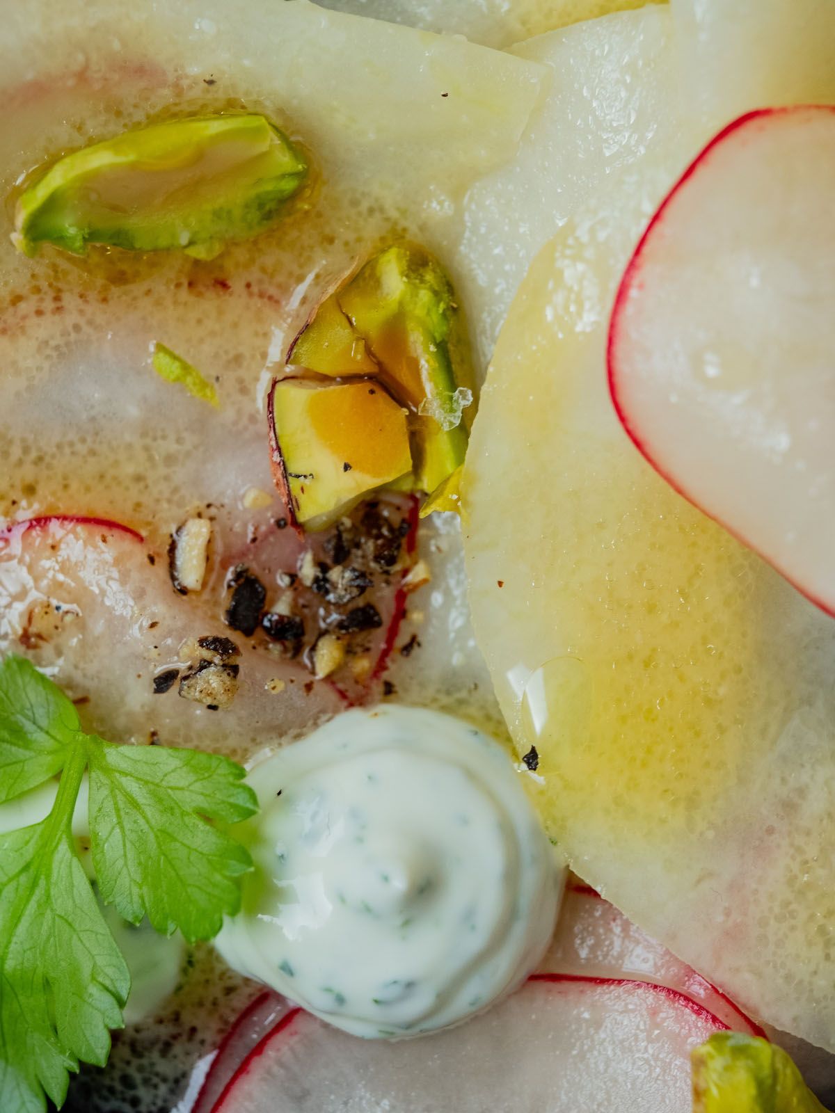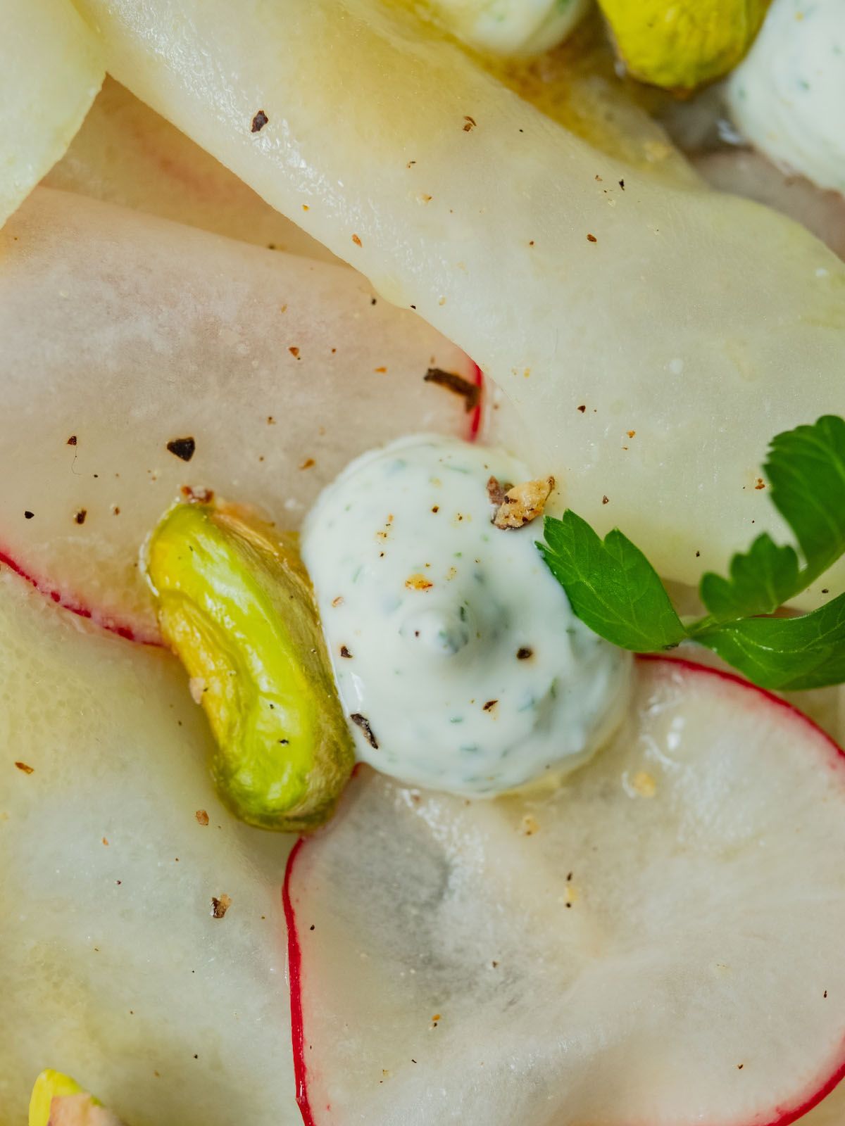Zubereitung Kohlrabi Carpaccio mit Radieschen, Pistazien, Petersilien-Schmand und Miso Dressing :