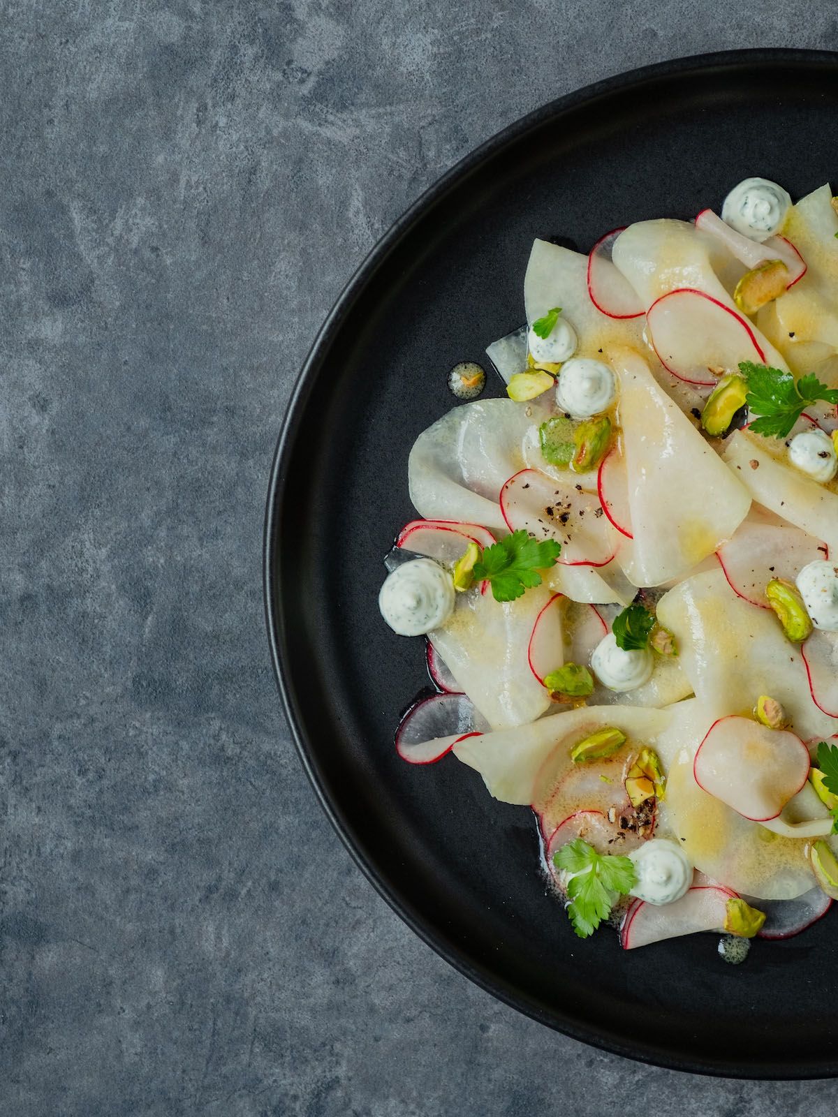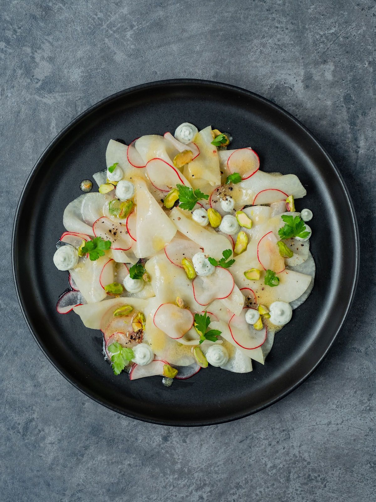 - Jetzt kann auch schon angerichtet werden. Dafür die marinierten Kohlrabi- und Radieschen Scheiben auf einem flachen Teller drapieren, die Pistazien darüber verteilen, mit einem Löffel oder der Dosierflasche den Petersilien-Schmand punktuell darauf geben und mit den übrig gebliebene Petersilienblättern und frisch gemahlenem schwarzem Pfeffer garnieren.