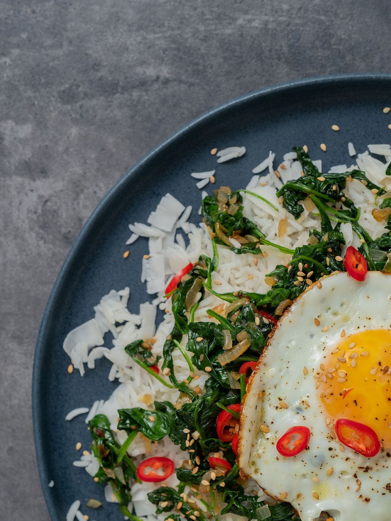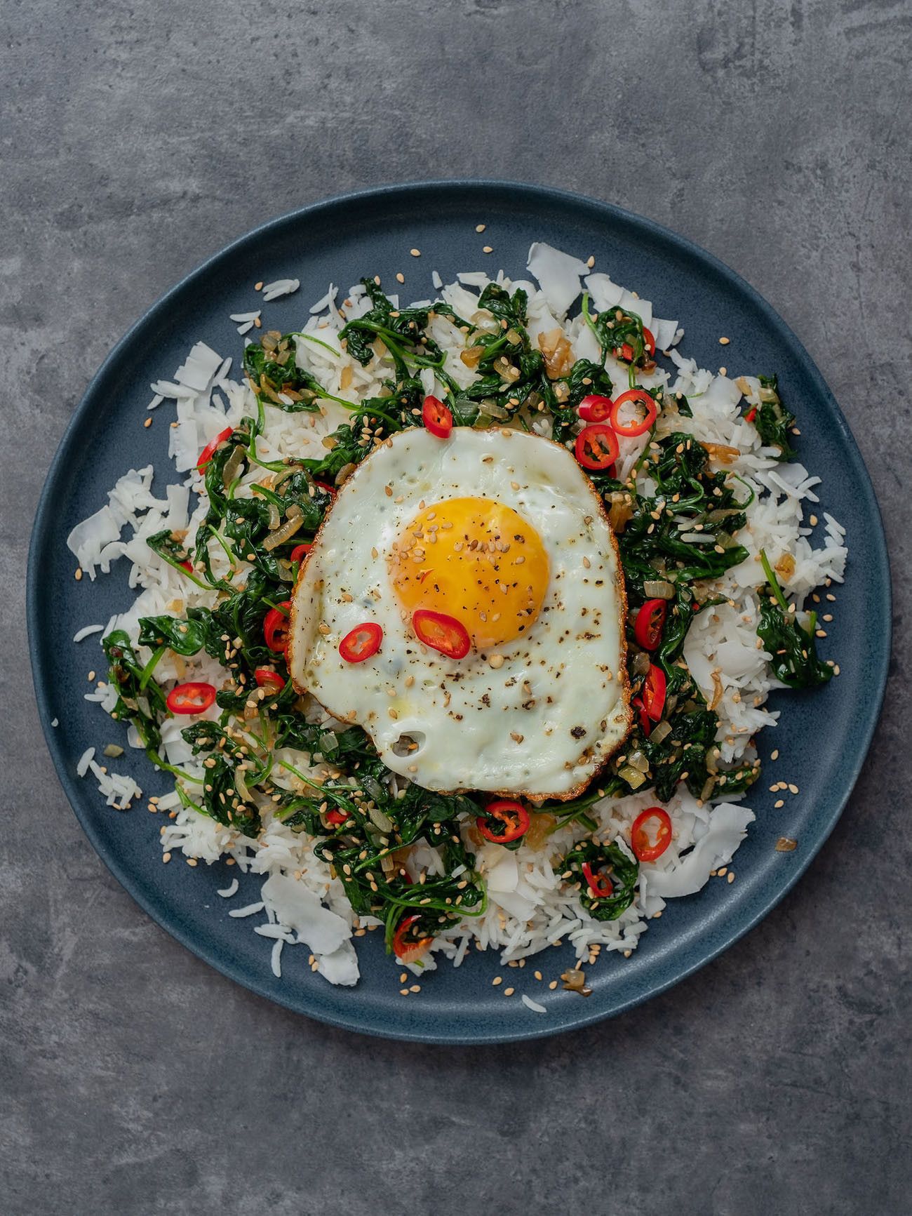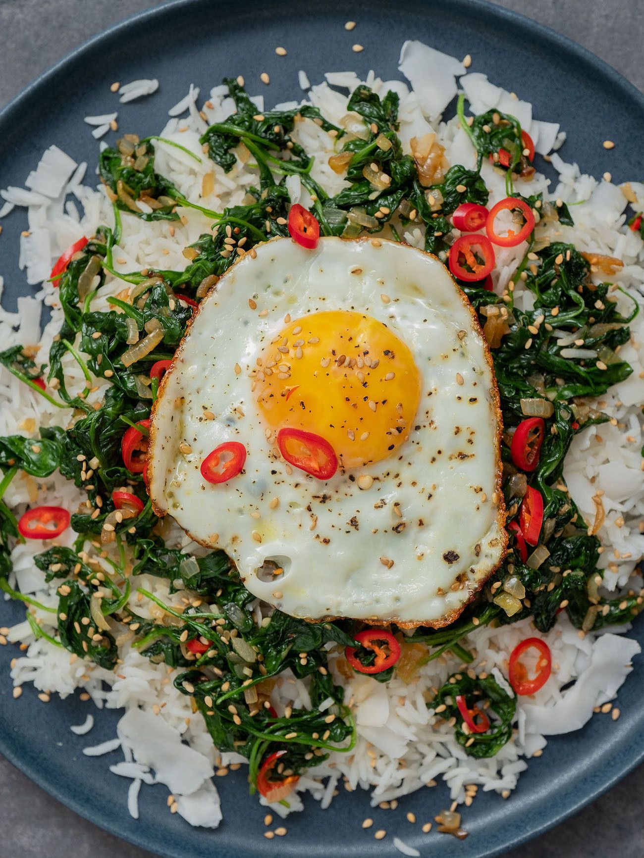 - Im nächsten Schritt den Reis auf Teller oder Schüsseln verteilen, den Spinat und das Spiegelei obenauf legen und mit dem restlichen Sesam und Kokosflocken, sowie den Chiliringen garnieren.