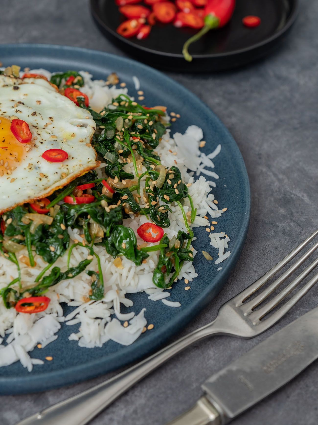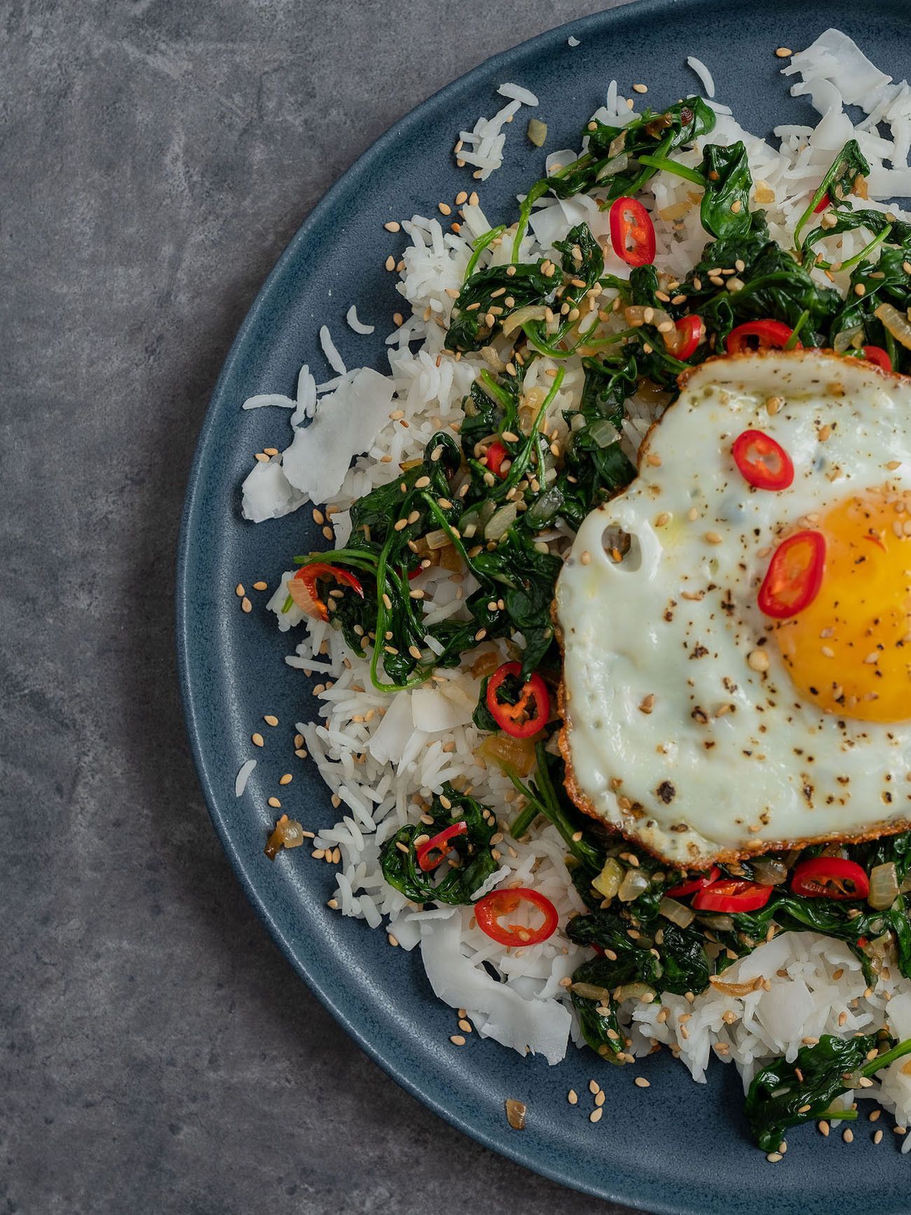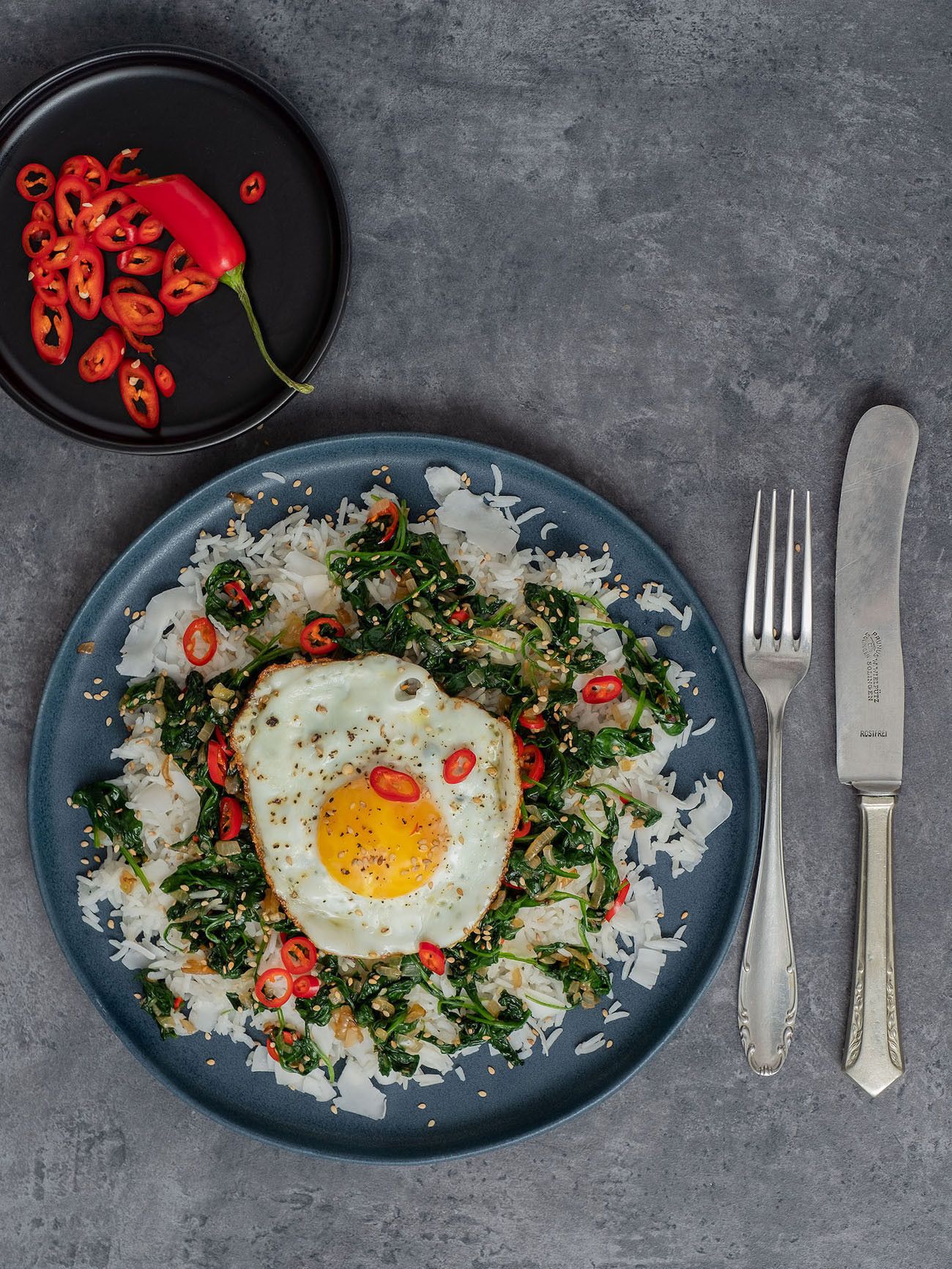 - Im nächsten Schritt den Reis auf Teller oder Schüsseln verteilen, den Spinat und das Spiegelei obenauf legen und mit dem restlichen Sesam und Kokosflocken, sowie den Chiliringen garnieren.