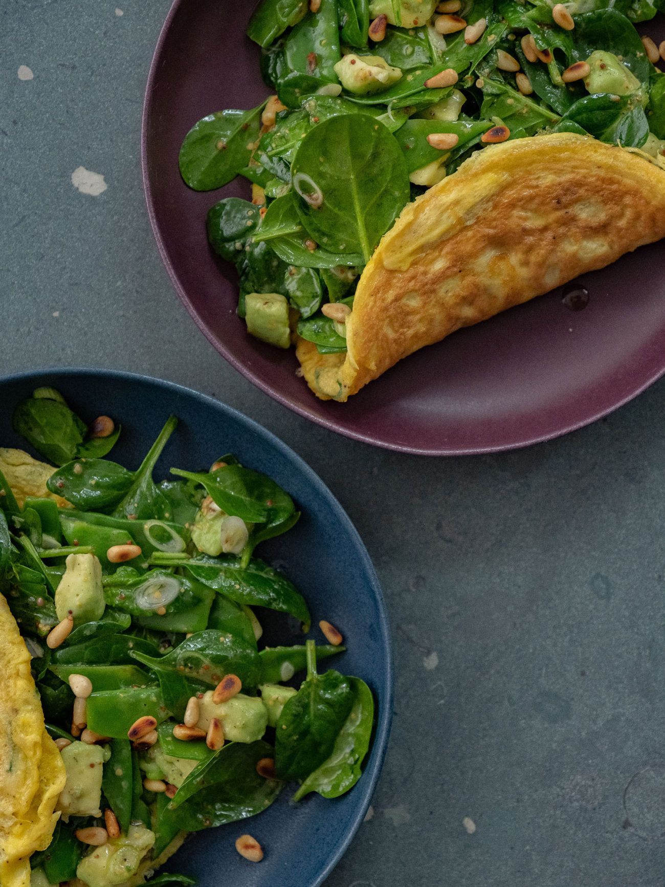 - Anschließend die Omeletts auf Teller geben, den Salat darauf verteilen und vorsichtig zusammenfalten.