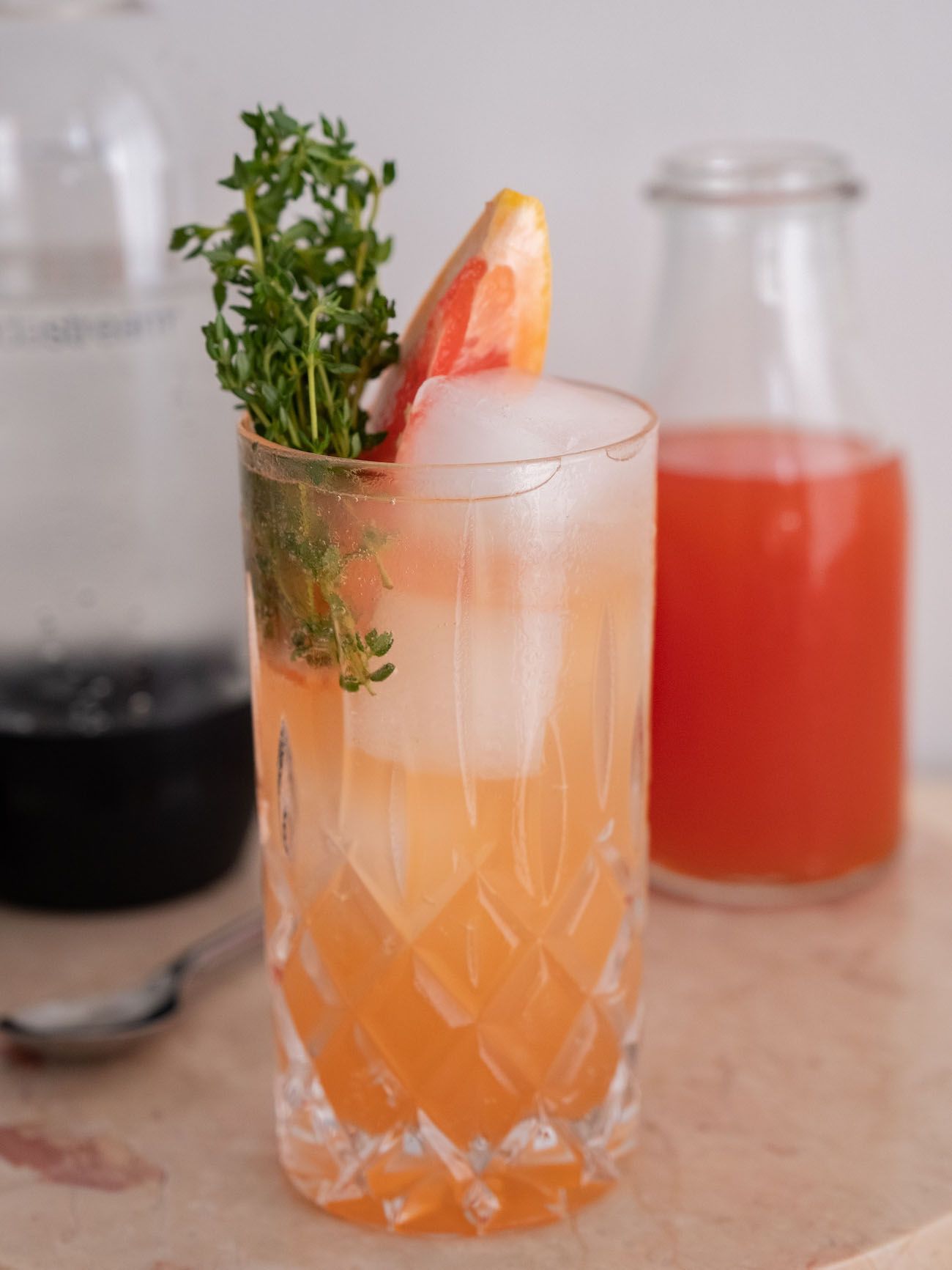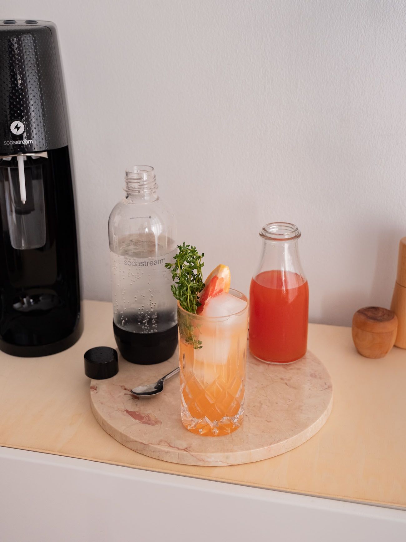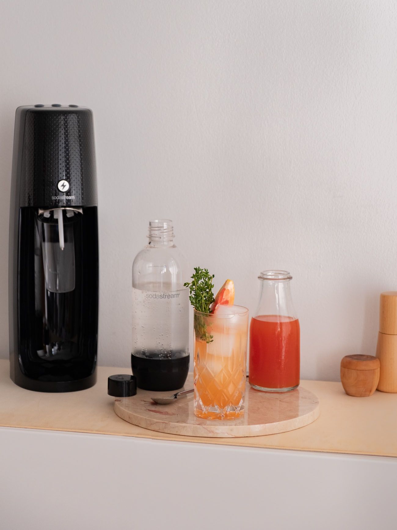 Ich erinnere mich noch ziemlich genau, wie fasziniert ich war, als meine Eltern das erste Gerät nach Hause brachten, das aus Leitungswasser Sprudel machte. Meine gesamte Jugend war also dominiert von frischem Schwarzwälder Quellwasser direkt aus dem Wasserhahn mit Kohlensäure versetzt und diversen Säften und selbst gemachten Sirupen aus den unterschiedlichsten Früchten, Blüten und Kräutern. Legendäre und super leckere Varianten, an die ich mich heute noch erinnere oder die sogar immer noch von meiner großartigen Mutter hergestellt werden, sind zum Beispiel Zitrone-Holunderblüte oder Zitrone-Salbei. Aber fast genauso wichtig wie ein guter Sirup ist auch das mit Kohlensäure versetzte Wasser für eine leckere und erfrischende Limonade. Das Aufschäumen und Prickeln beim Trinken gehört irgendwie zum perfekten Trinkgenuss vor allem im Sommer für mich dazu. Und genau das kann ich dank Soda Stream nun endlich wieder genießen, ganz ohne mir Flaschen aus dem nächstgelegenen Supermarkt nach Hause zu schleppen und die leeren Pfandflaschen wieder zurückbringen zu müssen. Ich frage mich im Nachhinein, wie ich ohne den Soda Stream Easy One Touch nur so lange auskommen konnte. Das in schlichtem schwarz gehaltene Gerät macht eine großartige Figur in meiner Küche und liefert auf Knopfdruck und ohne großen Aufwand in Windeseile drei unterschiedliche Stärken an Sprudel. Leicht perlend, Medium und natürlich stark prickelnd. Ich bin mehr als glücklich über unseren neuen und doch irgendwie altbekannten Familienzuwachs und mache mir jetzt erstmal ein Glas Pink Grapefruit-Zitronenthymian Limo. Wenn du auch Lust auf dieses erfrischende Sommergetränk bekommen hast, hier für dich das Rezept.