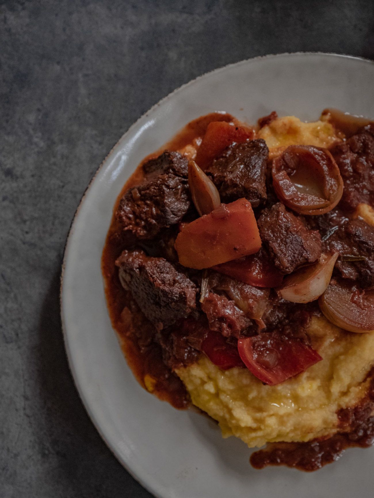 - Die Polenta auf Tellern oder Schüsseln verteilen und das Fleisch und Gemüse darauf geben.