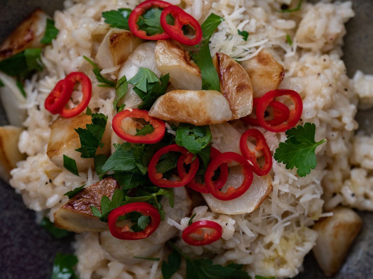 - Nun den restliche Parmesan darüber streuen und die Topinamburstücke, die gehackte Petersilie und die Chilischeiben darauf garnieren.