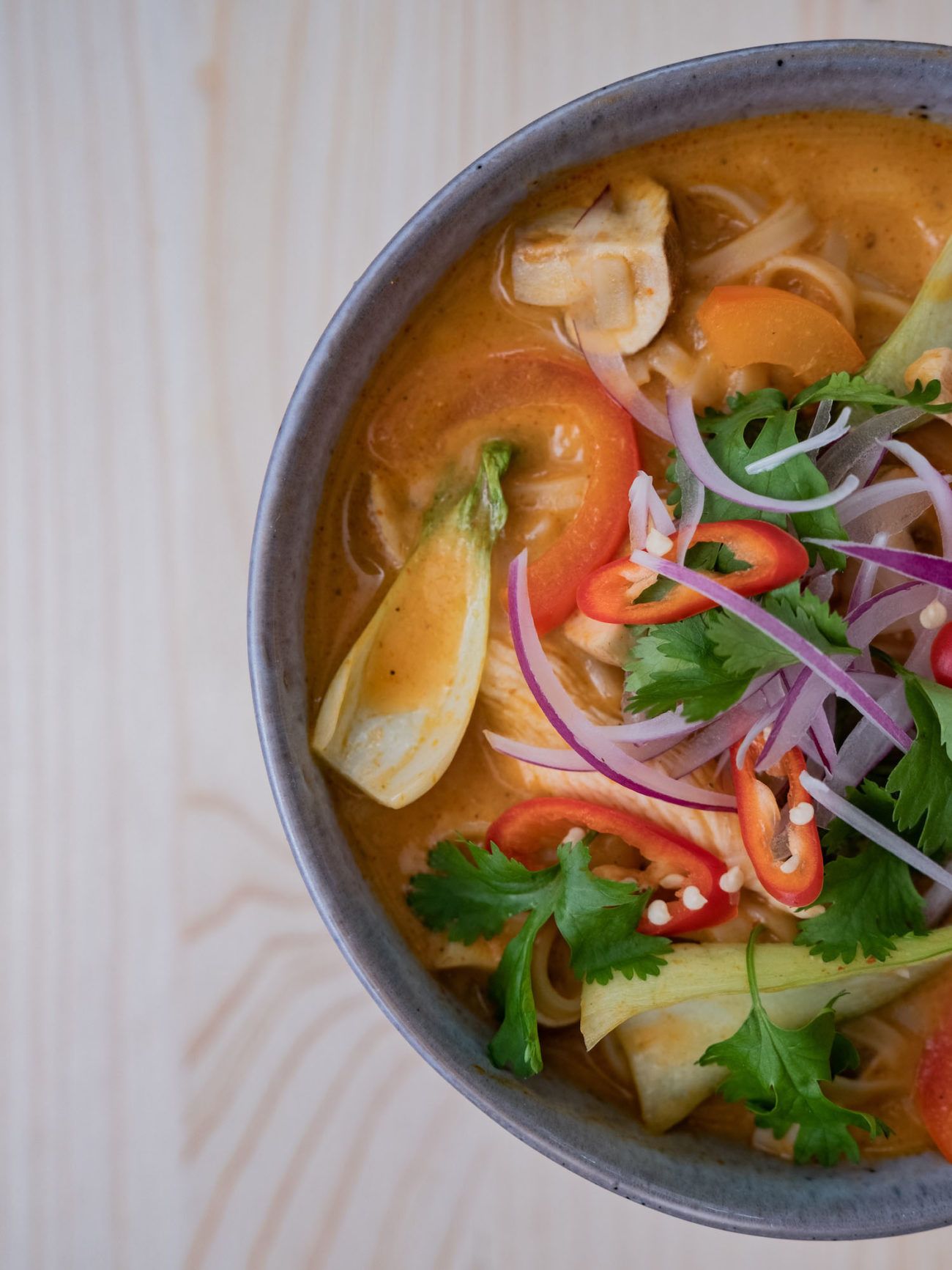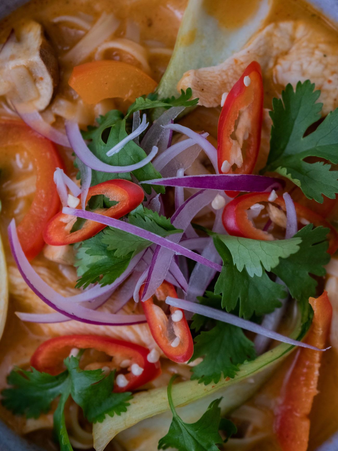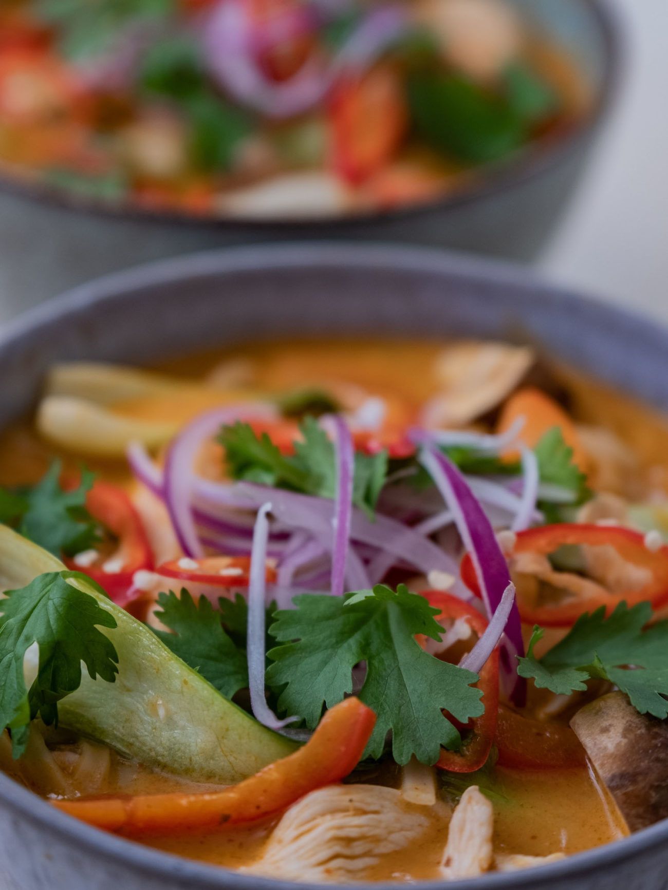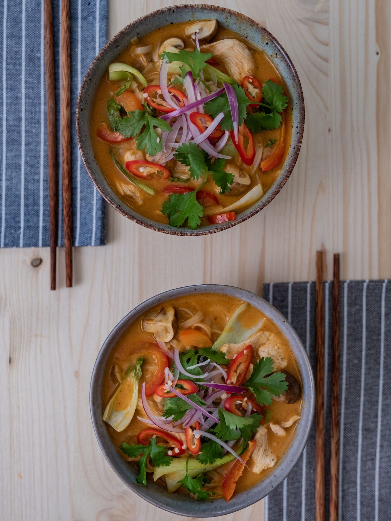Was gibt es Schöneres als eine Schüssel dampfende Suppe an einem kalten und nassen Herbsttag? Für mich zumindest nicht viel. Und da ich gerne auch mal ein wenig schärfer esse, habe ich heute eine scharfe Rote-Curry-Suppe mit Hühnchen und Reisnudeln kreiert. Die Suppe wärmt Euch so richtig durch und hinterlässt ein wohlig warmes Gefühl von Zufriedenheit. Bevor Ihr nun also kalte Füße bekommt, schwingt das Messer und den Kochlöffel und braut Euch ein leckeres Süppchen.