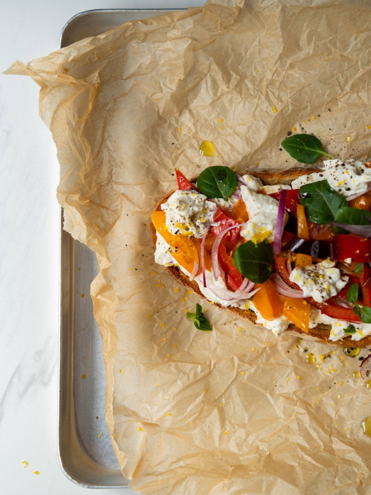 - Im nächsten Schritt das Brot aus dem Ofen holen, mit dem Großteil der Ricottacreme bestreichen, die Paprikastücke darauf verteilen und dann den Rest der Ricottacreme darüber klecksen.