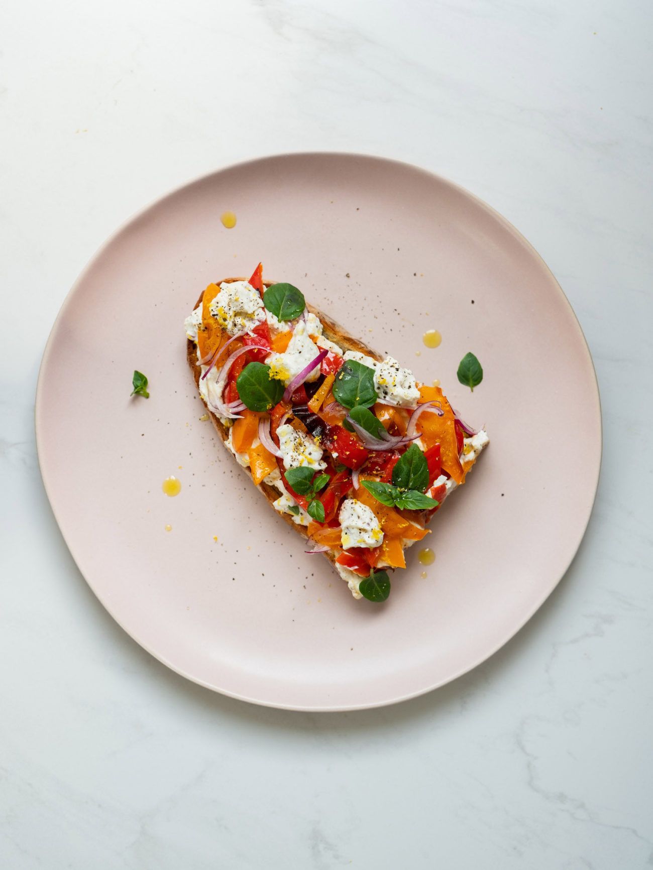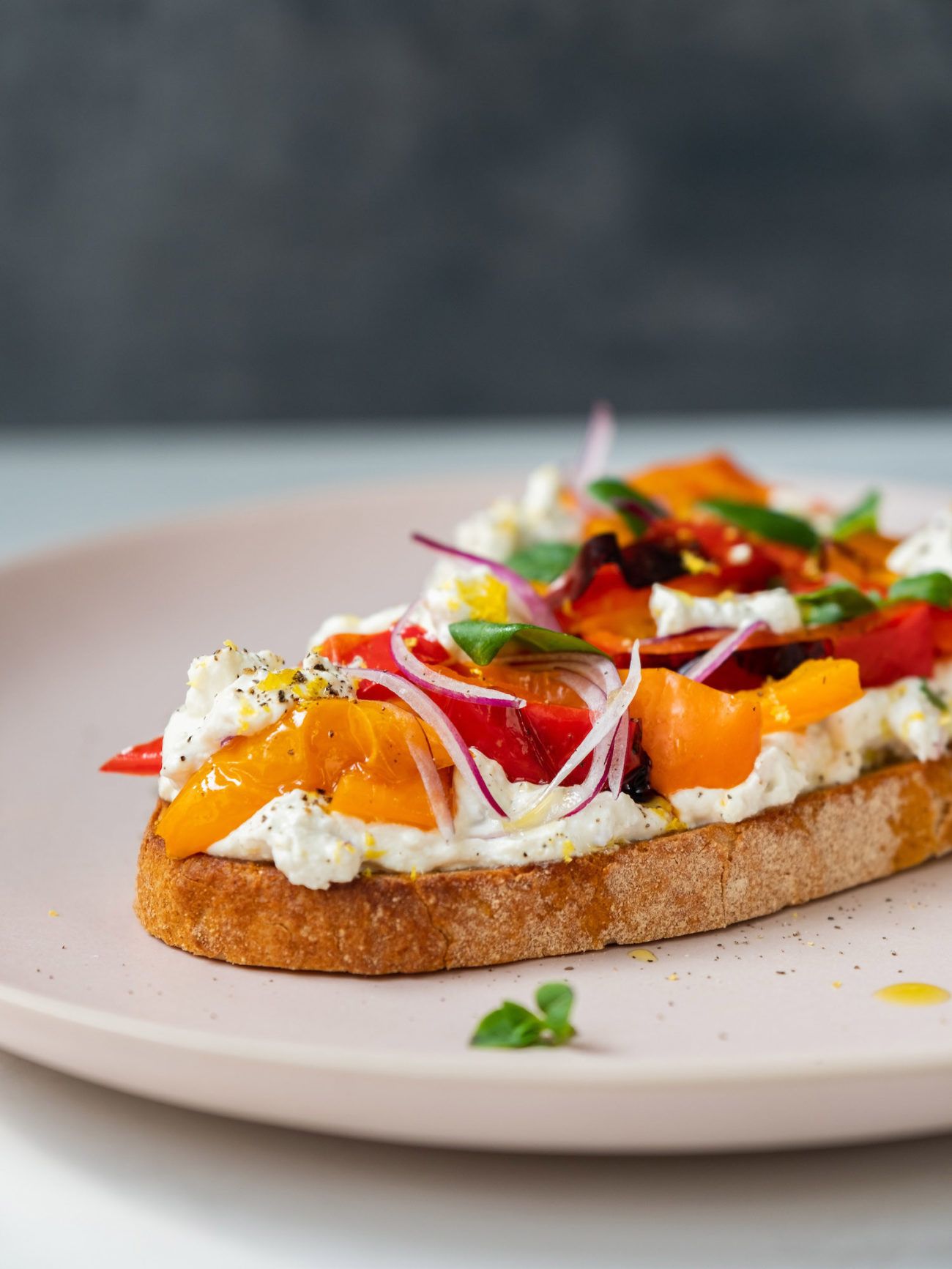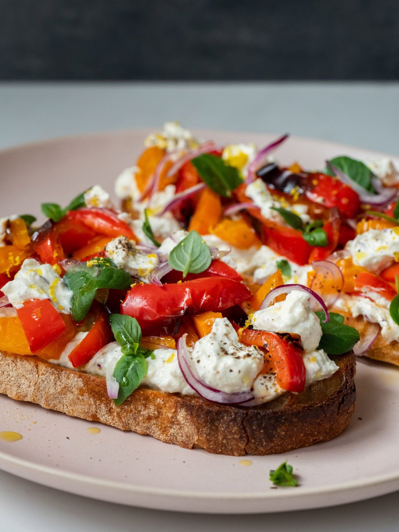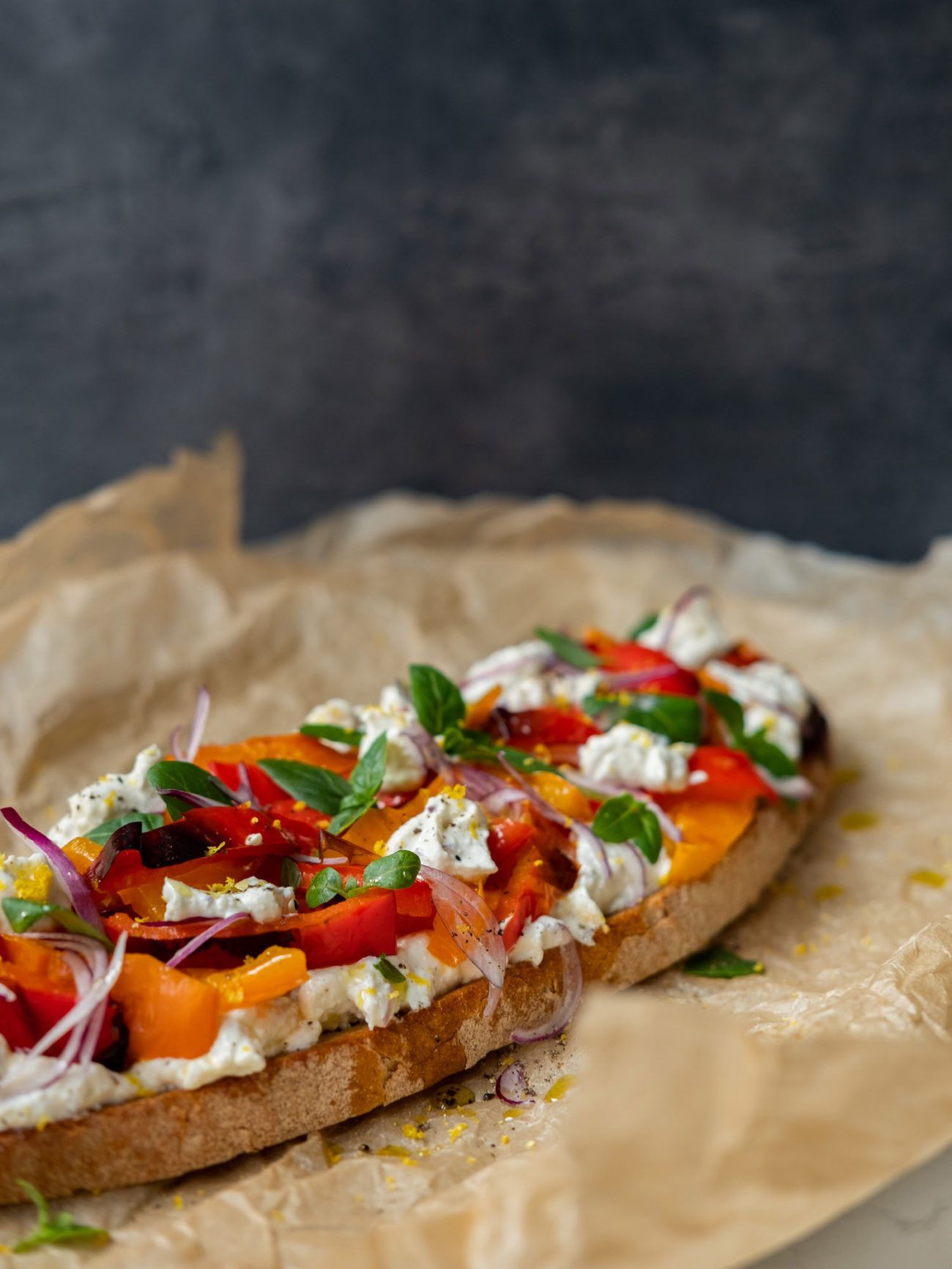 Wer meint, belegte Brote sind langweilig und kein richtiges Essen, könnte falscher nicht liegen oder hat noch nie ein Open Face Sandwich mit Zitronenricotta und gegrillter Paprika versucht. Der cremige Ricotta mit Zitronenschale und Zitronensaft, sowie Knoblauch und Zwiebelwürfel bilden auf dem knusprigen Brot eine würzige und cremige Grundlage für die süßen und leicht rauchigen Paprikastücke. Gekrönt wird alles, wie sollte es anders sein, von aromatischem Basilikum und Zitronenabrieb. Wer dieses Meisterwerk probiert hat, wird hoffentlich ein anderes und besseres Bild von belegten Broten bekommen. Viel Spaß beim nach Nachkochen und Genießen!
