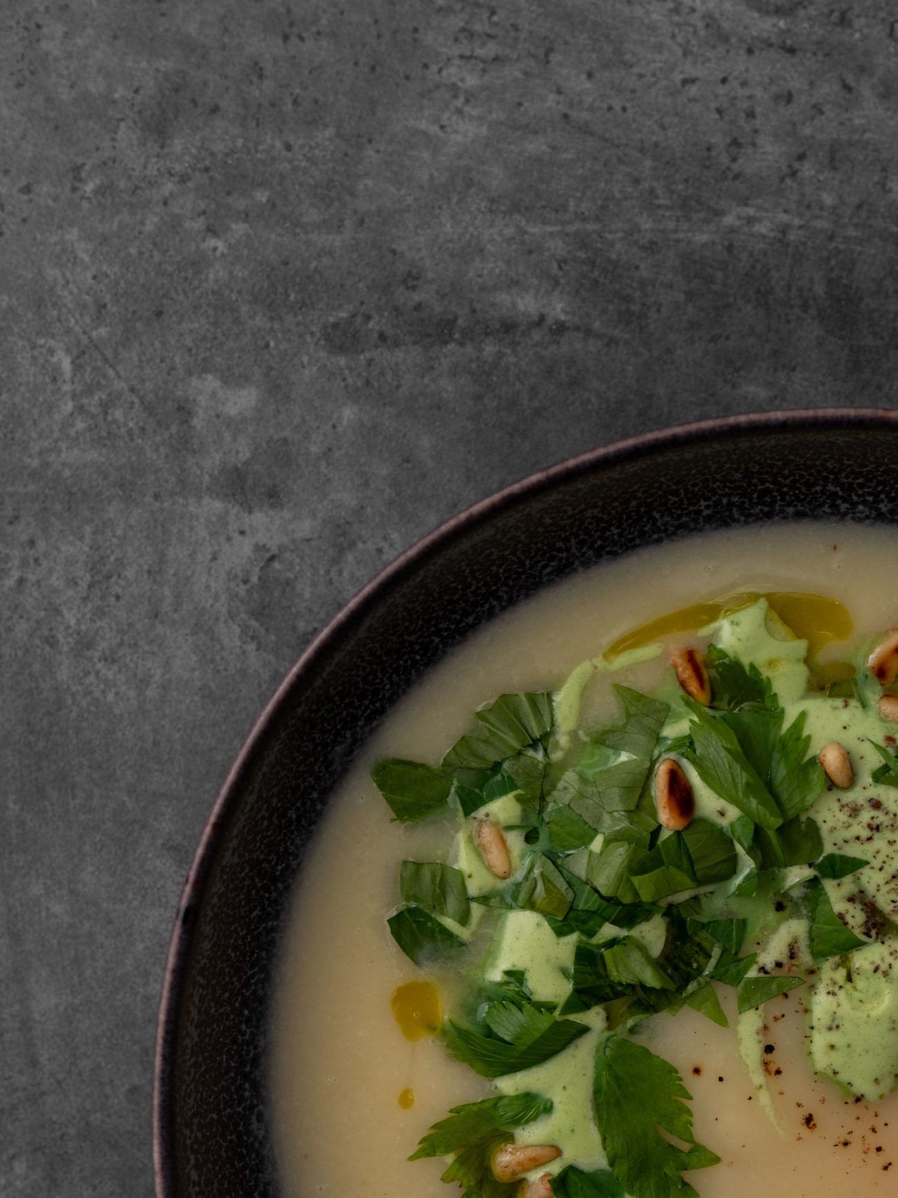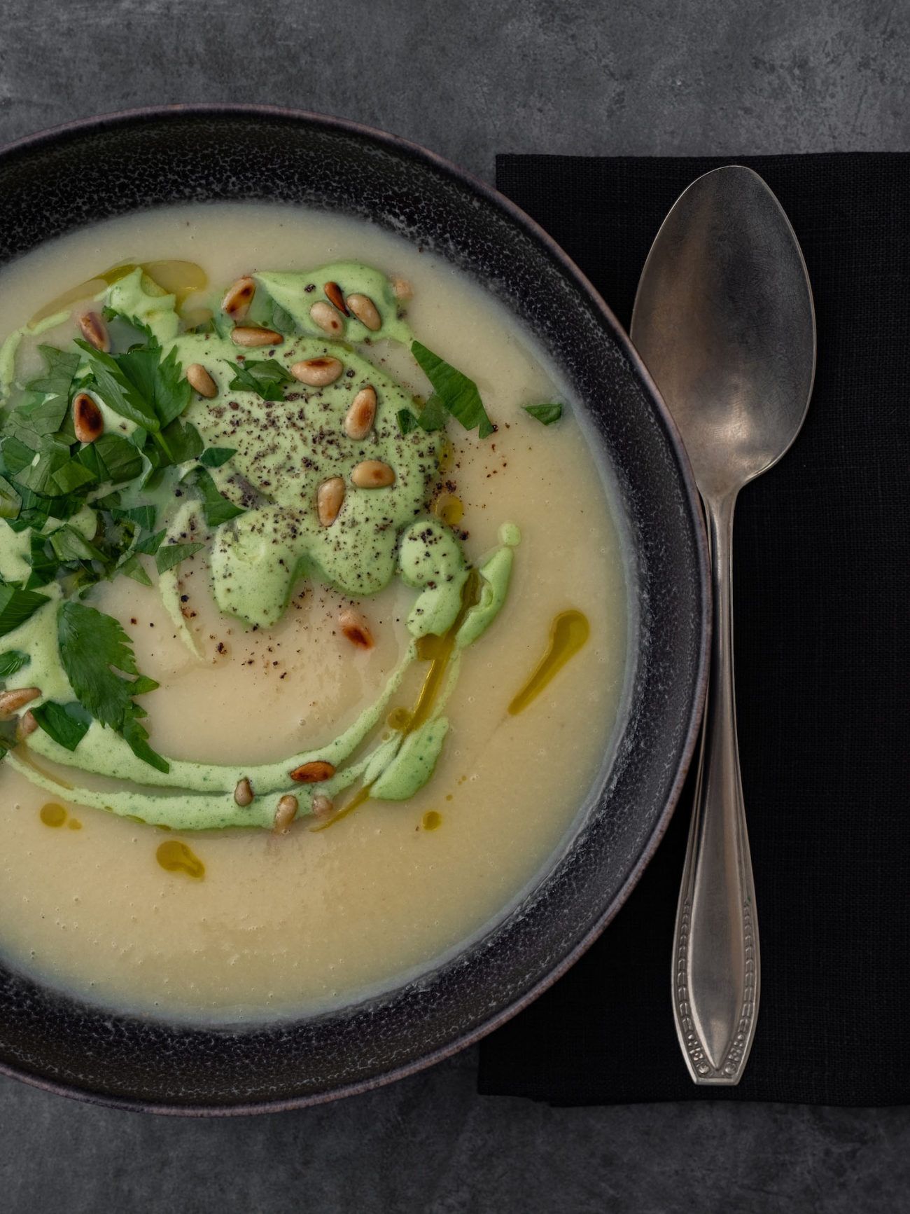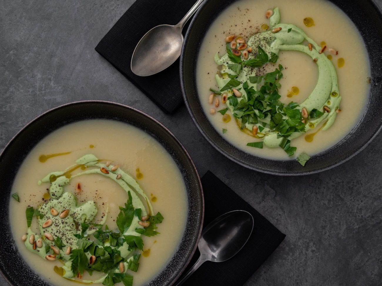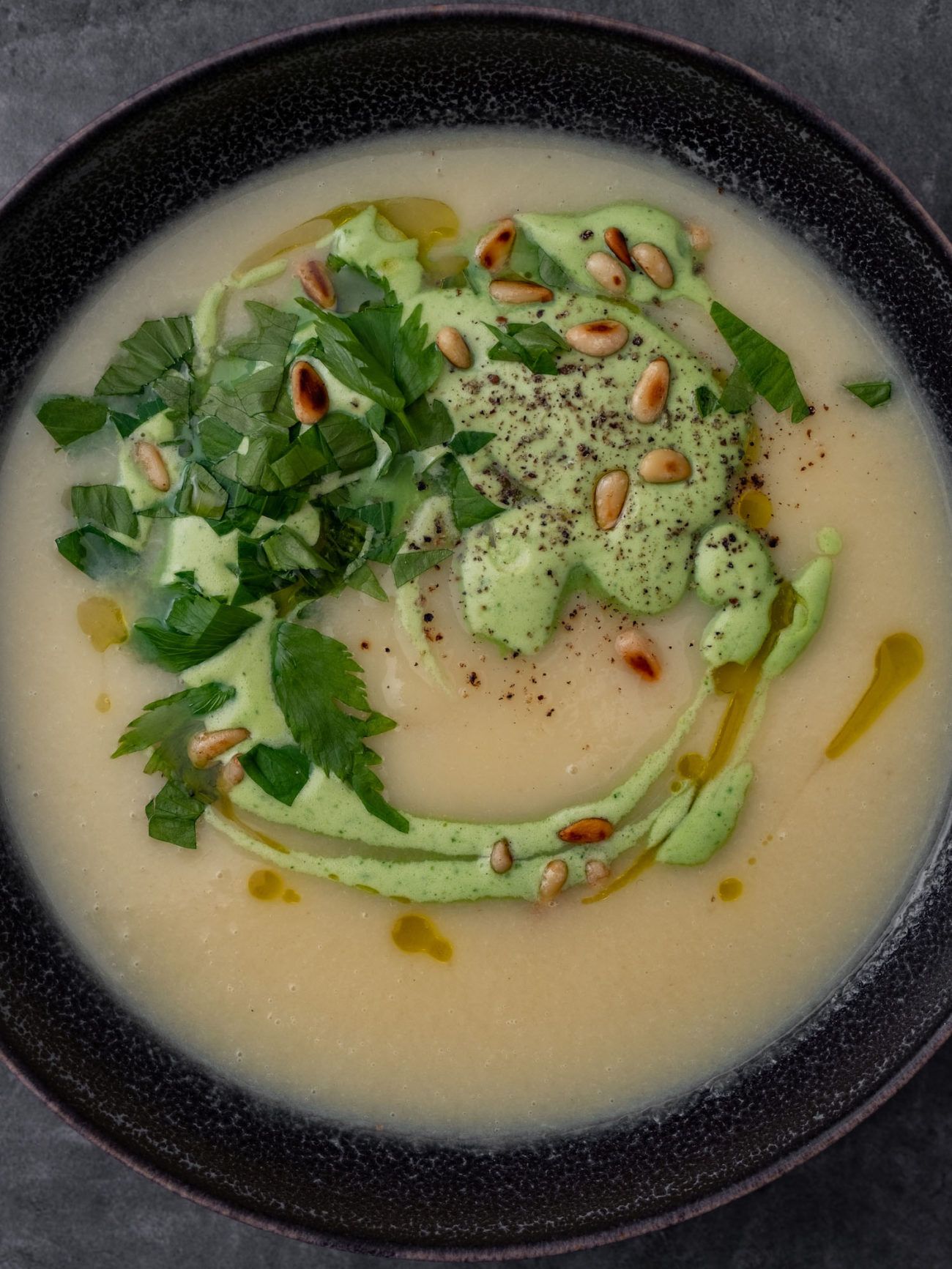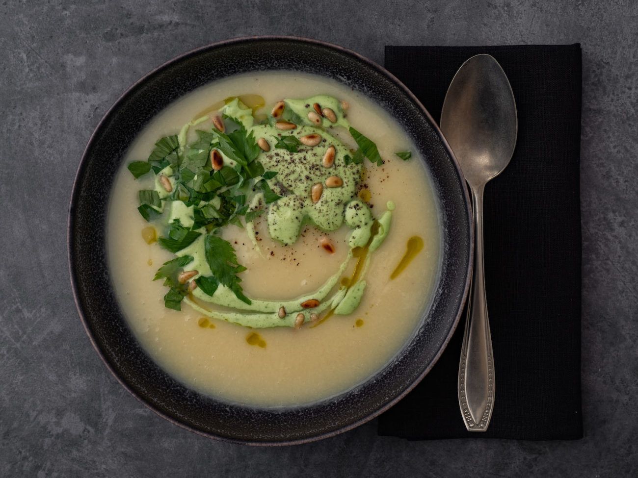- Und zum Schluss mit ein wenig gehacktem Liebstöckel, den Pinienkernen und etwas Olivenöl garnieren.