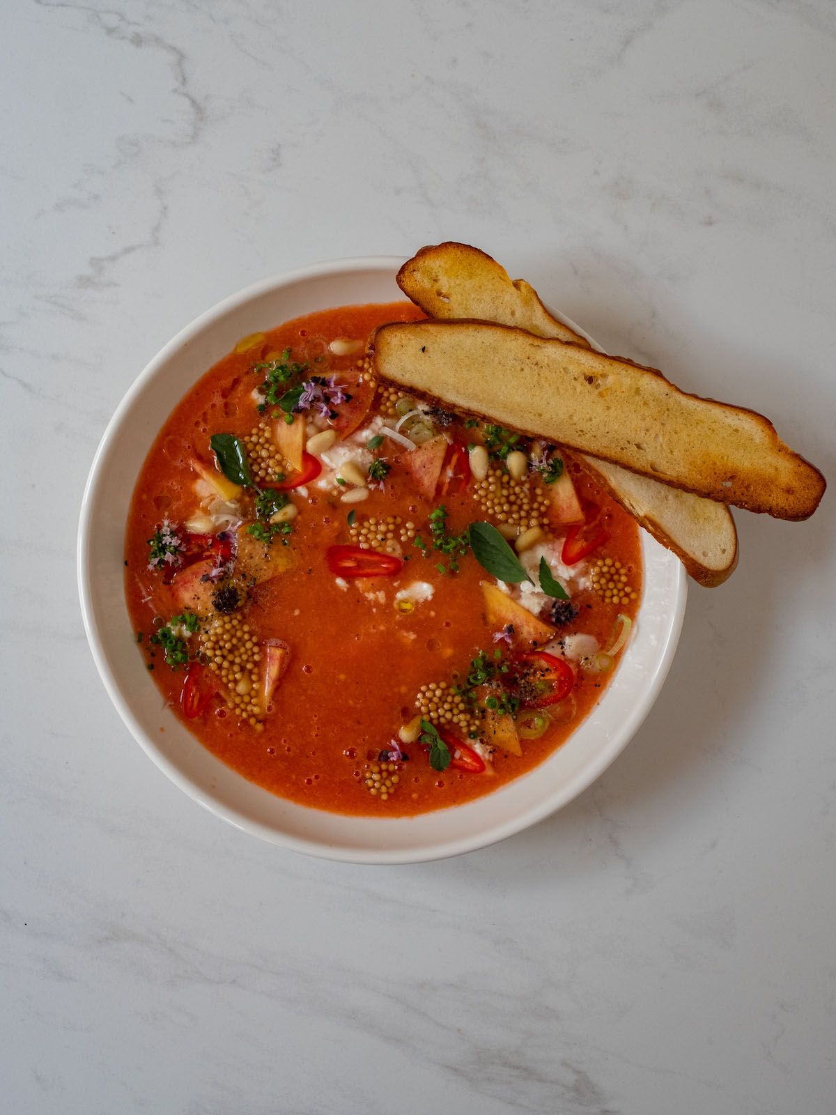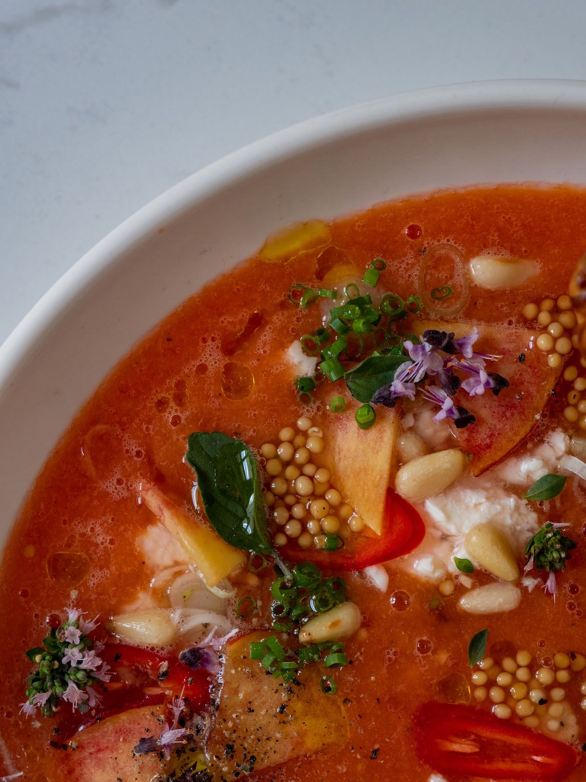 Pfirsich Gazpacho mit Laugenstangenchips, Feta und Chili