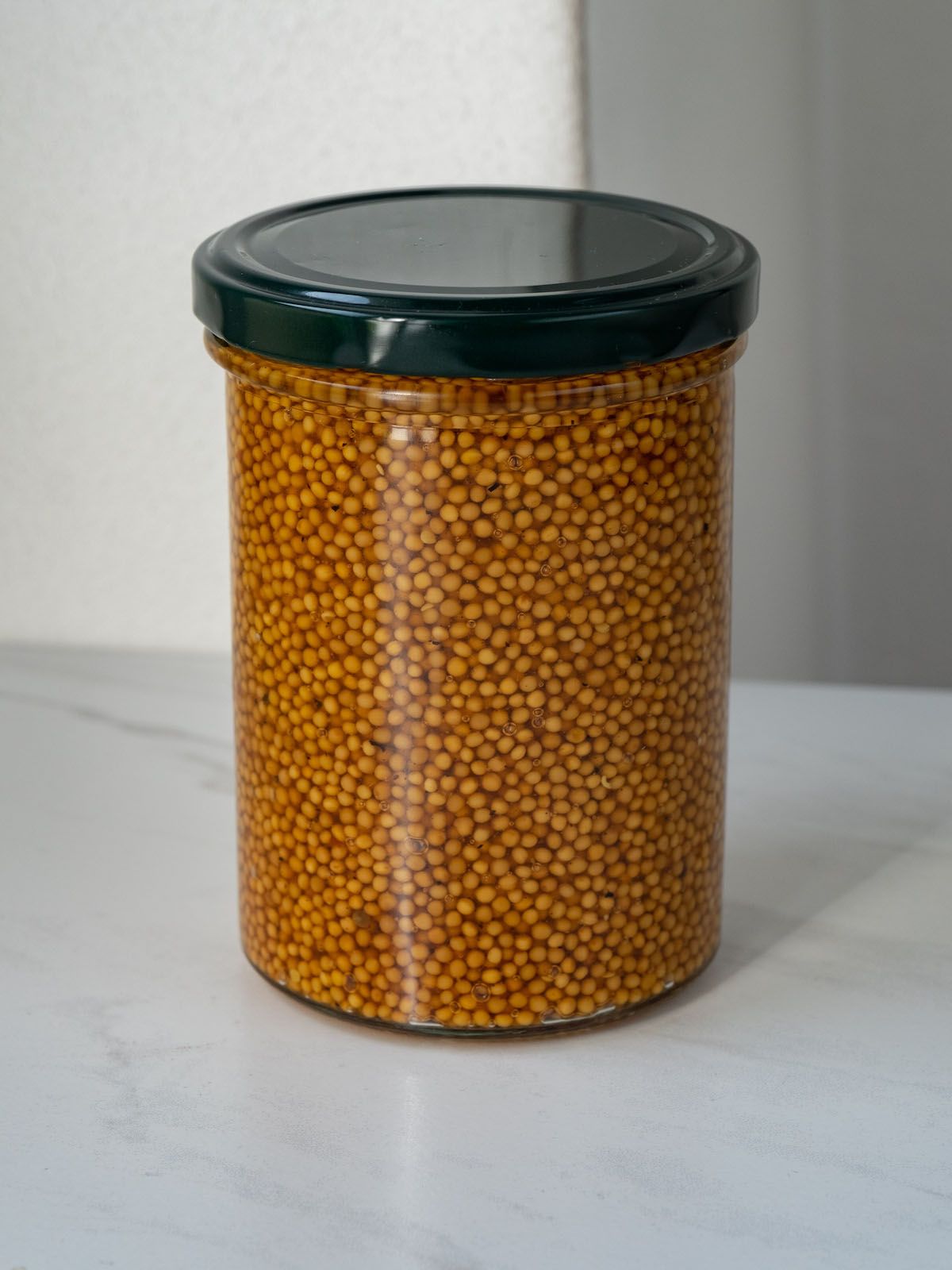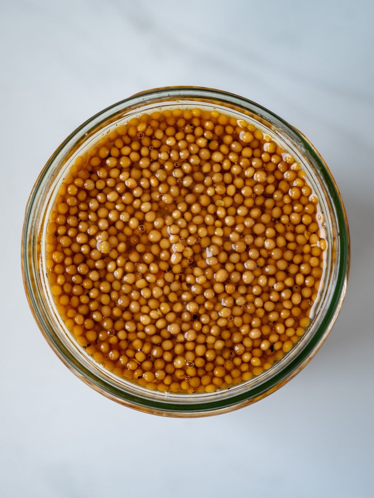 - Jetzt den Topfinhalt in das Glas geben und darauf achten, dass noch etwas Platz bis zum Rand ist, da sich die Senfkörner noch vollsaugen und ausdehnen.