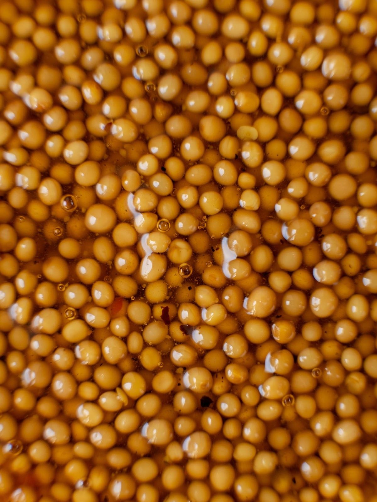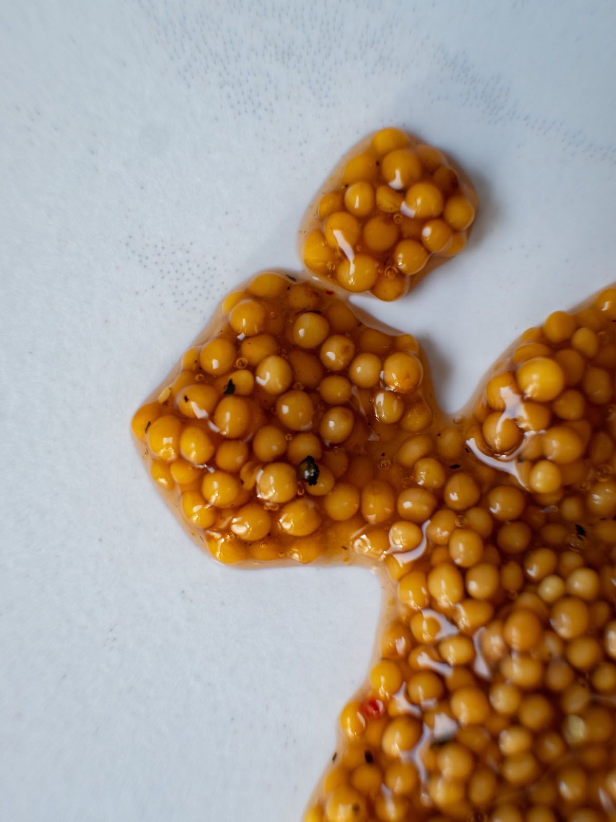 Es gibt bei mir immer wieder kulinarische Neuentdeckungen, die man eigentlich schon lange auf dem Schirm hätte haben können. So ging es mir zum Beispiel mit Senfkaviar. Vor einigen Monaten war ich zu Besuch bei meinem Bruder. Seine Freundin stellte auf einmal dieses Glas gefüllt mit kleinen, gelben Kügelchen auf den Tisch. Irgendwie kam es mir bekannt vor, aber ich wusste, ich hatte noch nie davon probiert. Nachdem mir der Senfkaviar vorgestellt und angepriesen wurde, brauchte es wenige Sekunden und einen Bissen und ich war verliebt. Süß, sauer, knackig und einfach unglaublich lecker.