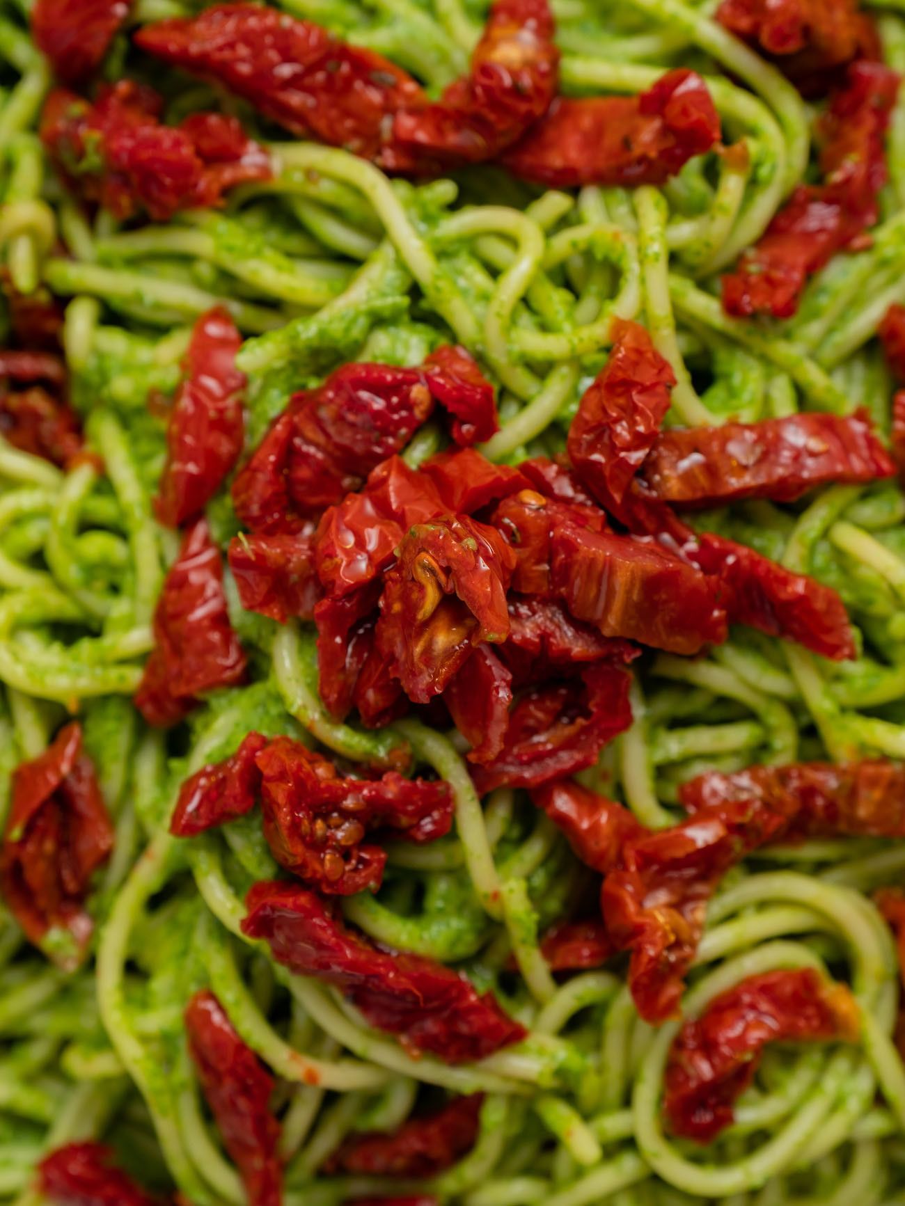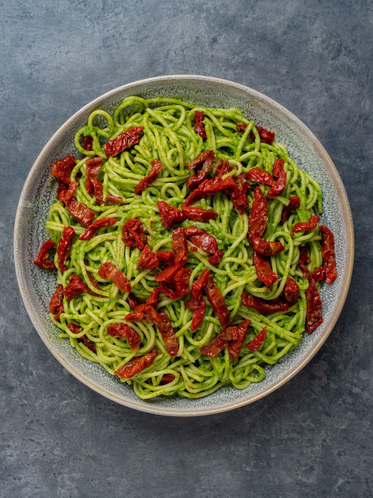 So sehr ich klassische Pasta mit Tomatensoße auch liebe, habe ich auch immer wieder meine Freude daran, neue und gewagtere Kombinationen auszuprobieren. Wie zum Beispiel bei diesem Rezept für Spaghetti mit Avocado-Rucola-Pesto und getrockneten Tomaten. Es ist zwar ähnlich einfach und schnell herzustellen wie die Variante mit Tomatensoße und ist meiner Meinung nach auch genauso lecker, geht aber natürlich geschmacklich in eine ganz andere Richtung. Allen, die wagemutig genug sind und sich auf die besondere Kombination einlassen, wünsche ich viel Spaß beim Kochen und später natürlich beim Genießen!
