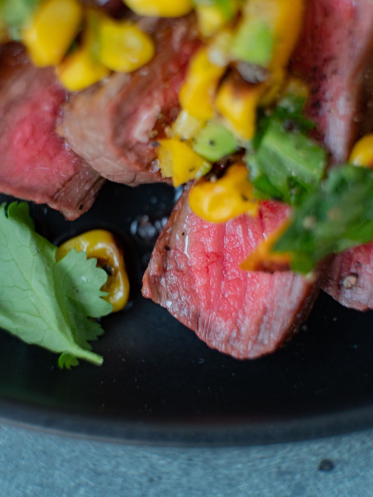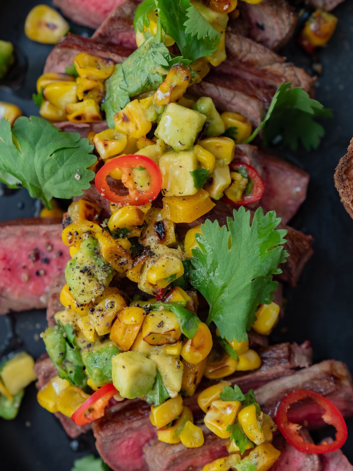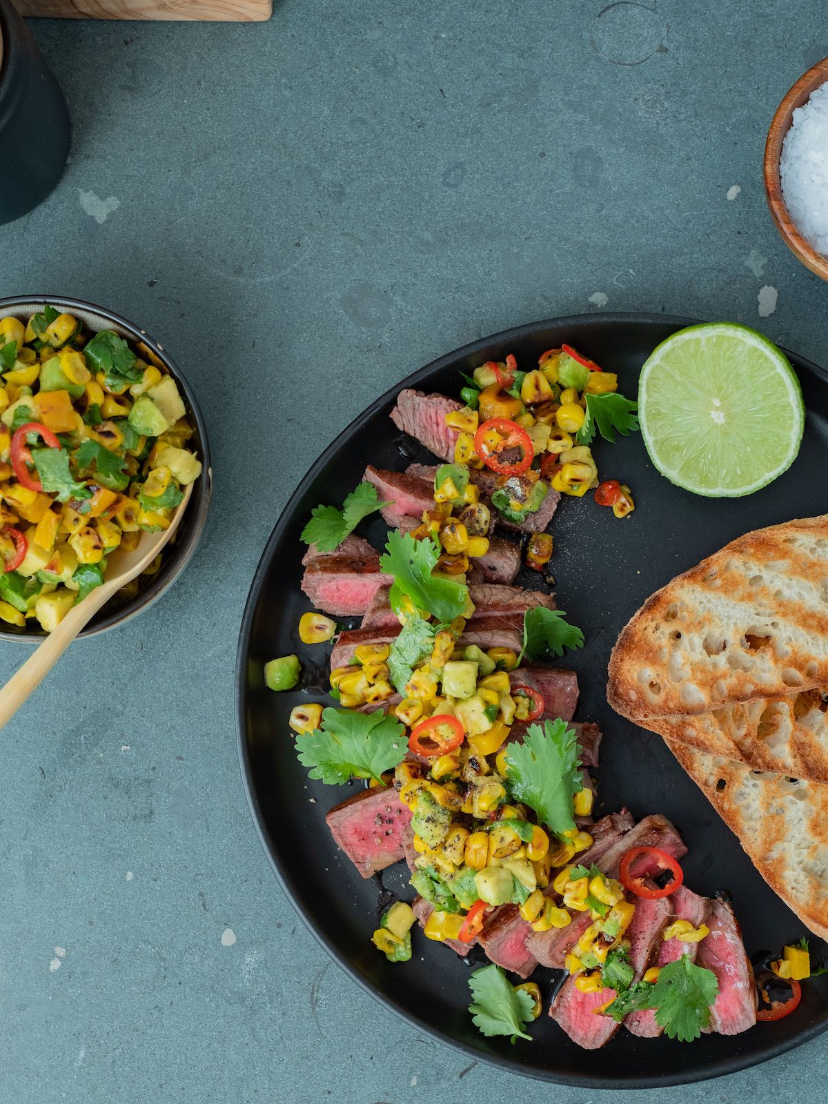 - Als nächstes die Steaks aufschneiden und auf zwei Tellern platzieren. Etwas Corn-Salsa darüber geben und das gegrillte Brot daneben platzieren.