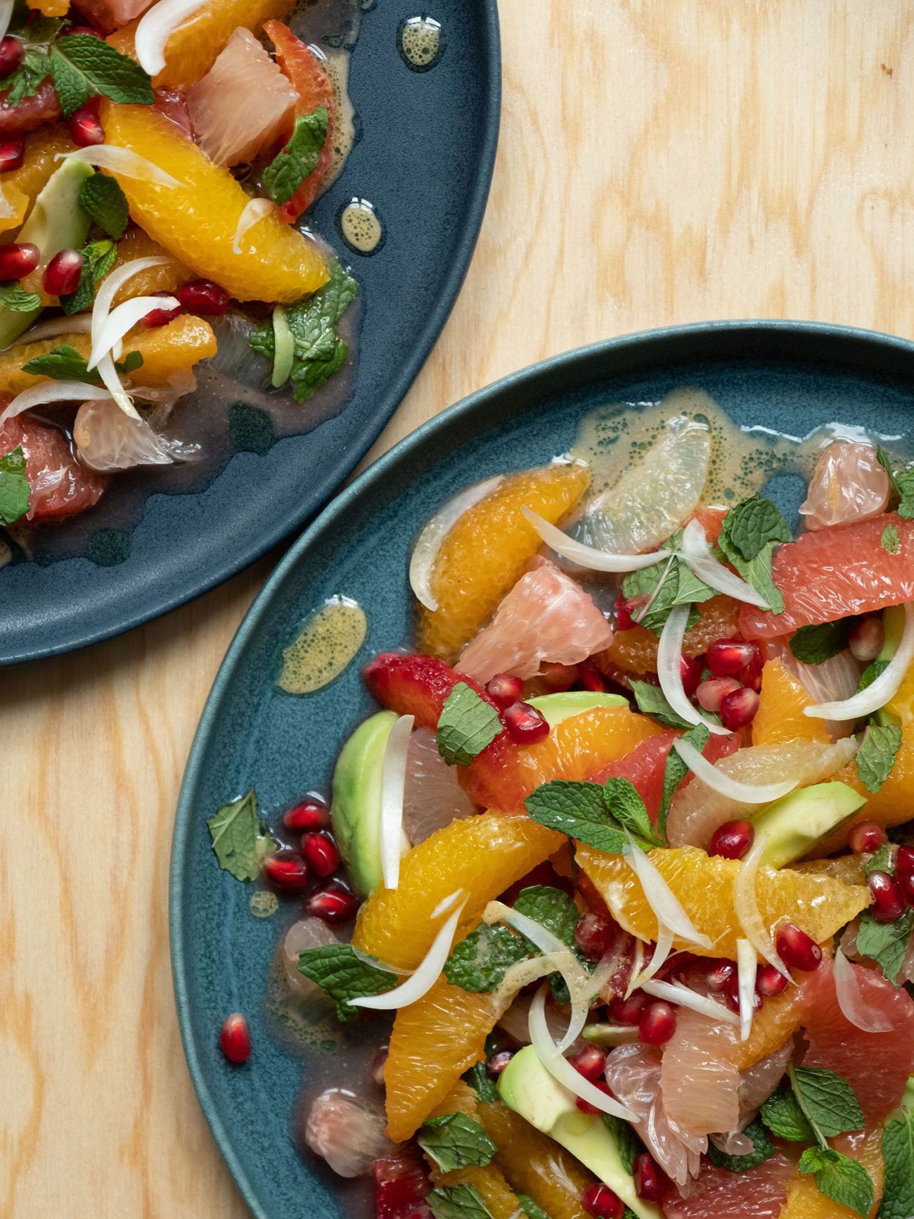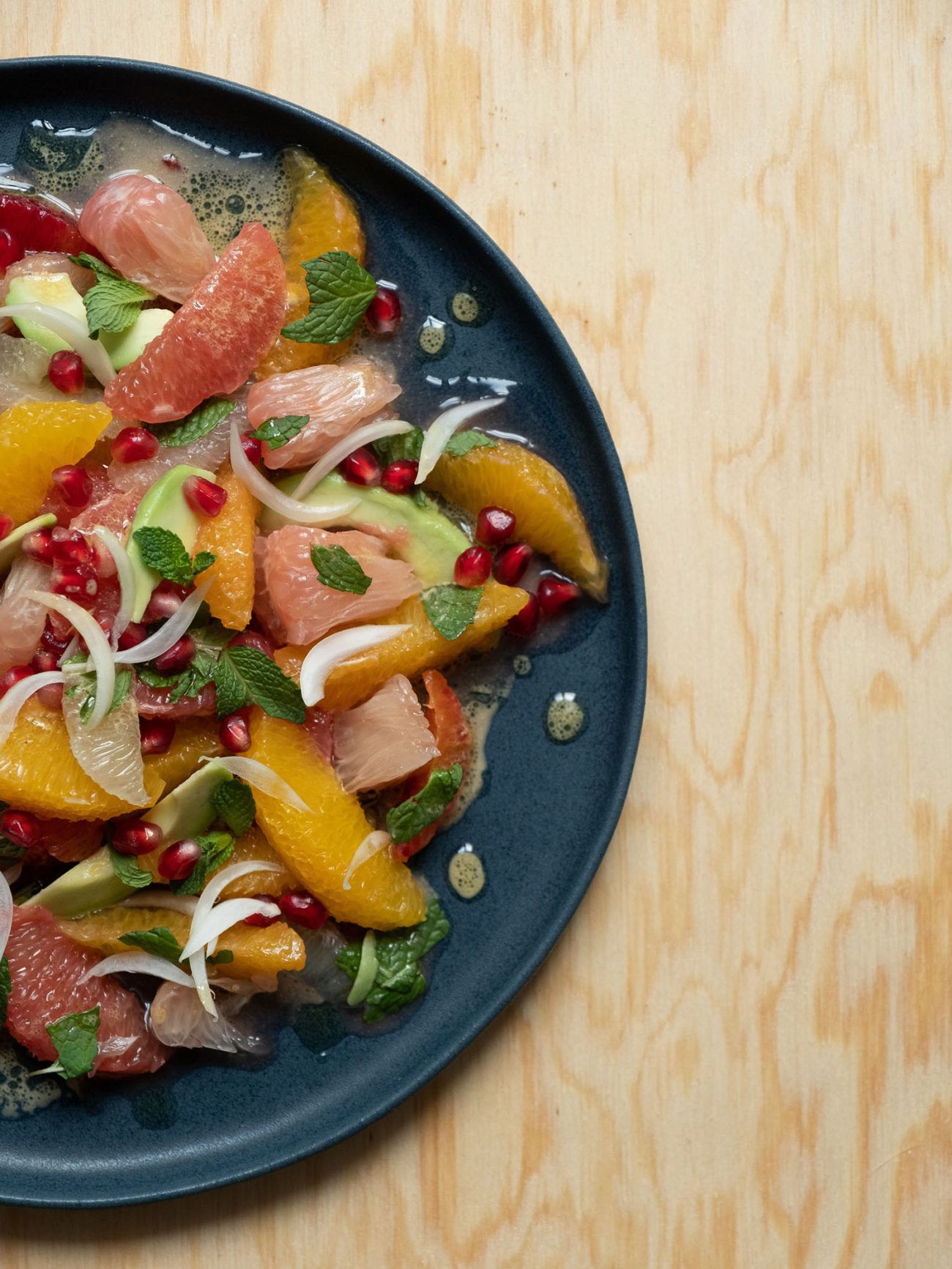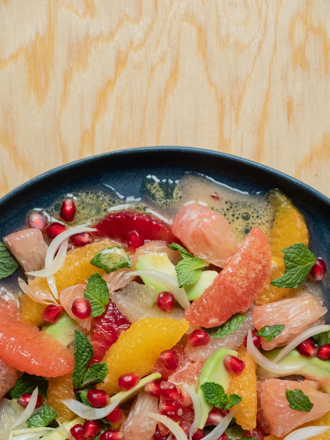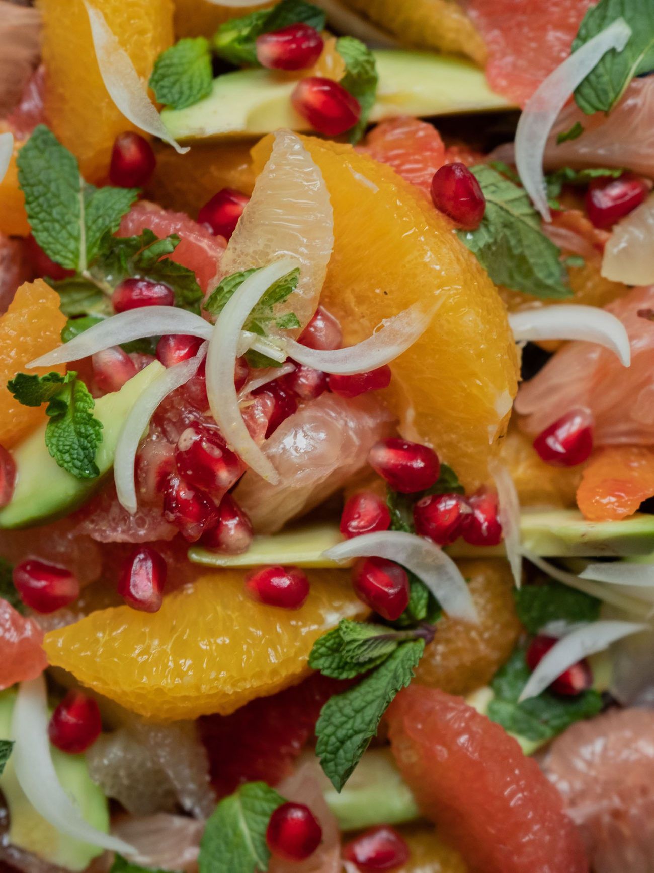 Jetzt aber zum ersten Rezept in diesem Jahr. Und um dir einen besonders frischen, gesunden, leichten und vitaminreichen Jahresstart zu bereiten, habe ich mich entschieden, ein Rezept für einen Zitrussalat zu entwickeln. Neben allerlei wohlschmeckenden und super gesunden Früchten habe ich mich außerdem für Avocado als weitere Zutat entschieden, um eine cremige Komponente, für Granatapfel Kerne, um eine knusprige Komponente, und für Minze, um eine frische Komponente in das Gericht zu integrieren. Um dem Salatdressing auch das gewisse Etwas zu verleihen, fiel die Wahl auf Pistazie. Mir gefällt die Kombination der Zutaten super. Ich hoffe, dir geht es genauso! Probiere es am besten aus und lass mich gerne wissen, wie es dir geschmeckt hat.