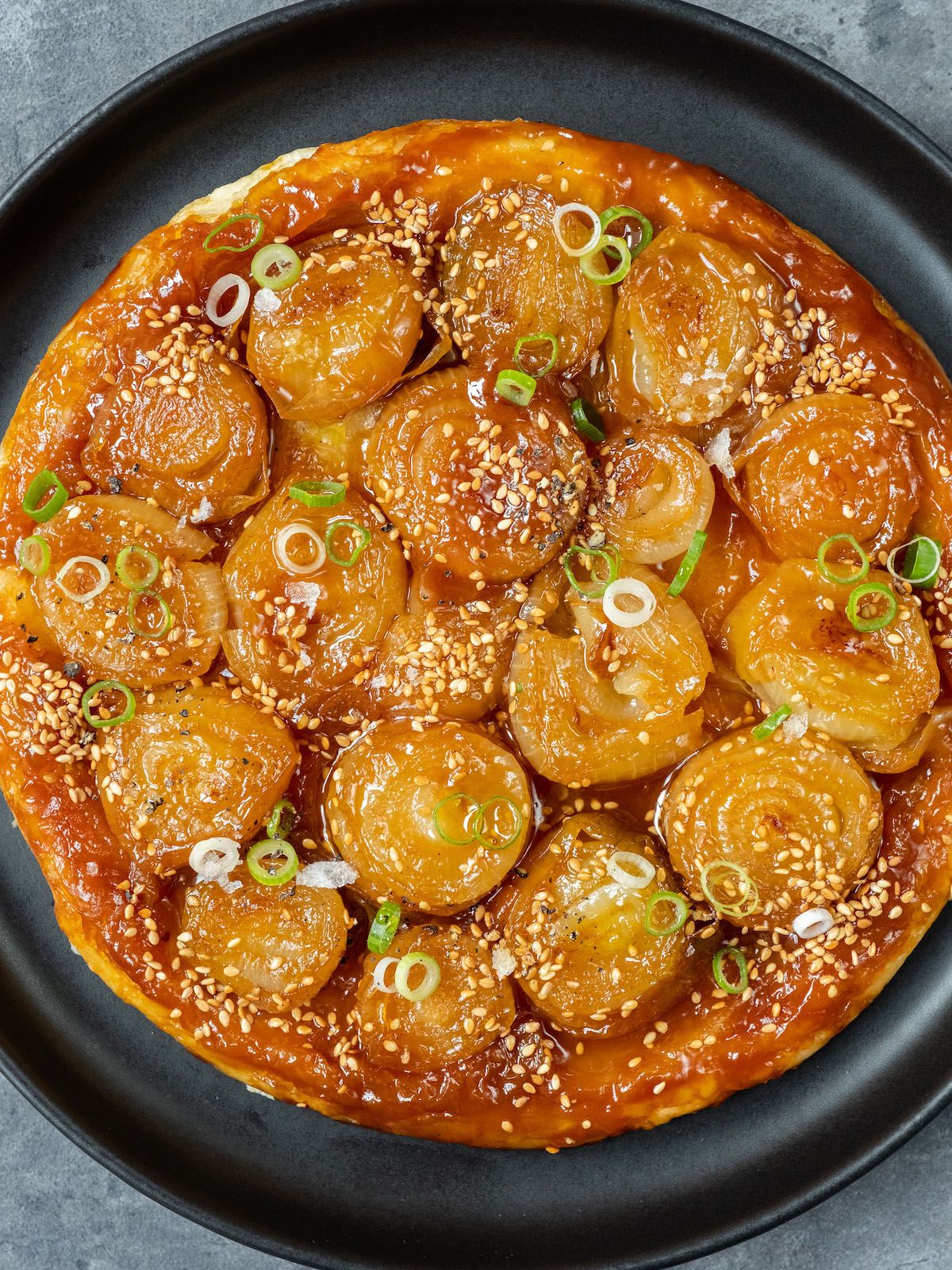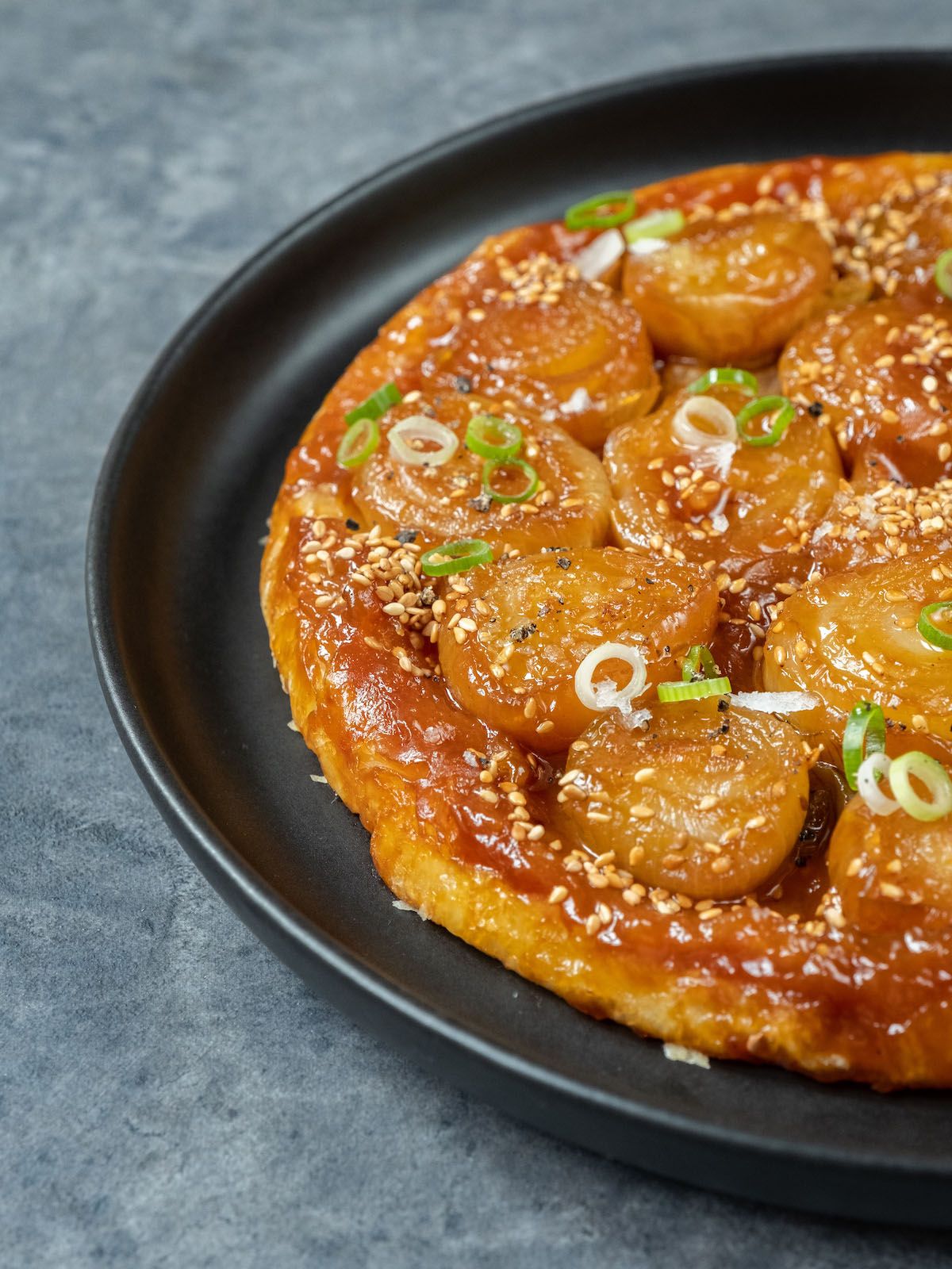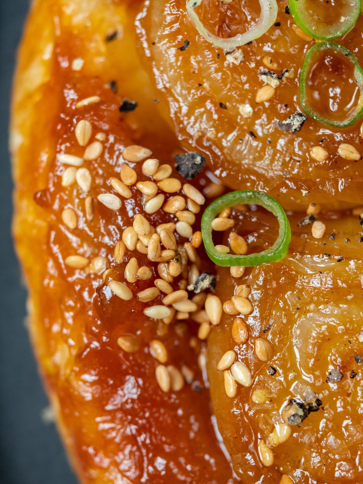 - Im nächsten und letzten Schritt den Sesam und die Frühlingszwiebelringe auf der Tarte verteilen, frisch gemahlenen schwarzen Pfeffer darauf geben und fertig ist der süß-salzig und klebrige Leckerbissen.