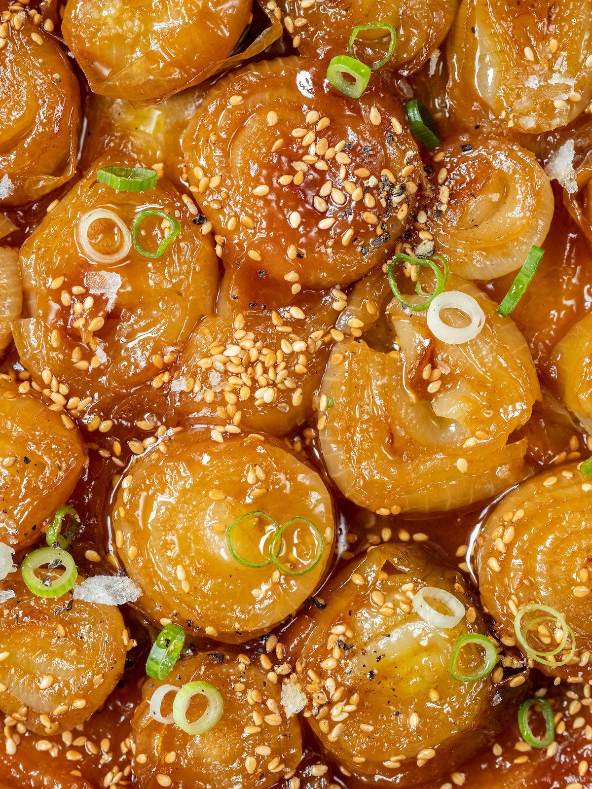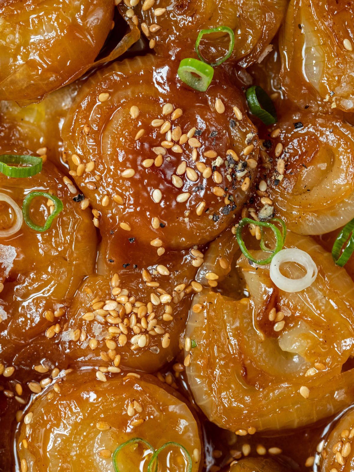 - Als Nächstes die Zwiebelhälften wieder in die Pfanne geben, im Miso-Karamell schwenken und für weitere fünf Minuten weitergaren.