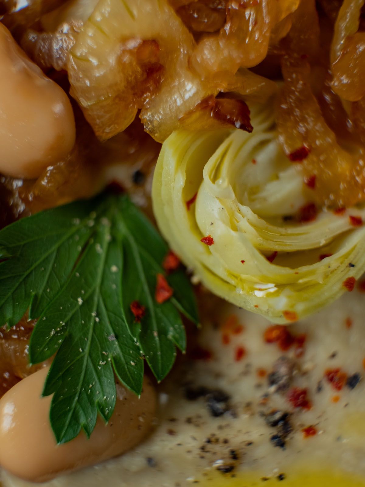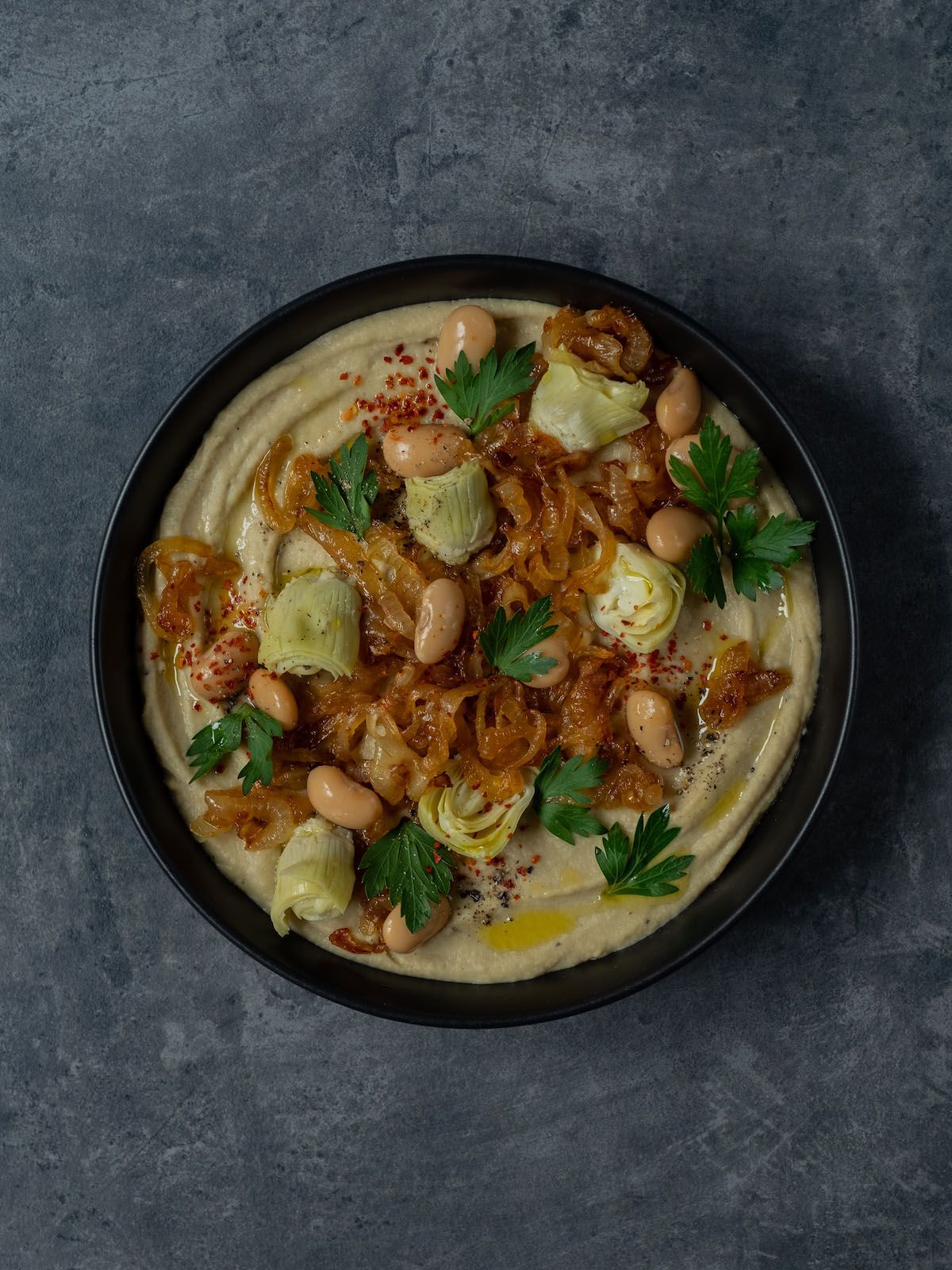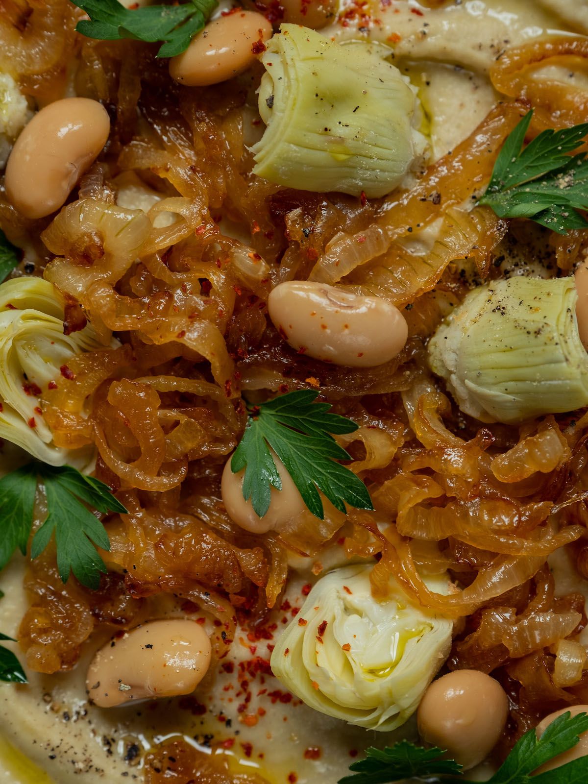 - Im nächsten Schritt, die zur Seite gelegten Zwiebeln sowie die übrig gebliebenen Artischocken und weißen Bohnen auf dem Dip anrichten und mit Olivenöl, Petersilie sowie frisch gemahlenem Pfeffer und Chiliflocken garnieren.