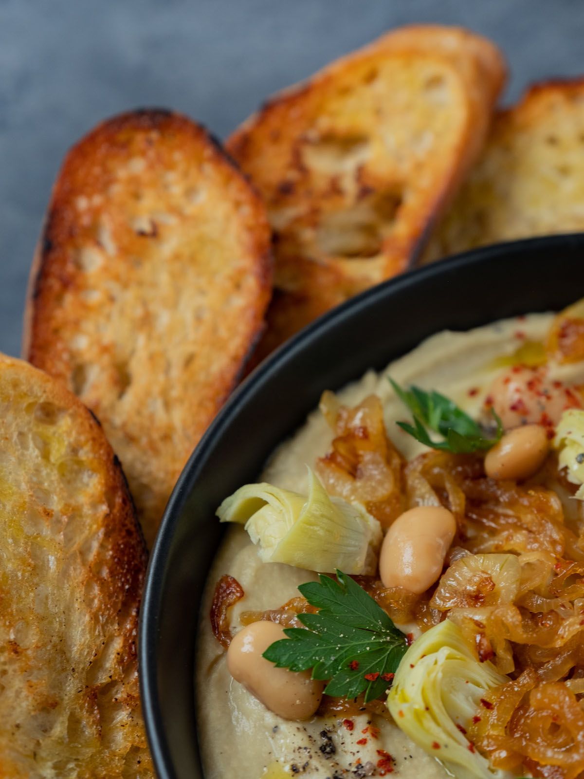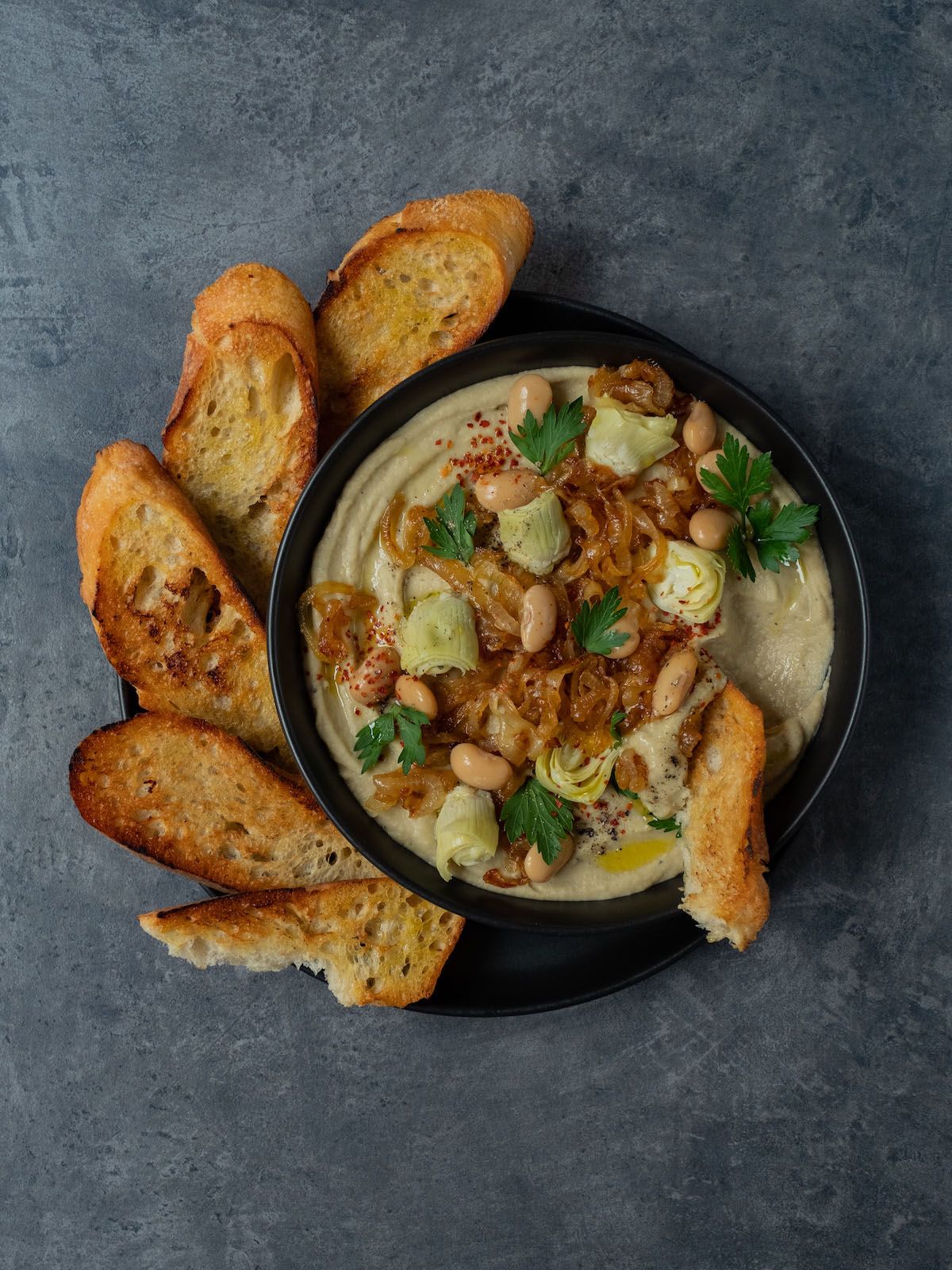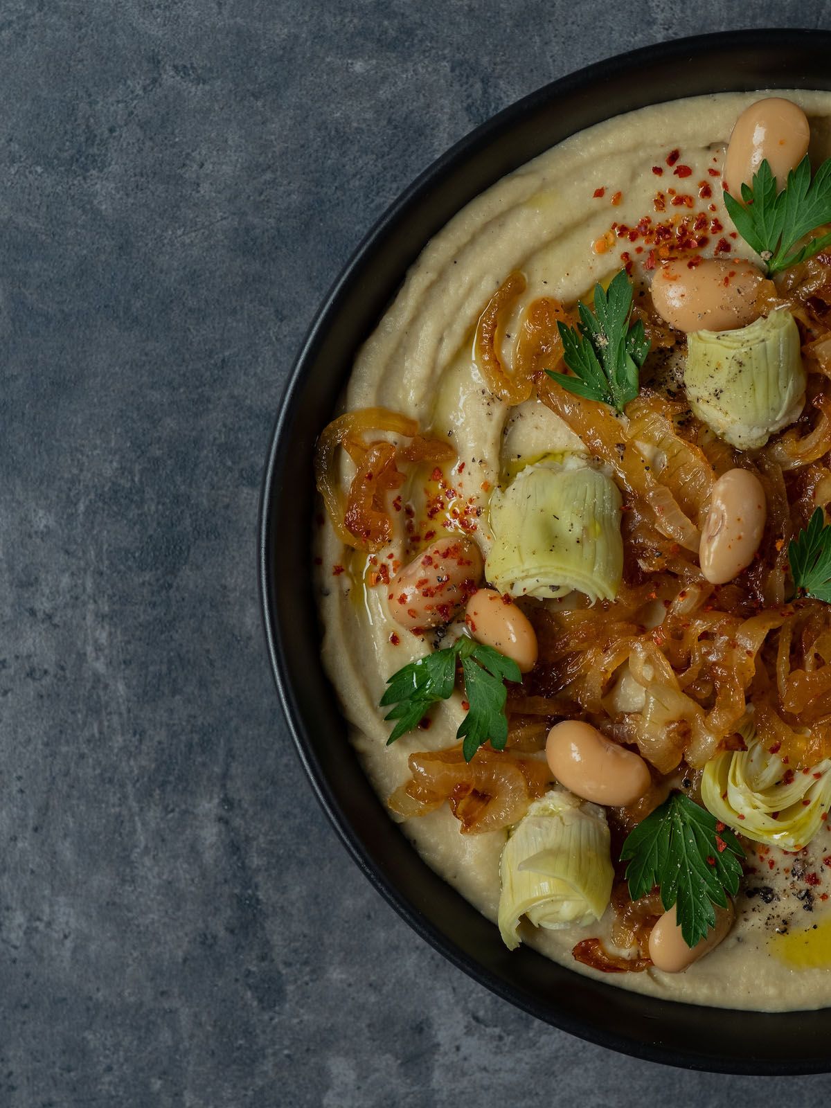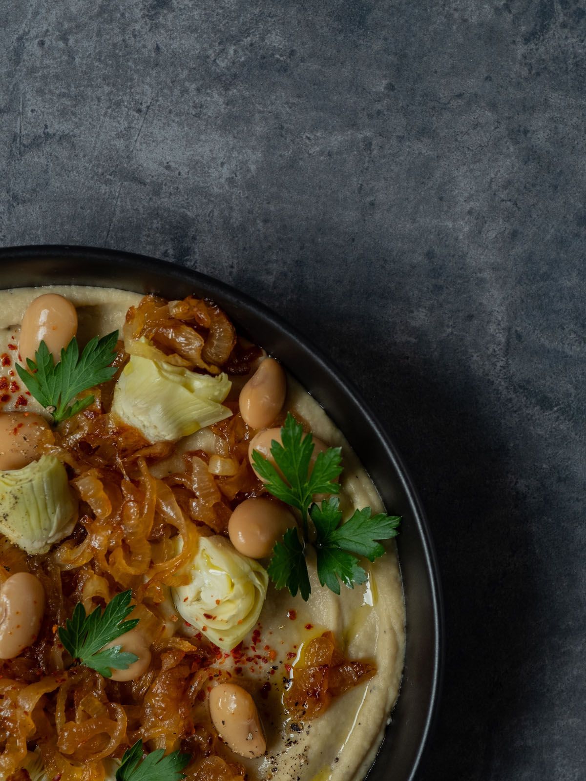 - Im nächsten Schritt, die zur Seite gelegten Zwiebeln sowie die übrig gebliebenen Artischocken und weißen Bohnen auf dem Dip anrichten und mit Olivenöl, Petersilie sowie frisch gemahlenem Pfeffer und Chiliflocken garnieren.